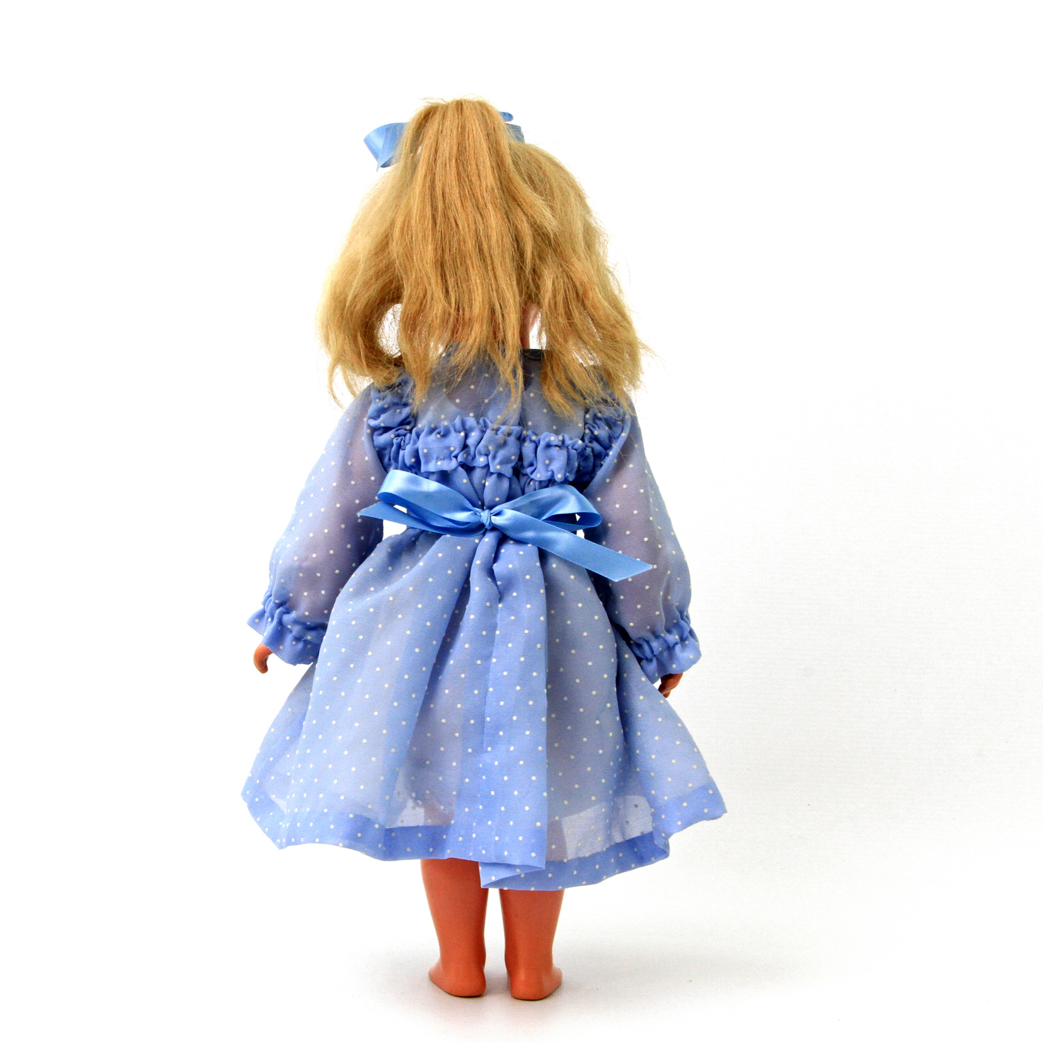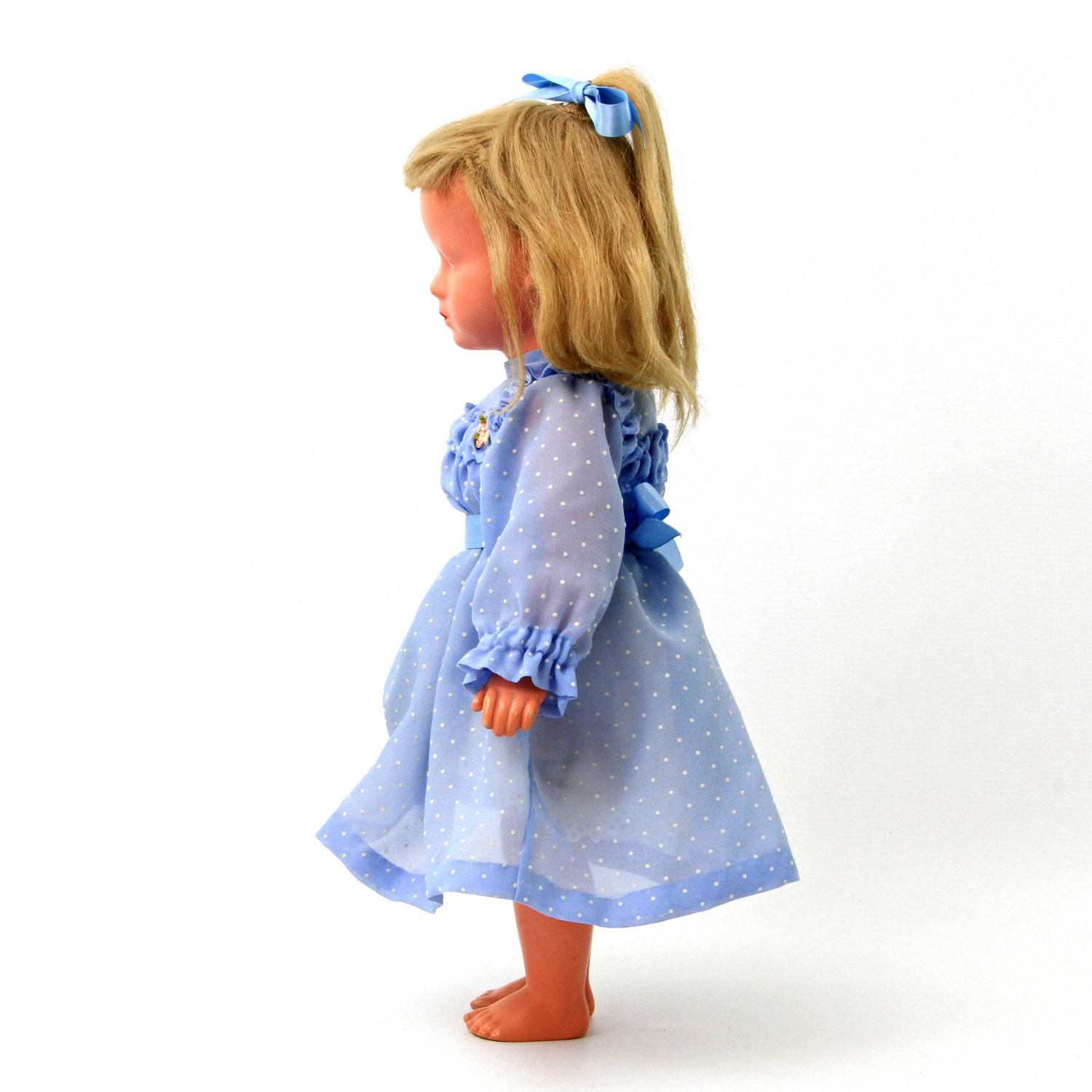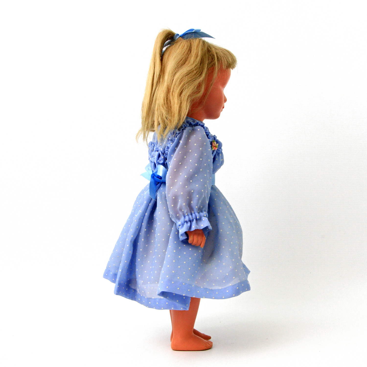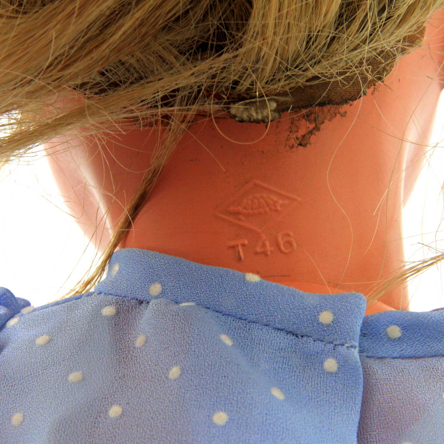 marked 'T 46', crank head, movable arms and legs, blond real hair, painted blue eyes. Light blue dress with white dots, underdress, underpants, light blue ribbon tied in a bow in the hair and around the waist. Tortulon, l. paint abrasion on hands, nose, crank head and arms, small hole in right thumb, h. 46 cm.
