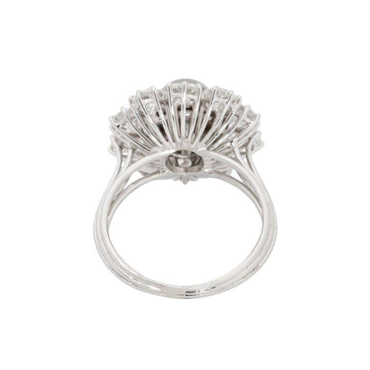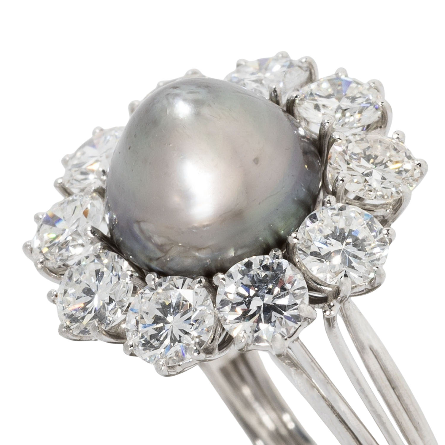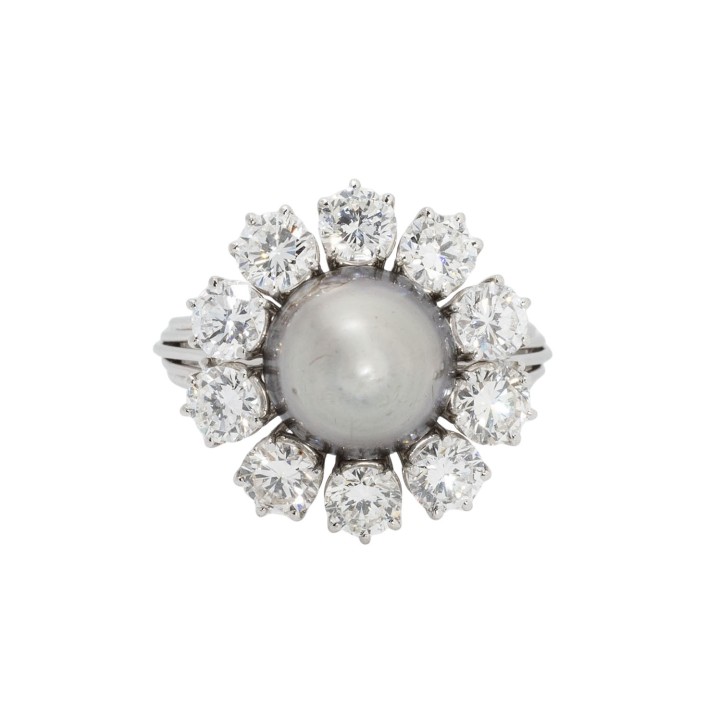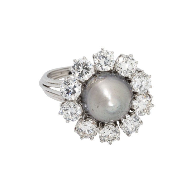 SCHILLING cocktail ring with a natural pearl surrounded by 10 brilliant-cut diamonds, totalling approx. 2.29 ct, RW-TW (F-K)/VS-SI, pearl: light gray, baroque shape, beautiful luster, with natural signs of growth, platinum, 7.1 g, ring size: 54, W: approx. 2.3 - 18.4 mm, around 1950/60, signs of wear, with hallmark 'SCHILLING', Stuttgart, handcrafted work, 1 stone chipped.