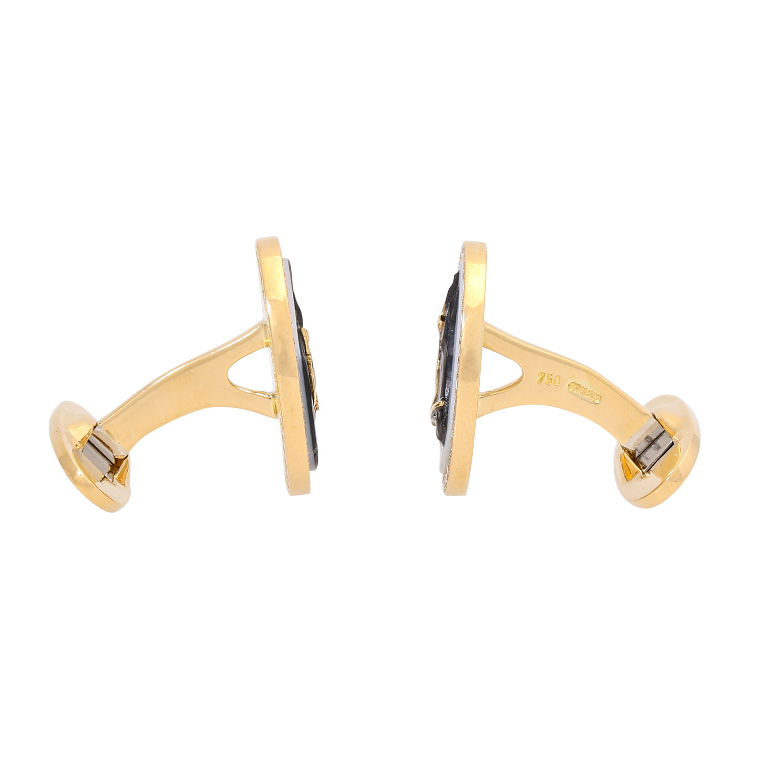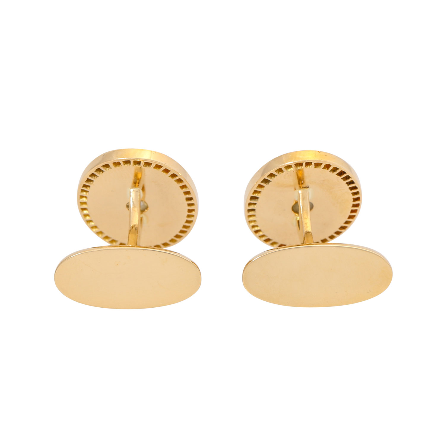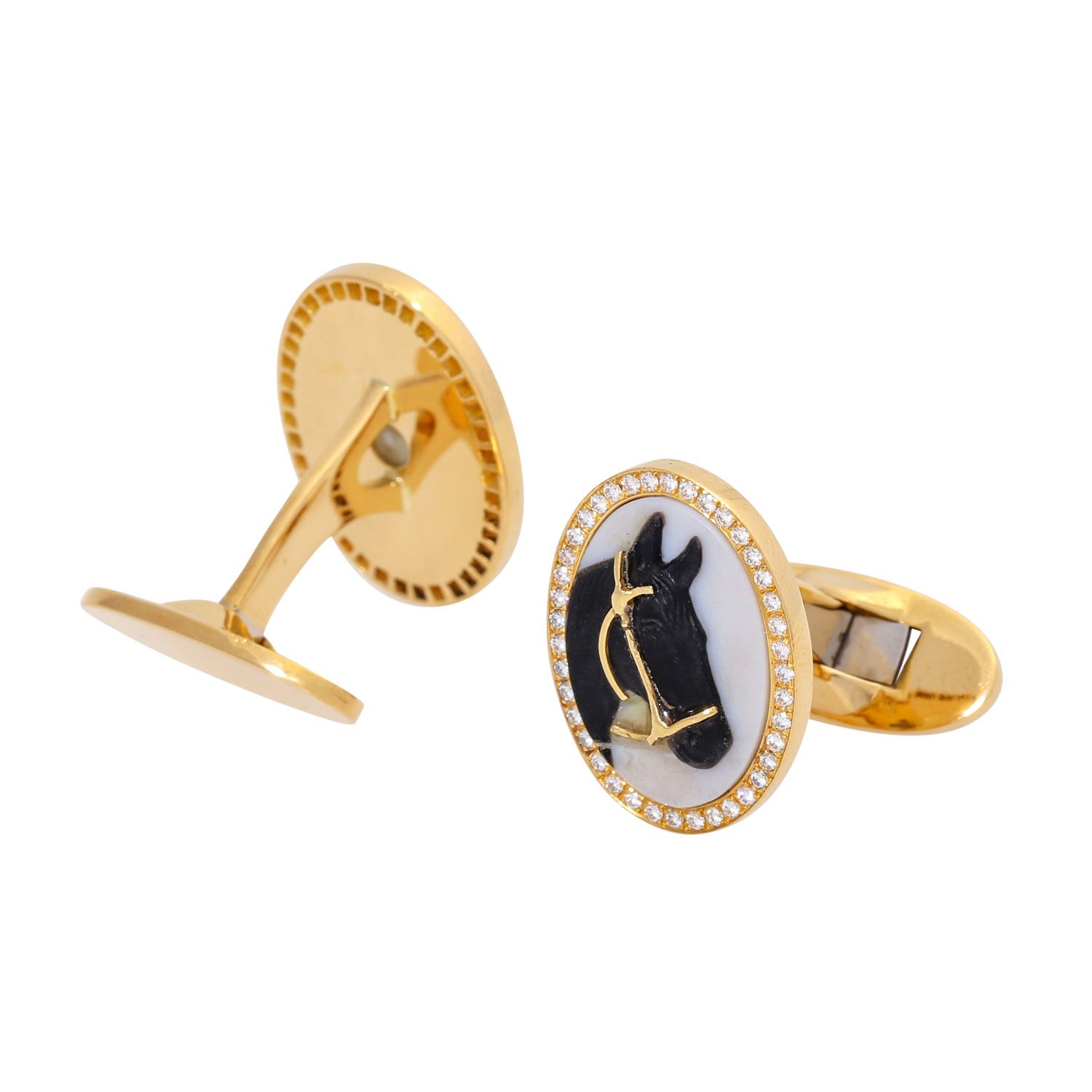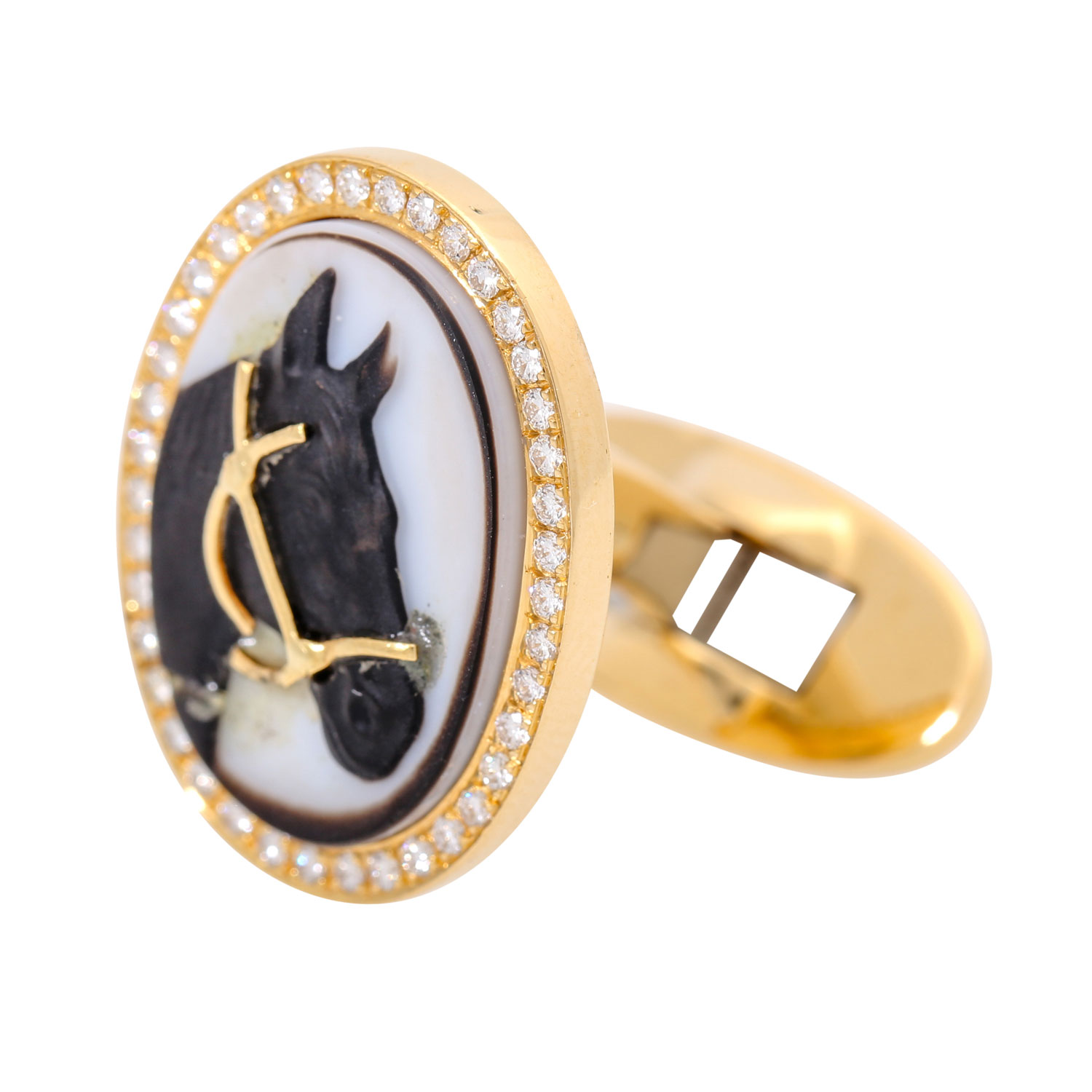 Cufflinks 'Horse Portrait', hand-engraved agate/onyx cameo with gold trimming, each surrounded by 40 brilliant-cut diamonds, totalling ca. 0.80 ct, good colour and clarity, 18K yellow gold, 16.8 g, L x W: ca. 21.5 x 16.5 mm, late 20th century, minimal signs of wear, signs of glue at the front.