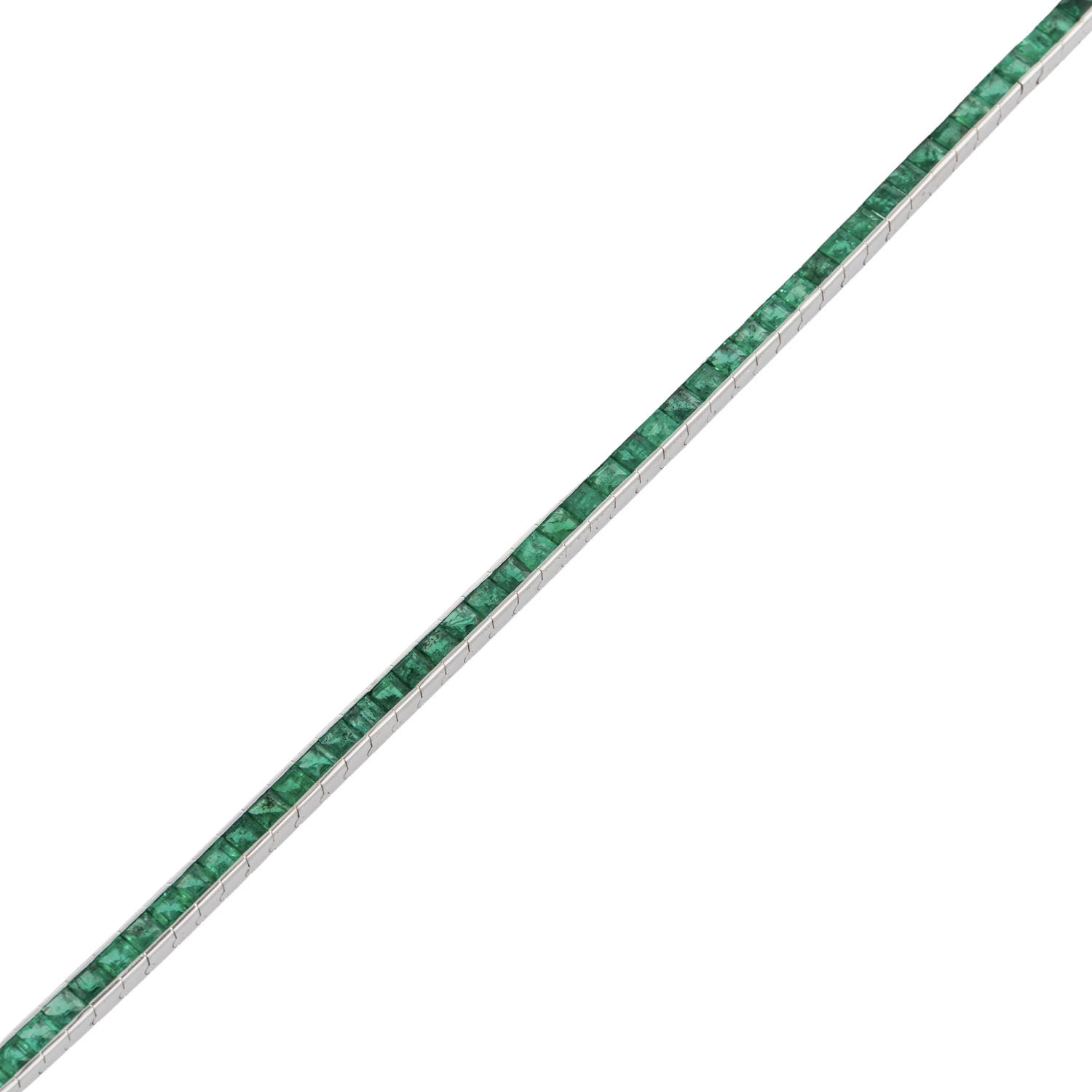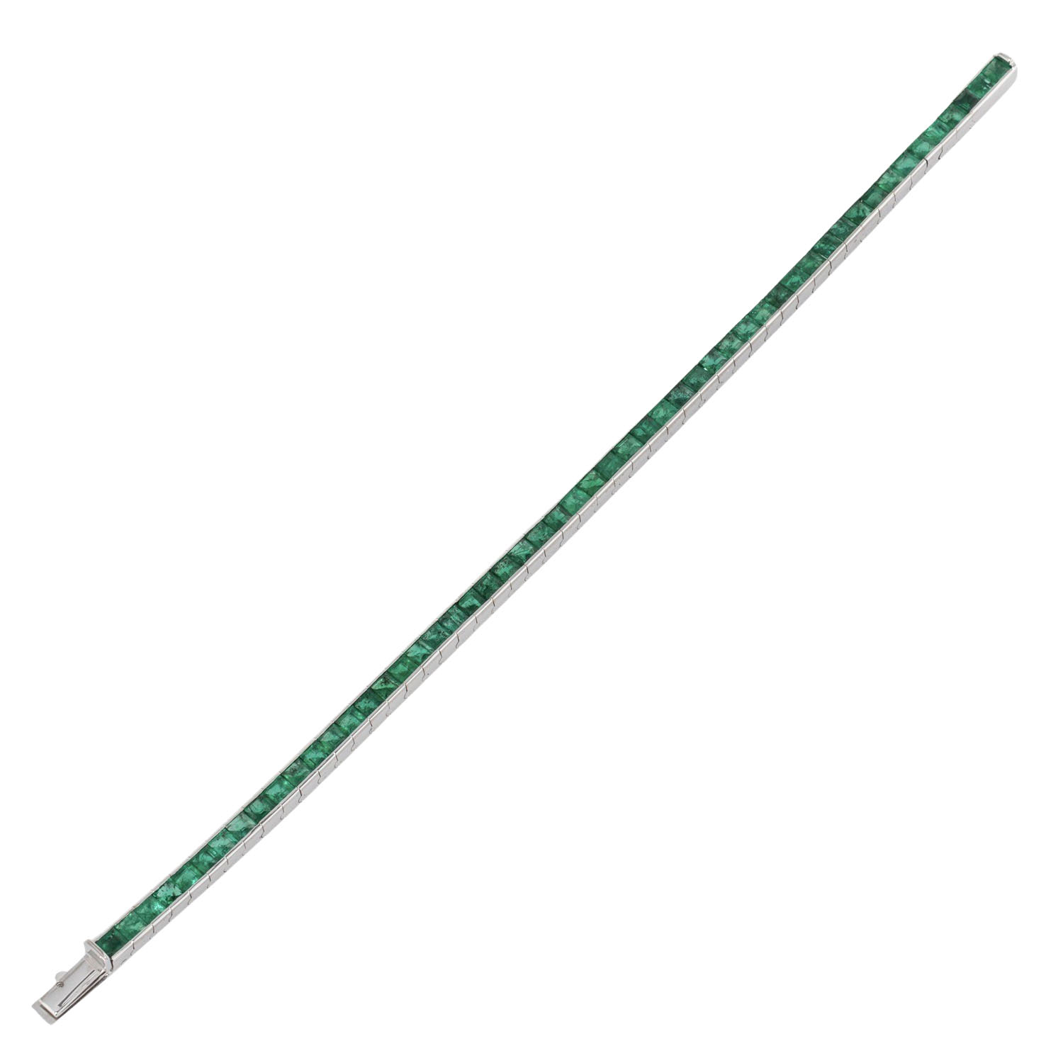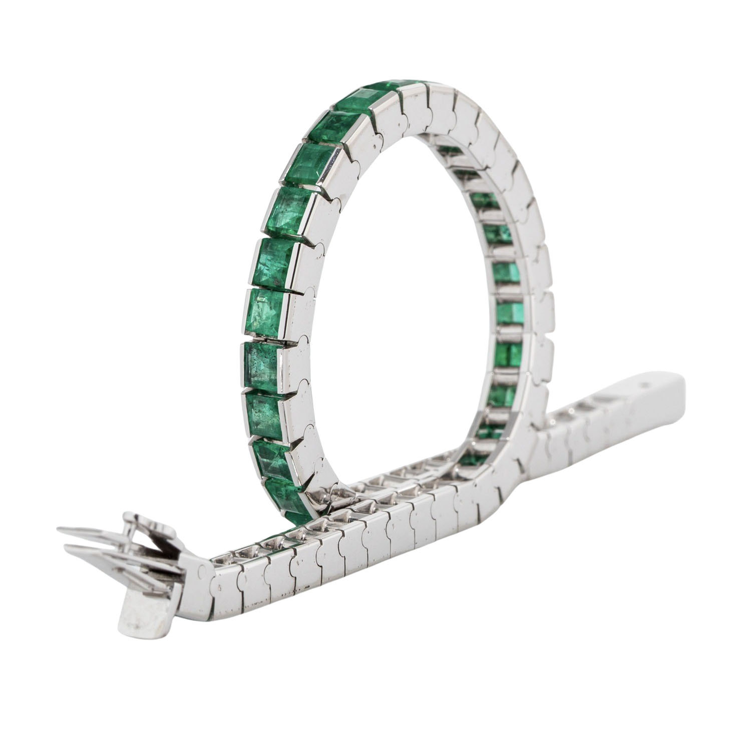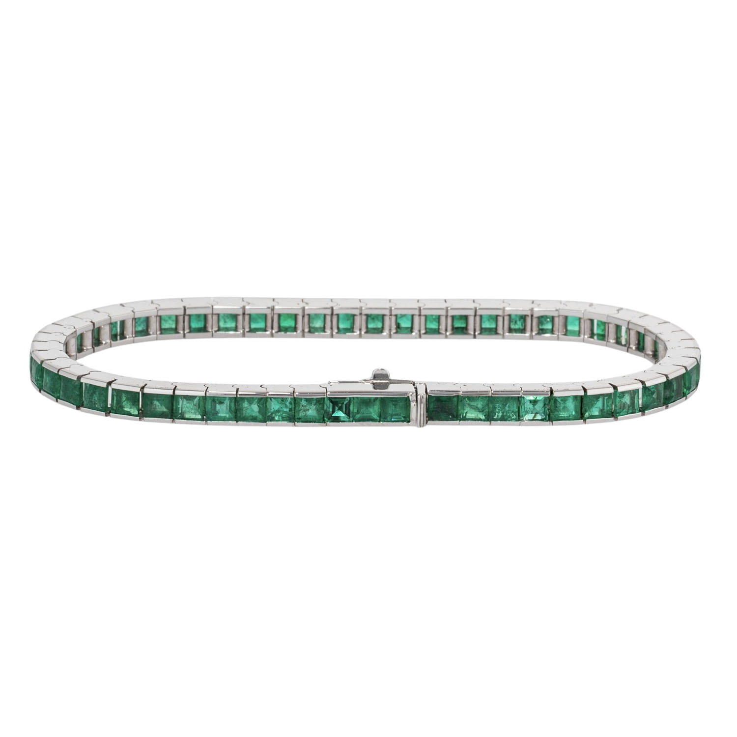 SCHILLING bracelet with 53 carré-cut emeralds totalling ca. 6.5 ct set in a line, 18K white gold, 18.6 g, L: 17 cm, W: 3.8 mm, 2nd half of 20th century, good condition, marked 'SCHILLING', high quality craftsmanship.