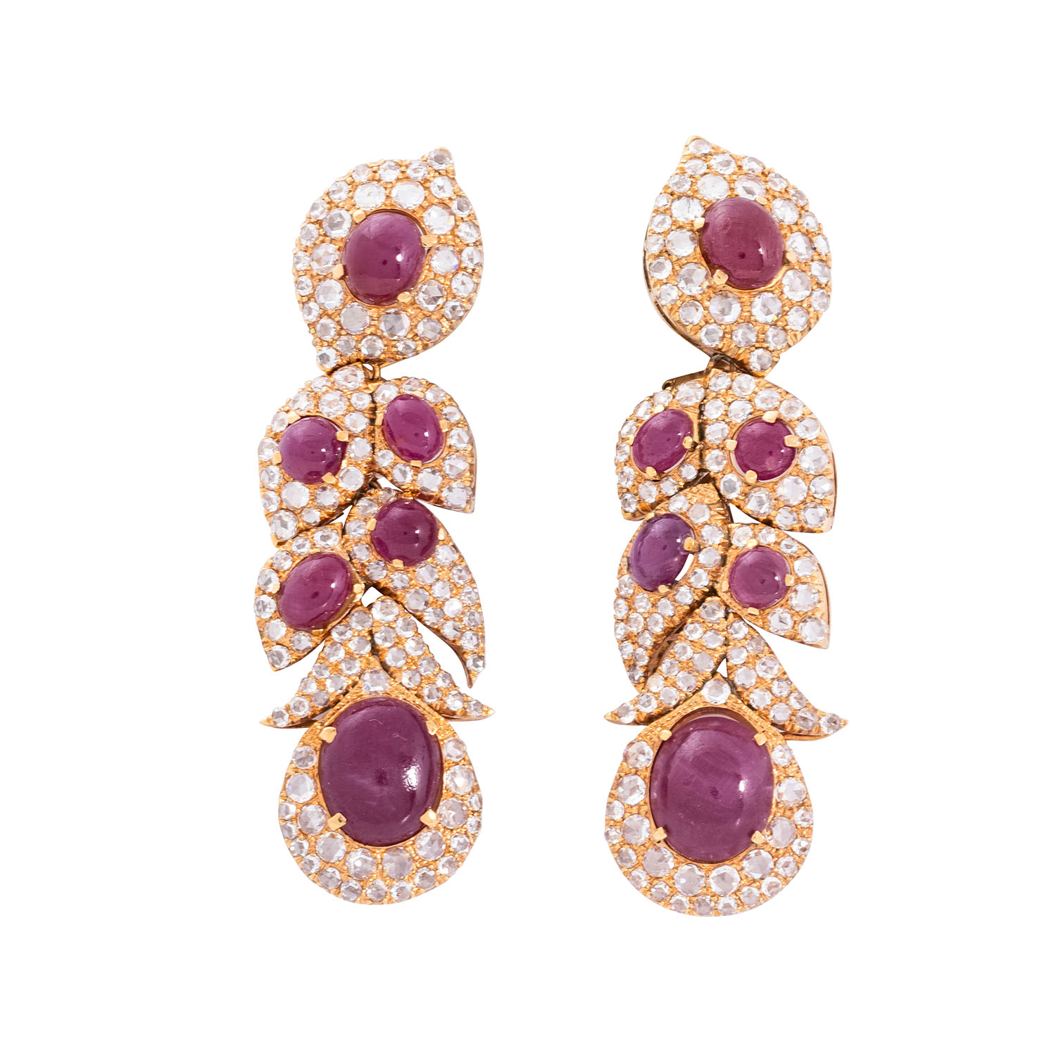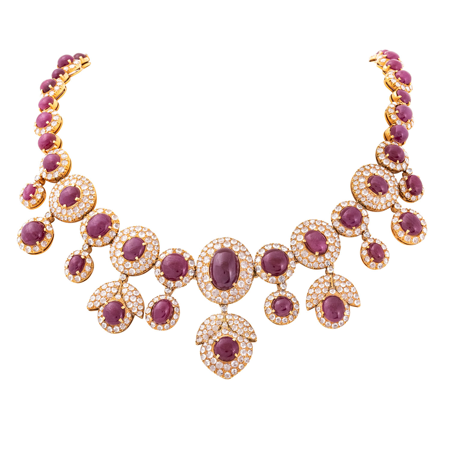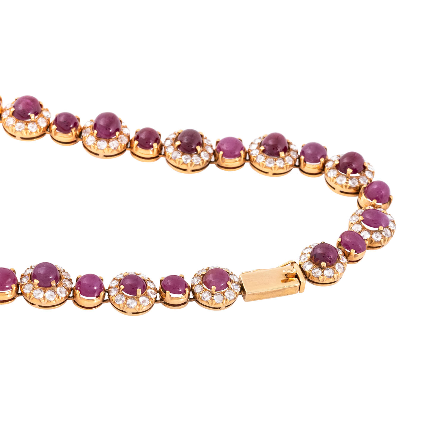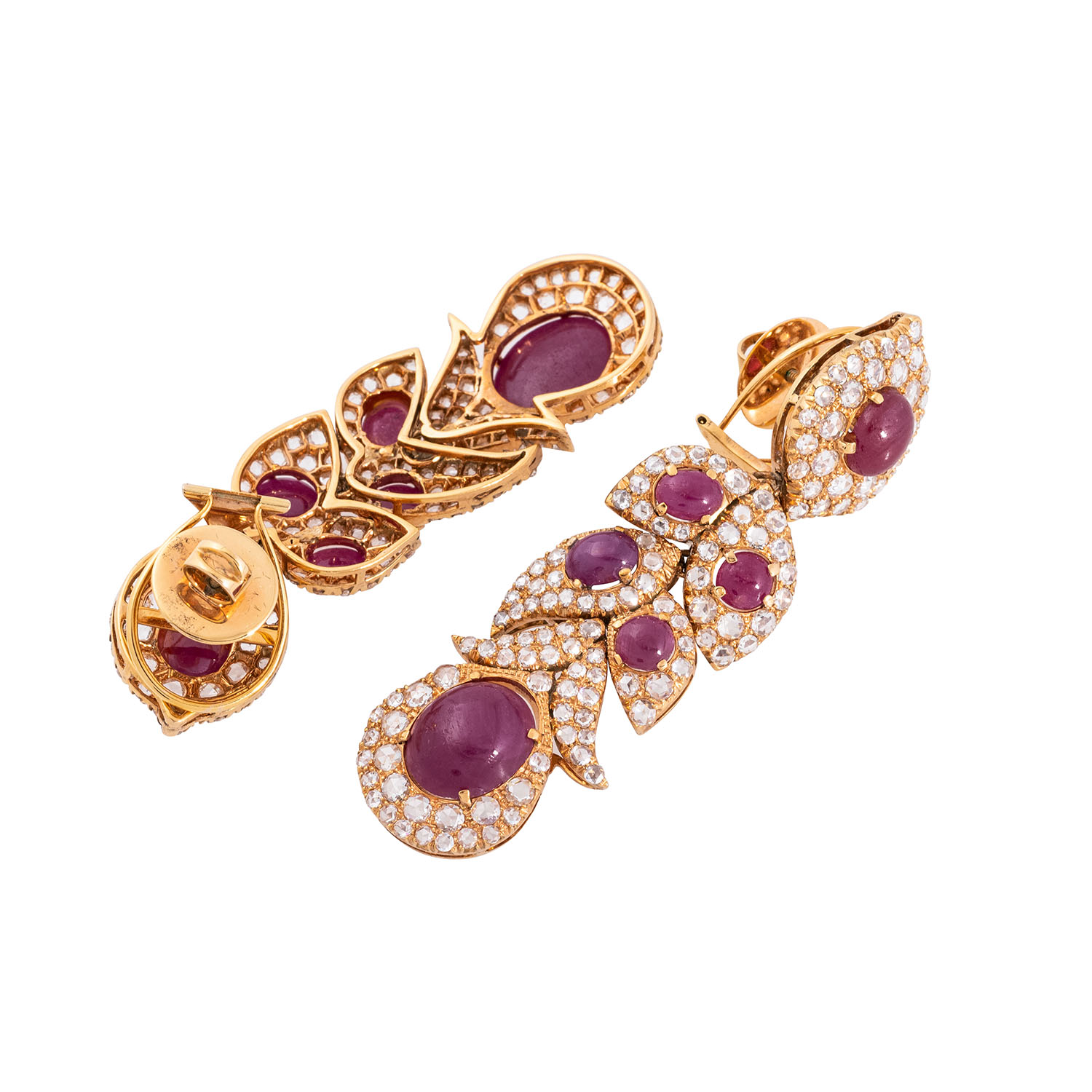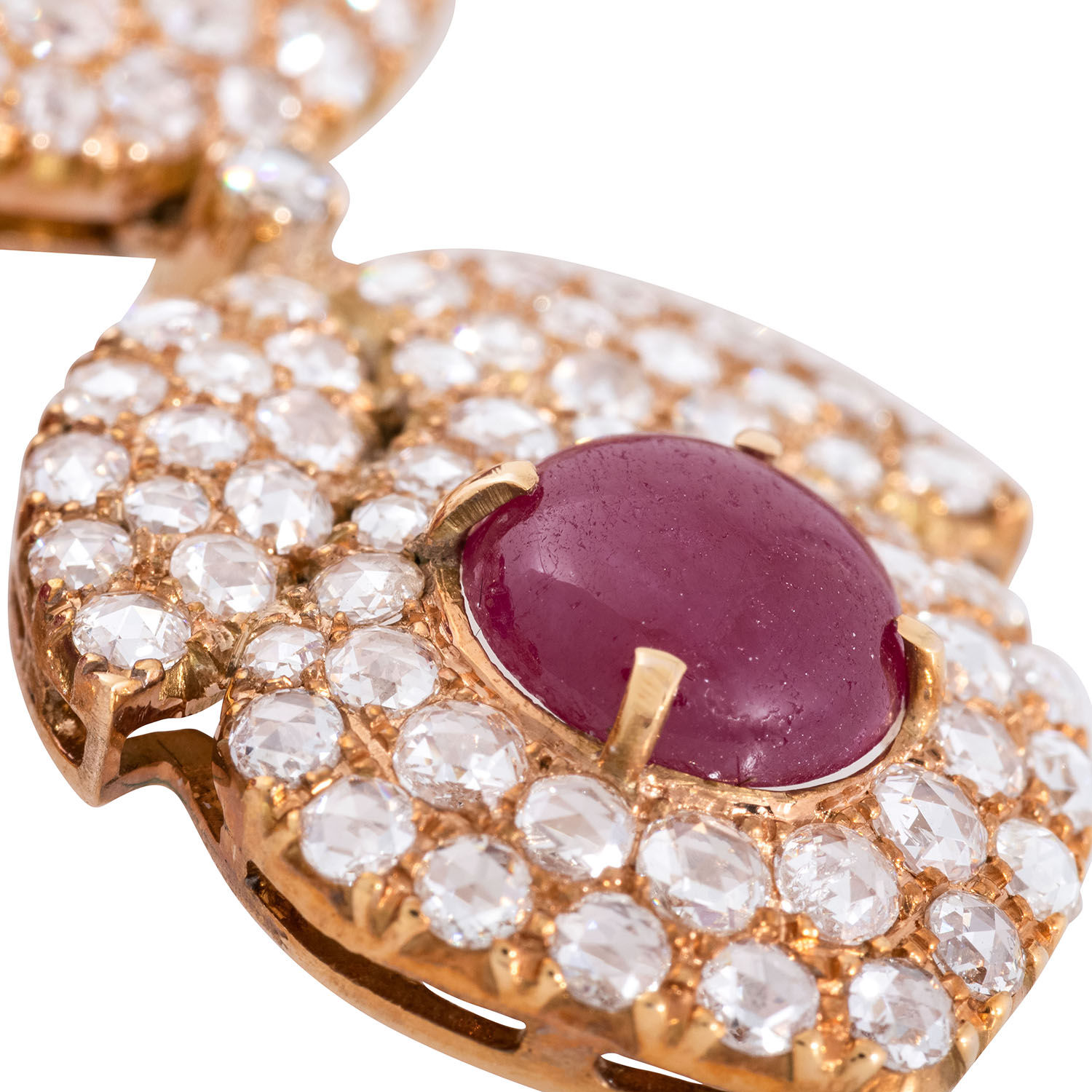 Jewellery set: Necklace and ear hangers with ruby cabochons (translucent) and rose-cut diamonds totalling ca. 8 ct (estim.), ca. 500/000 RG, 119.4 grams, neckl. L: ca. 46 cm, ear hangers L: ca. 6.3 cm, 20th century, minor signs of wear.