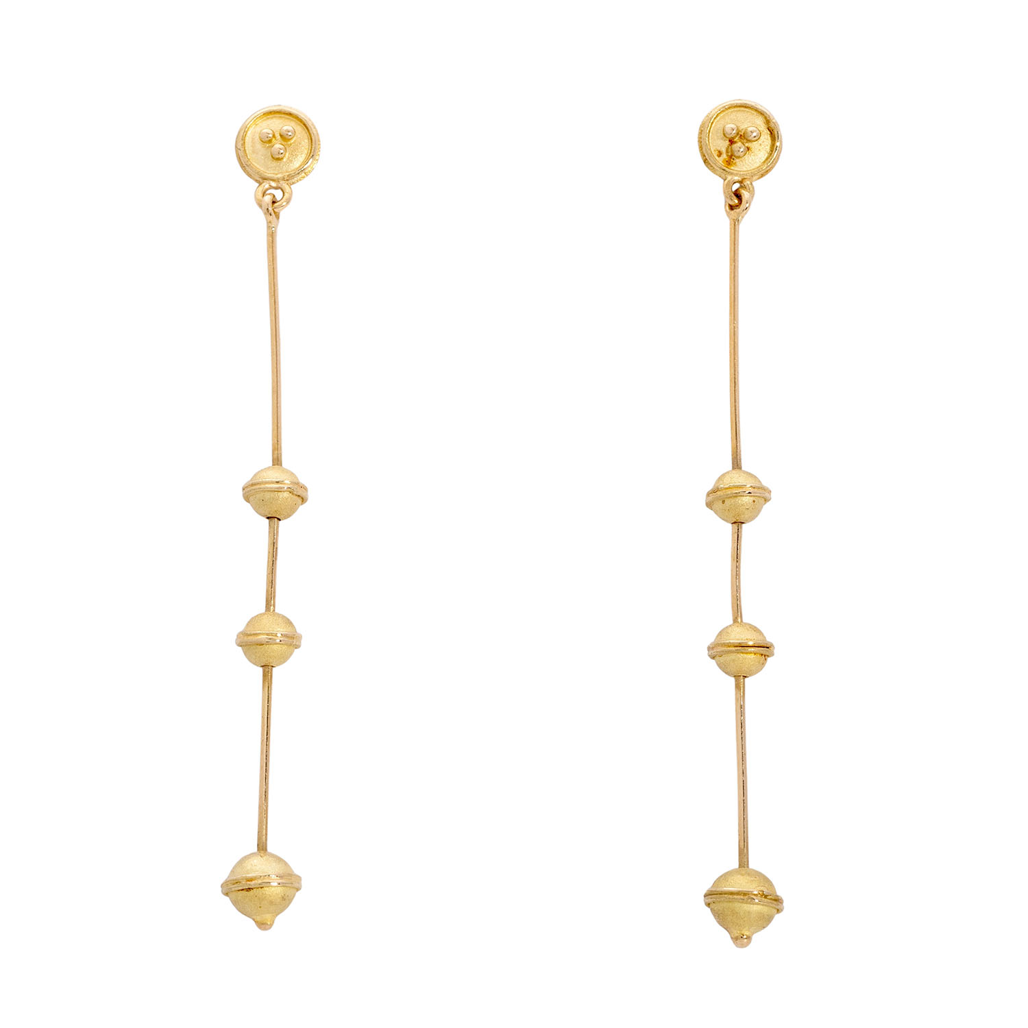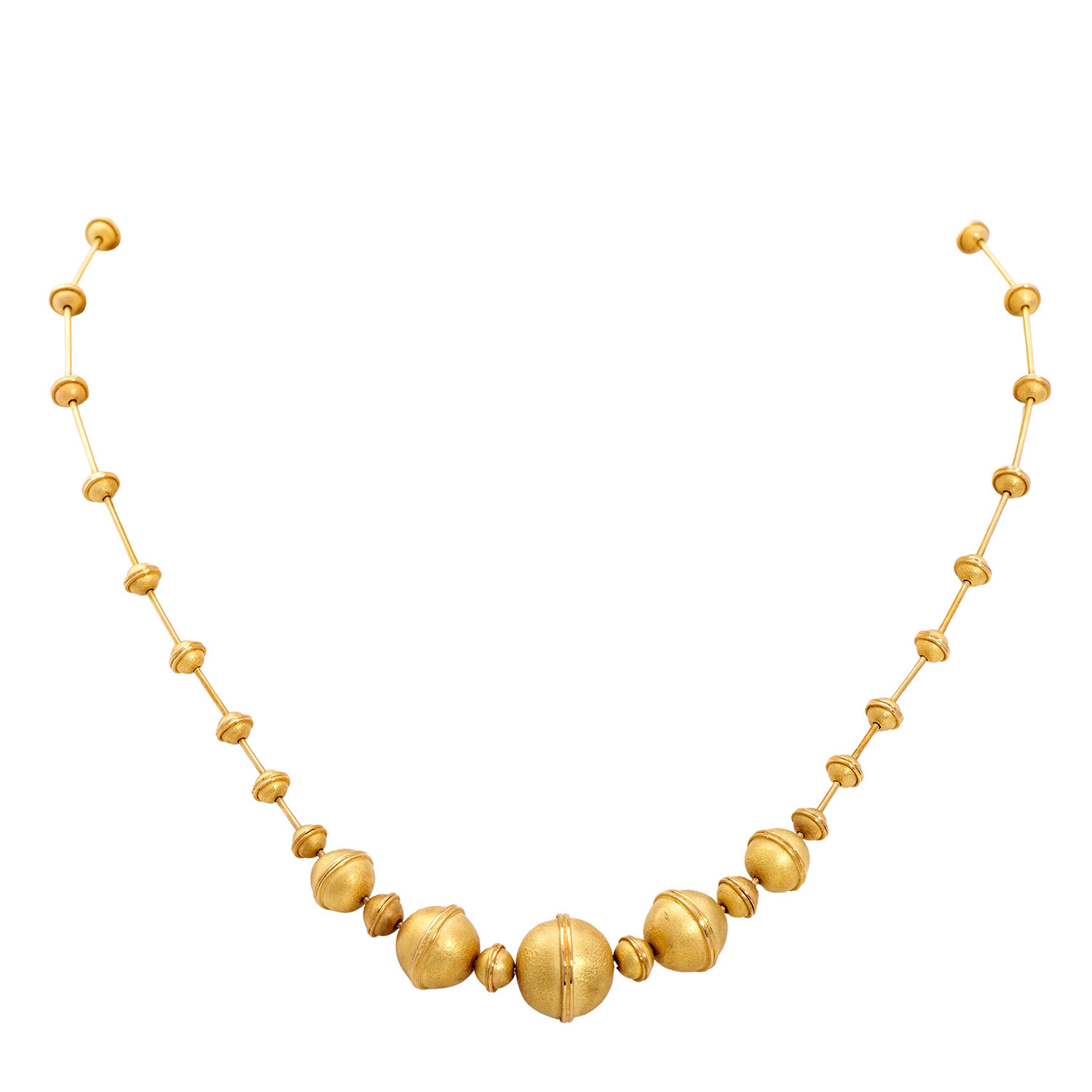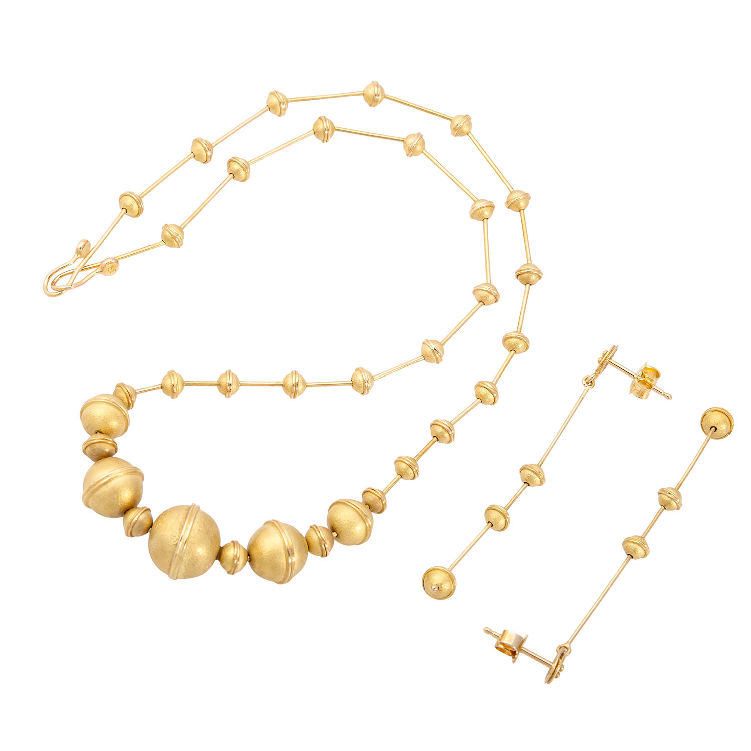 Jewellery set consisting of a necklace and a pair of ear pendants with spherical elements, YG 18K, 22.8 g, necklace l: approx. 40.5 cm, ear pendants l: approx. 5.5 cm, 20th/21st century, minor signs of wear.