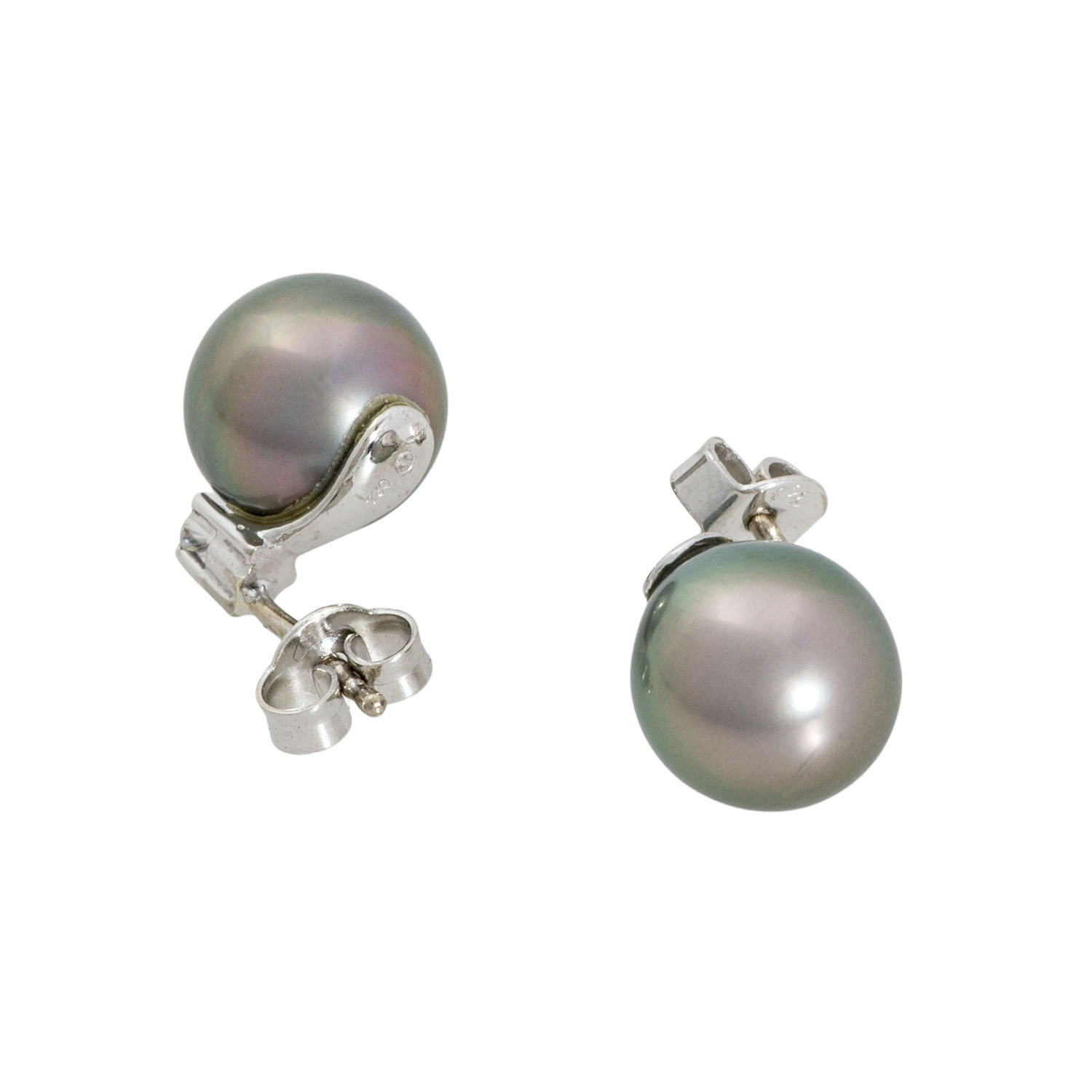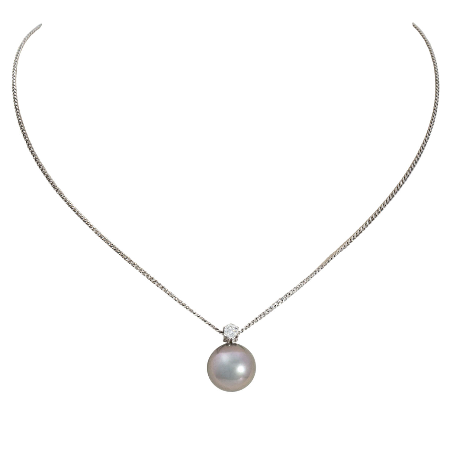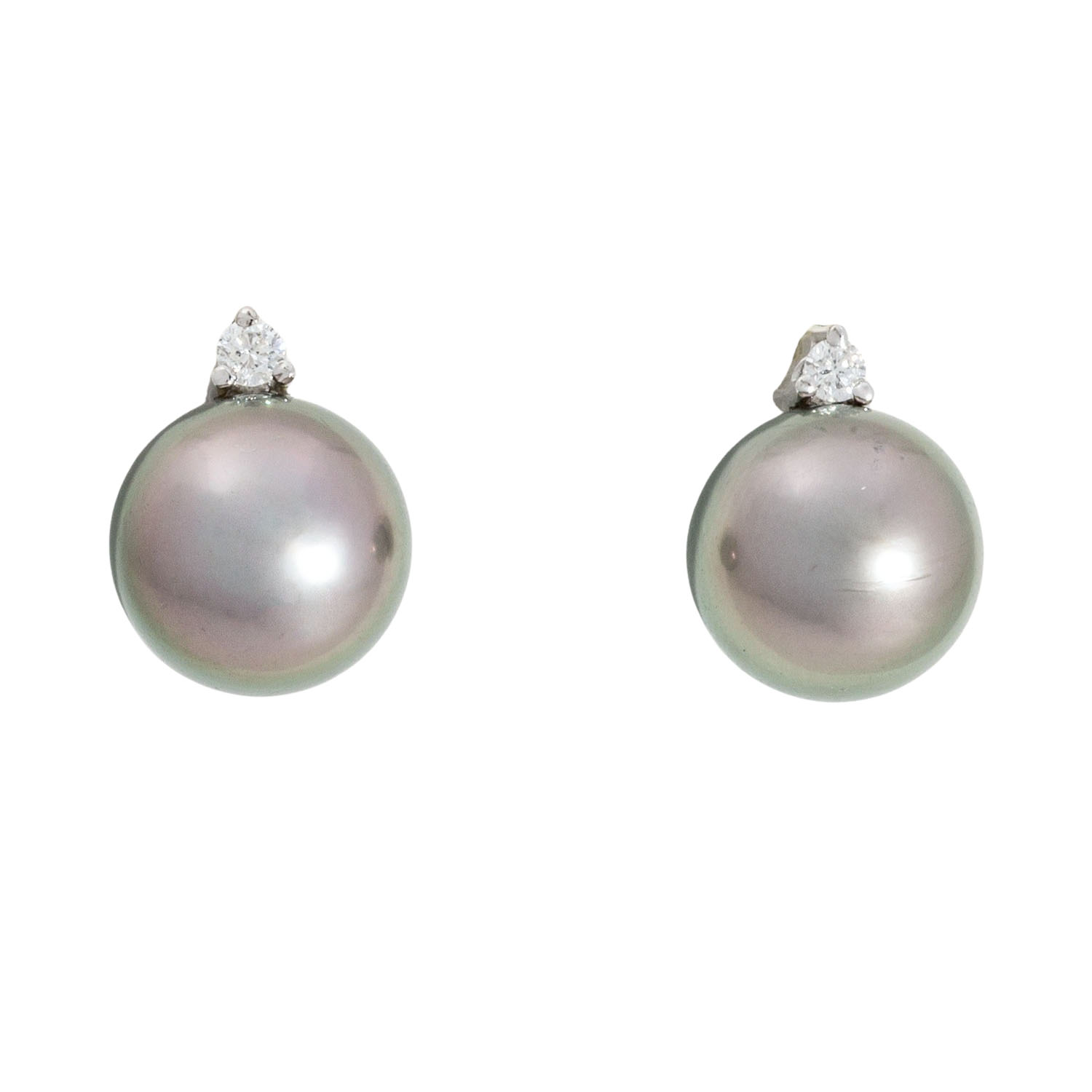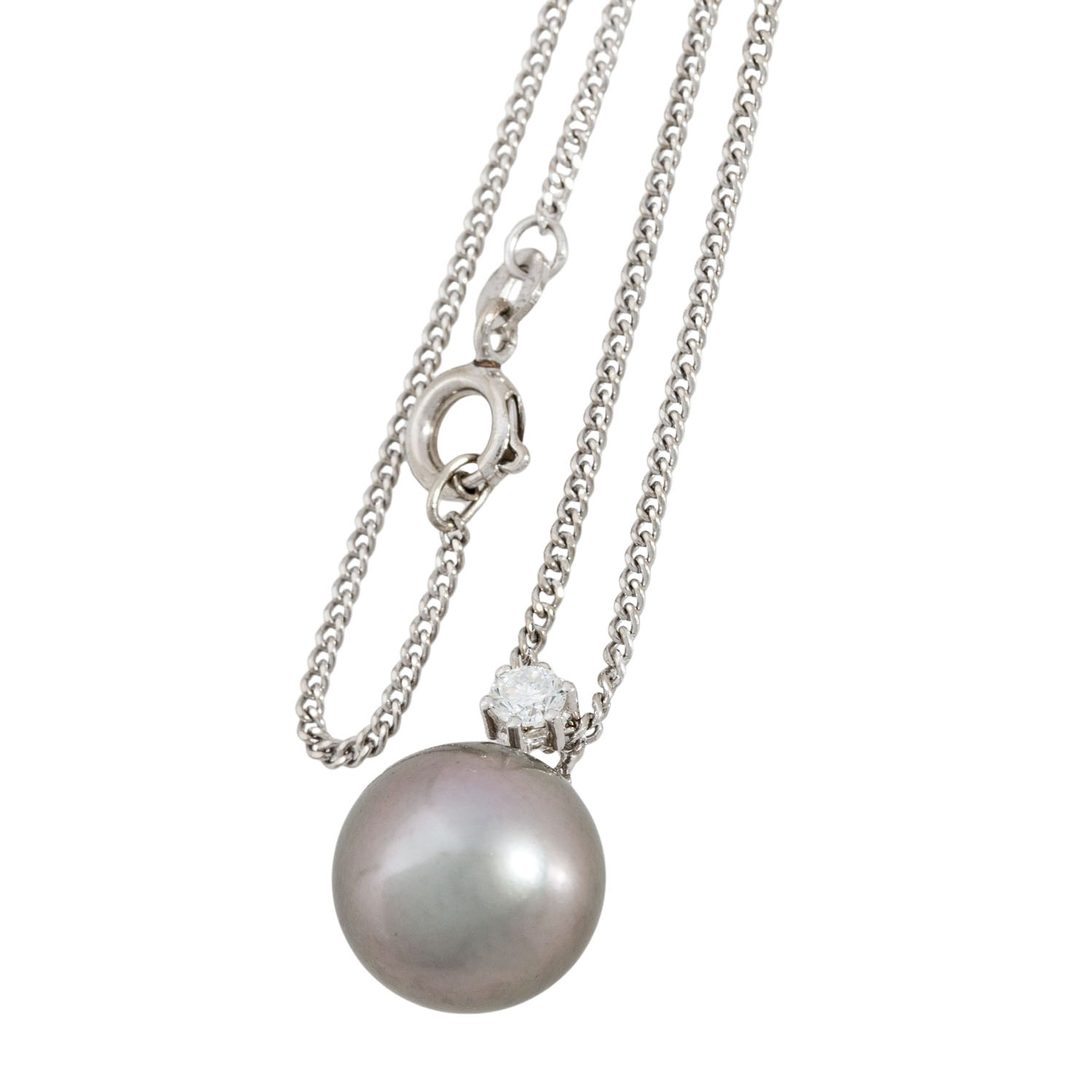 Jewellery set with Tahitian cultured pearls crowned by small brilliant-cut diamonds totalling ca. 0.25 ct, ca. WHITE (H)/SI, consisting of pendant (pearl 12.5 mm) with necklace L: 40 cm and earrings (pearls 9.5 mm), beautiful lustre, 18K white gold, 10 g, 21st century, good condition.