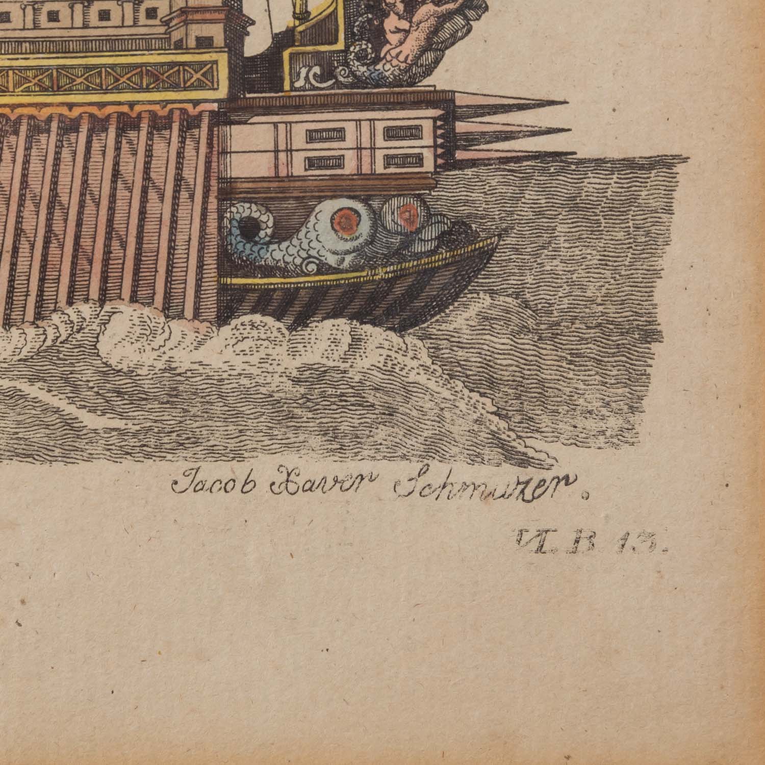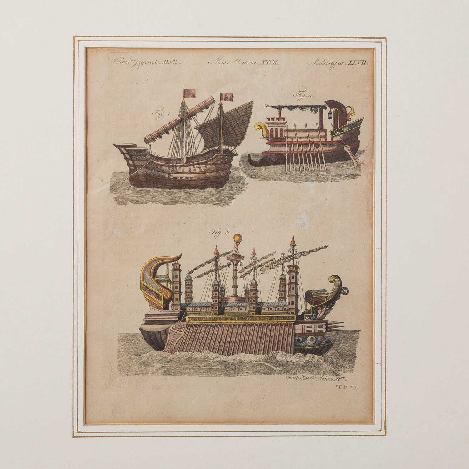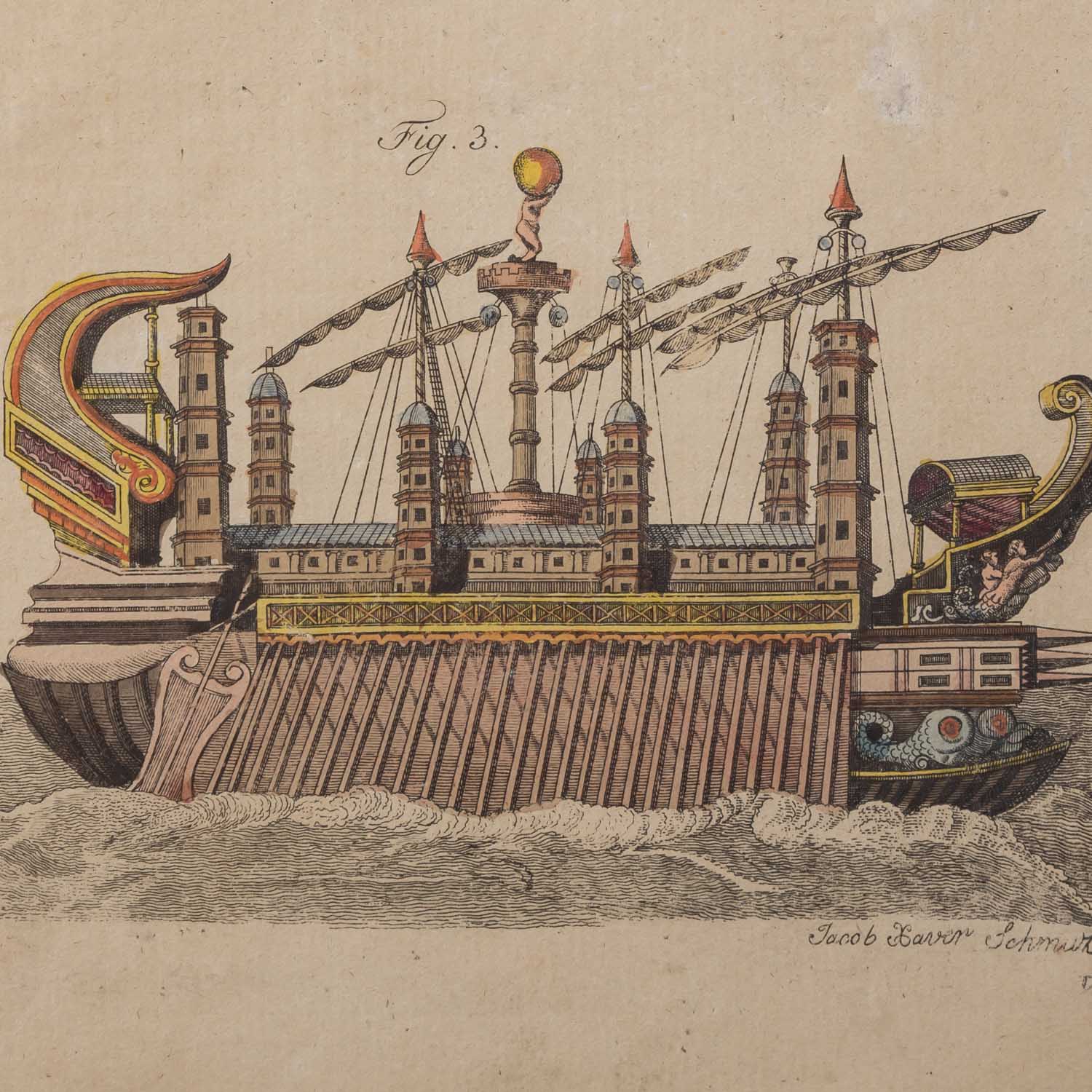 SCHMUTZER, JACOB XAVER & RIEDER (18th/19th century), 2 scenes from the shipbuilding 'Lost Items' 1x Schmutzer 'Phoenician Cargo Ship' AND 1x Rieger 'Lost Items CCXCV', colored copper engravings/laid paper, each in the plate labeled, HxW: plate approx. 22.5x17 cm each, passepartouta cut-out 25x19 cm and approx. 25x17.5 cm, outer dimensions of frame approx. 46x38 cm. Each signs of age, browned and partially stained, the first leaf damaged at the edge. Each framed behind glass in a passe-partout.