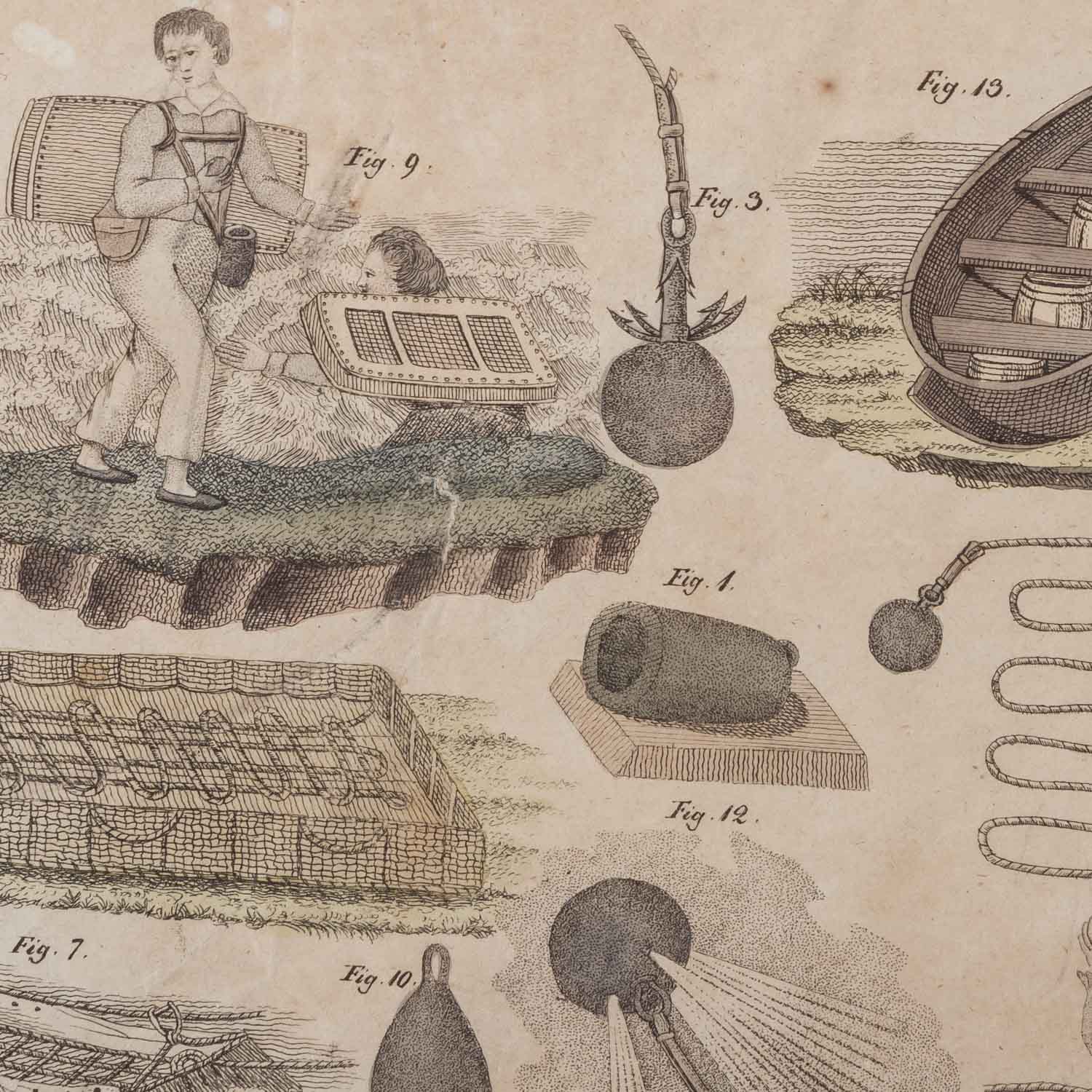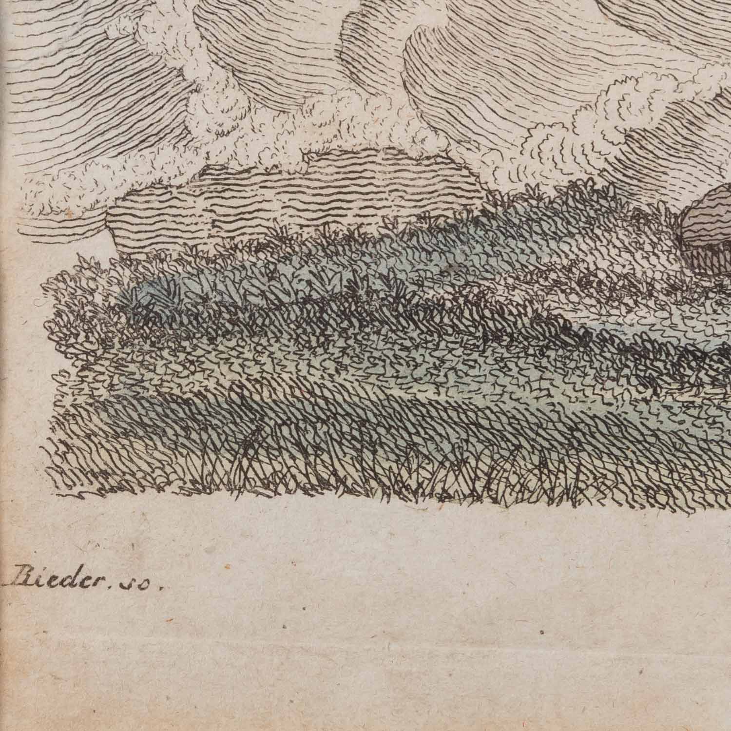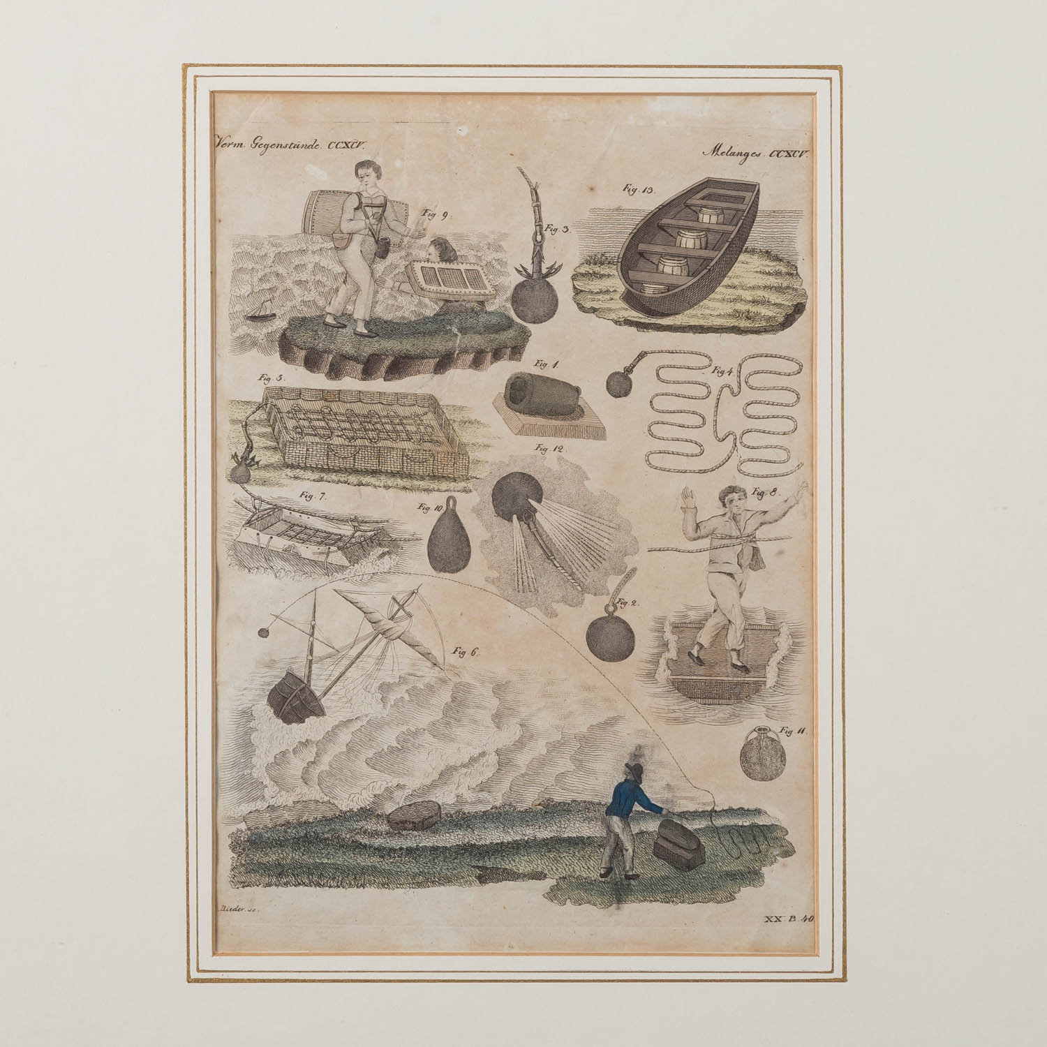 SCHMUTZER, JACOB XAVER & RIEDER (18th/19th century), 2 scenes from the shipbuilding 'Lost Items' 1x Schmutzer 'Phoenician Cargo Ship' AND 1x Rieger 'Lost Items CCXCV', colored copper engravings/laid paper, each in the plate labeled, HxW: plate approx. 22.5x17 cm each, passepartouta cut-out 25x19 cm and approx. 25x17.5 cm, outer dimensions of frame approx. 46x38 cm. Each signs of age, browned and partially stained, the first leaf damaged at the edge. Each framed behind glass in a passe-partout.
