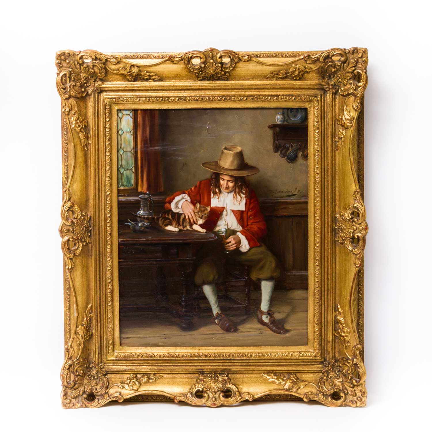 SCHRÖDER, J. (20th century painter, active in Munich), "Herr mit Katze im Stubeninterieur", a young man in 17th century costume sitting at a table with a wine glass, scratching the cat sitting on the table, signed and inscribed "J. Schröder, Mn." on the right, oil on canvas, 50x40.5 cm. With magnificent frame (min. dam.). Traces of age.