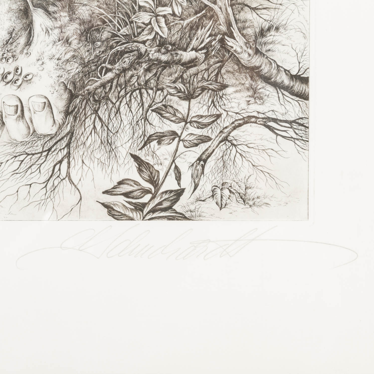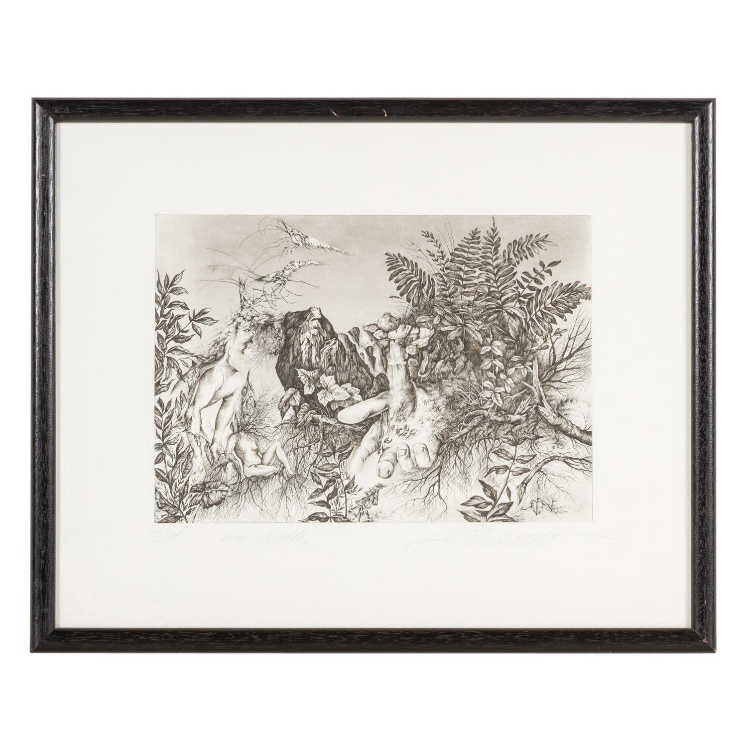SCHUCHARDT, DIETRICH (born 1945), 'My Bicorn', Color aquatint etching, numbered 71/90 in pencil by hand lower left, titled 'Mein Zweihorn' lower center, signed in pencil by hand lower right, HxW: plate approx. 21x34.5 cm, outer frame dimensions: approx. 42.5x52.5 cm. Traces of age, wavy. With glazed frame. VERSO Information on the artist and his exhibitions.