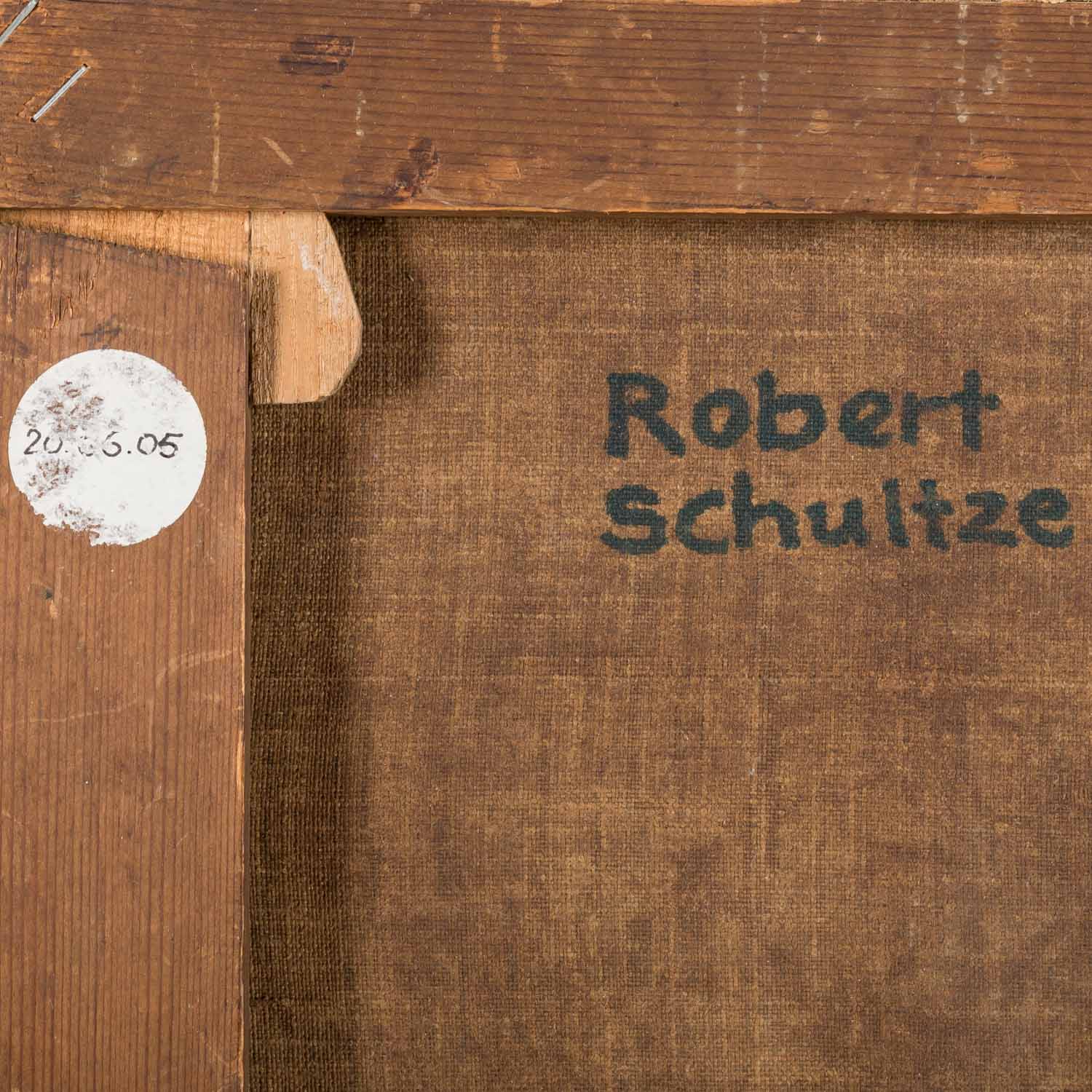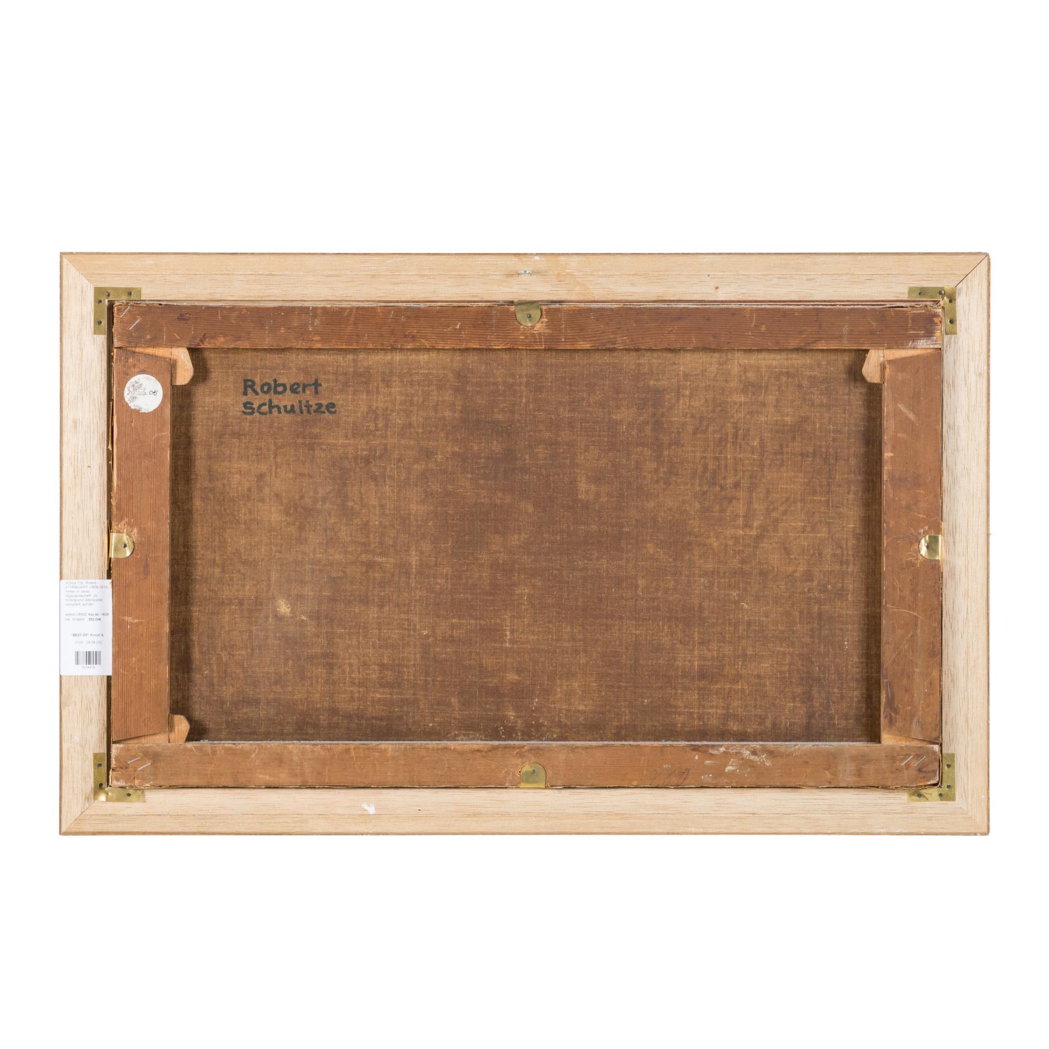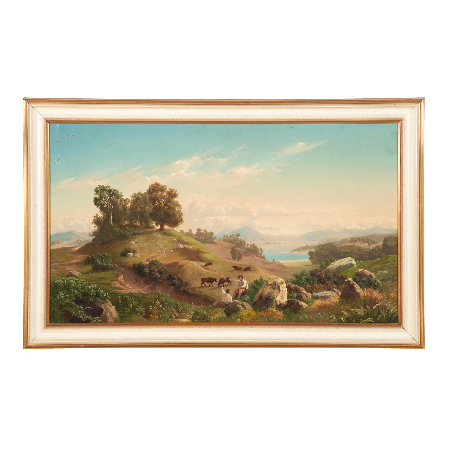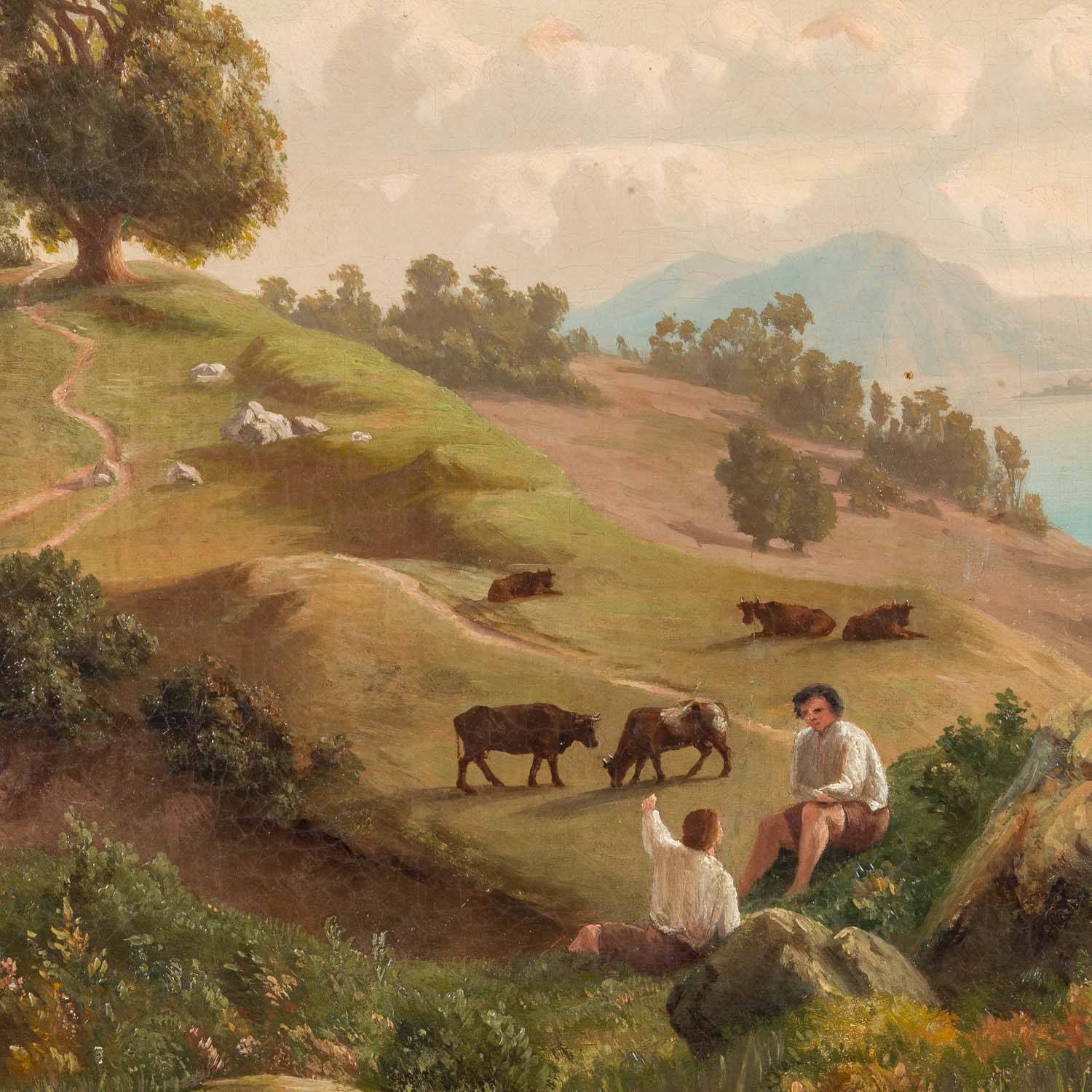 SCHULTZE, Robert, ATTRIBUTED (1828-1910), 'shepherds in a wide hilly landscape', in the background a mountain lake, unsigned, on the back of the canvas inscribed 'Robert Schultze' (probably by someone else), oil/canvas, HxW: approx. 40x68 cm ( 49x78 cm with frame). Craquelé and chipped paint. With frame (partly damaged).
