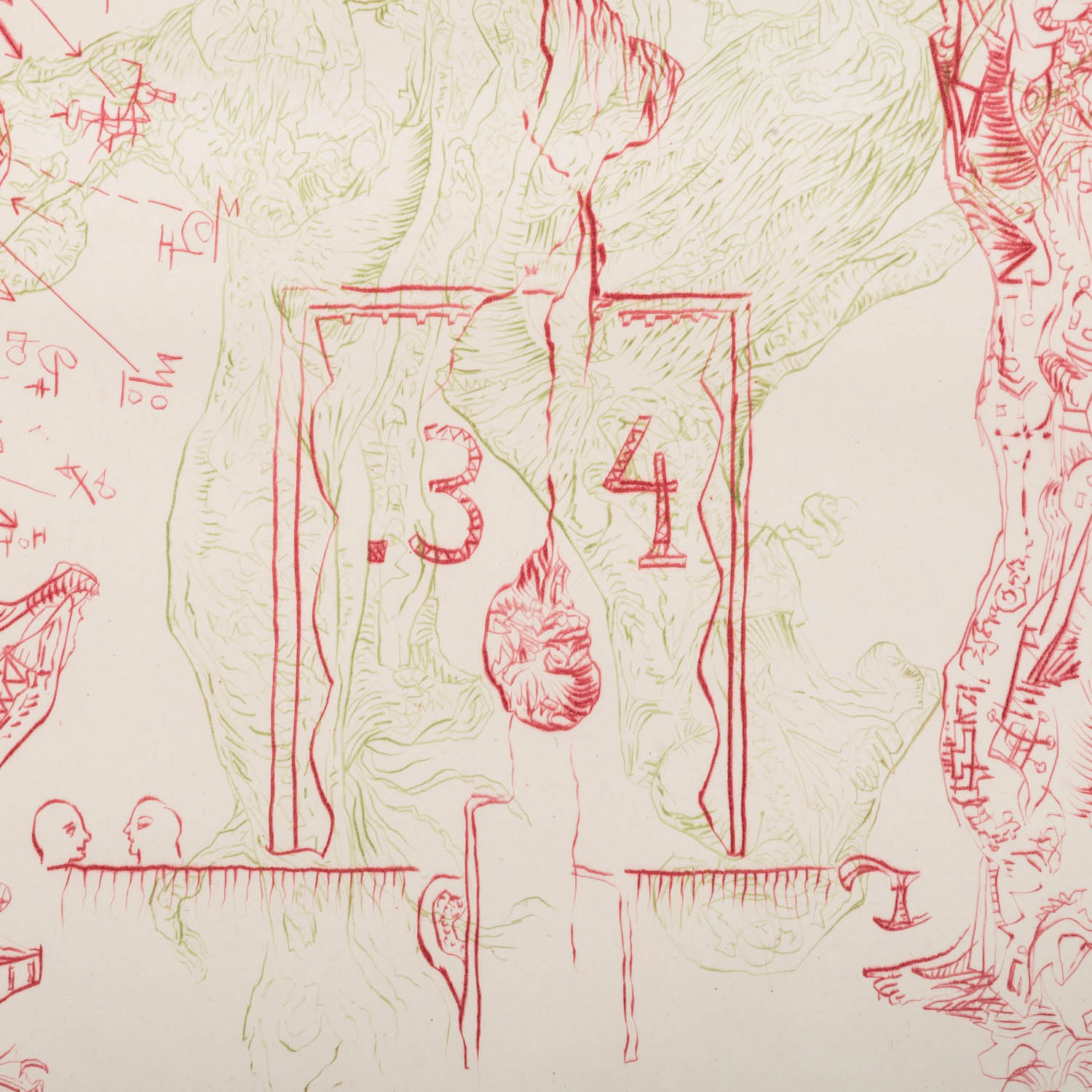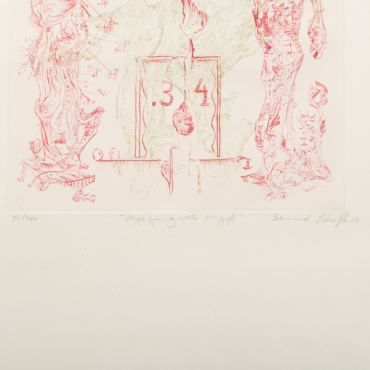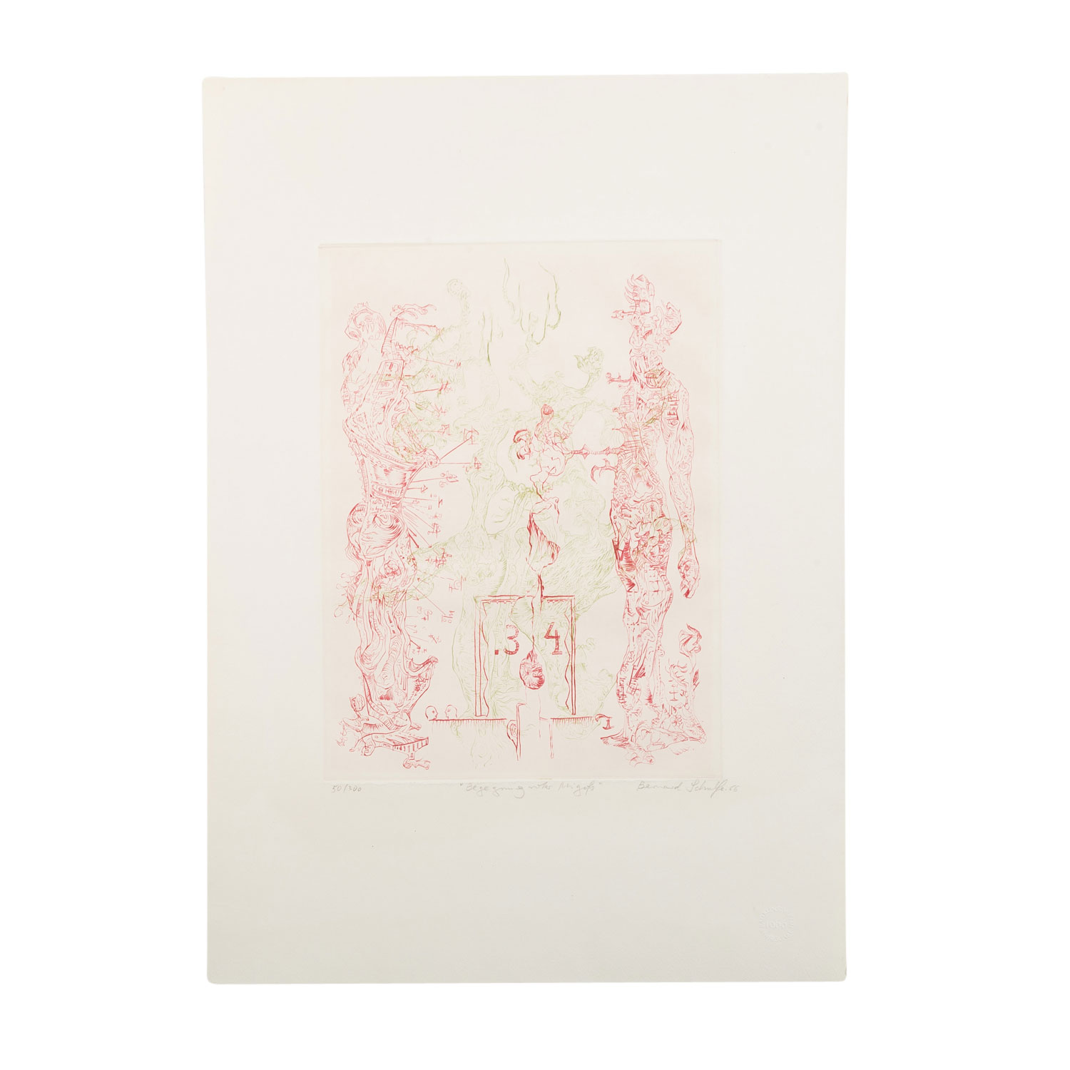SCHULZE, BERNHARD (1915-2005), 'meeting red Migofs', color etching/paper, including numbered by hand in pencil. 50/300, titled, signed and dated (19)66, dry stamp 'Bad. Kunstverein, Jahresgabe 1966', HxW: plate approx. 32x23.5 cm, sheet approx. 54x38 cm. Slight signs of age, minimal. wavy. PROVENANCE: Private collection of the artist Fritz Genkinger.