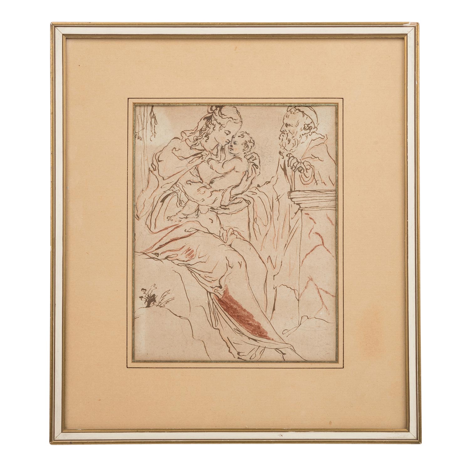 SCHWANTHALER, Johann Peter, ATTRIBUED/CIRCLE (J.P.S.: 1720-1795), 'Maria mit Christus im Tempel', study with priest, India ink and chalk, partly over pencil/handmade paper, HxW: mat opening approx. 19.5x15.5 cm, outer frame dimensions approx. 33x29 cm. Signs of age, slightly wavy, browned and stained. Framed behind glass in passepartout (passepartout browned). VERSO inscribed by an unknown hand.