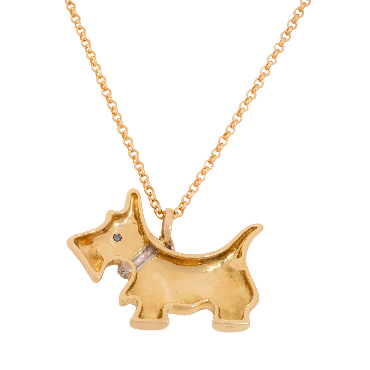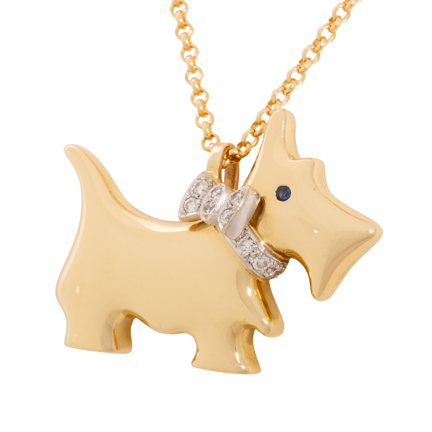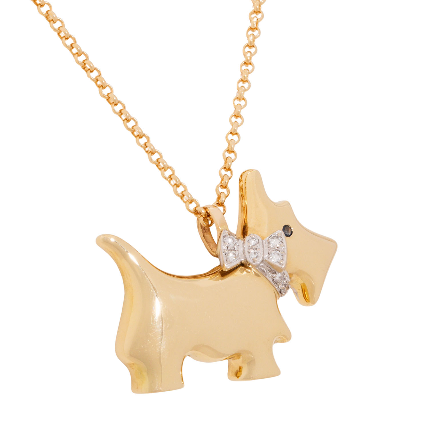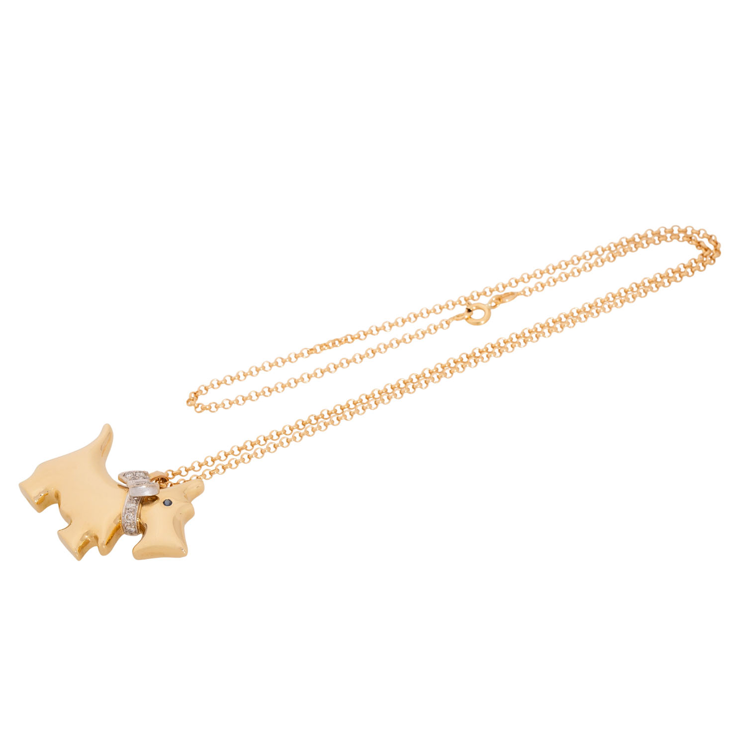 Pendant 'Scotch Terrier' with diamond set collar, 10 brilliant cut diamonds, ca. 0.1 ct, good colour and clarity, on necklace, 18K yellow gold, 14,7 g, necklace length: L.: 45 cm, pendant H: L: 26 mm, W: 35 mm, late 20th century, with signs of wear.