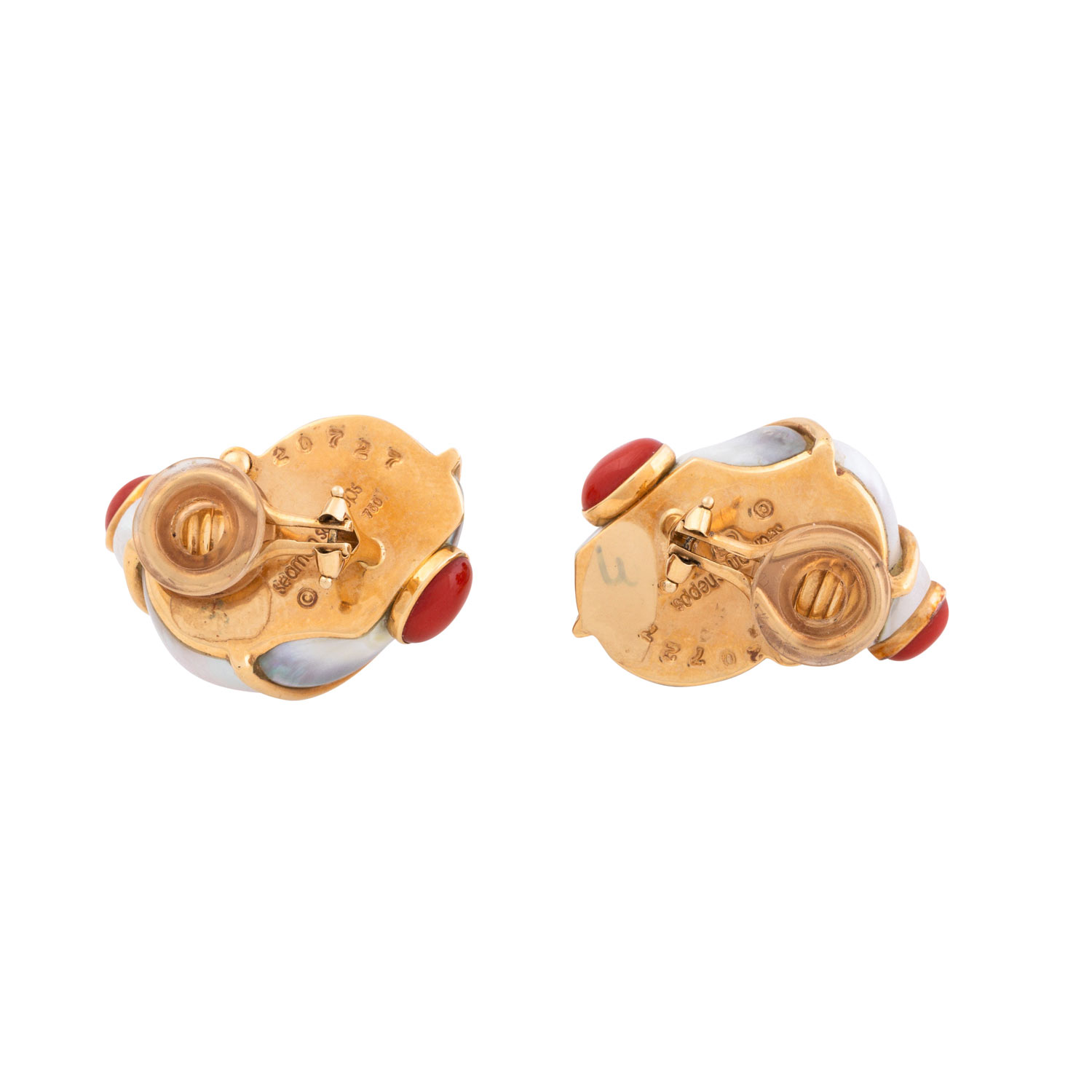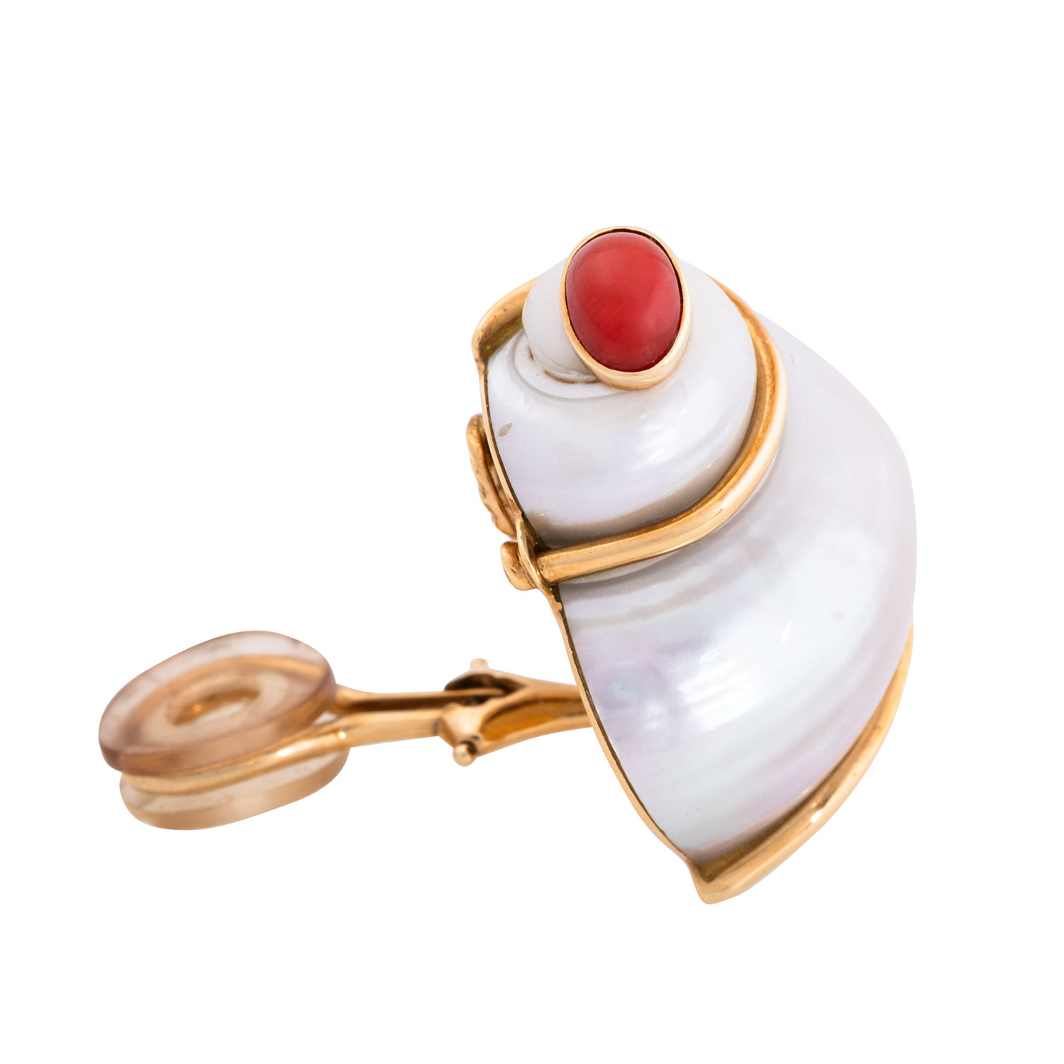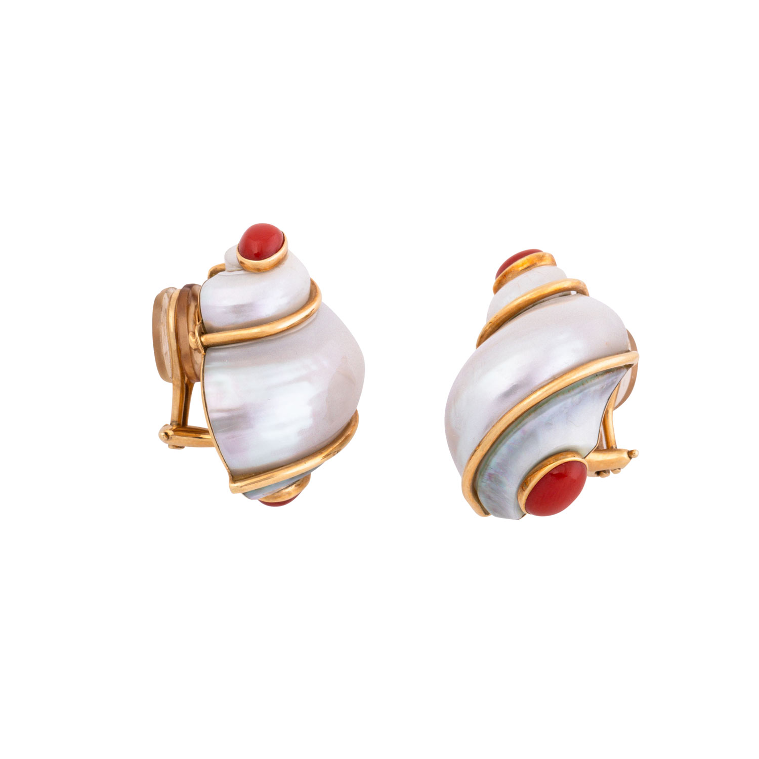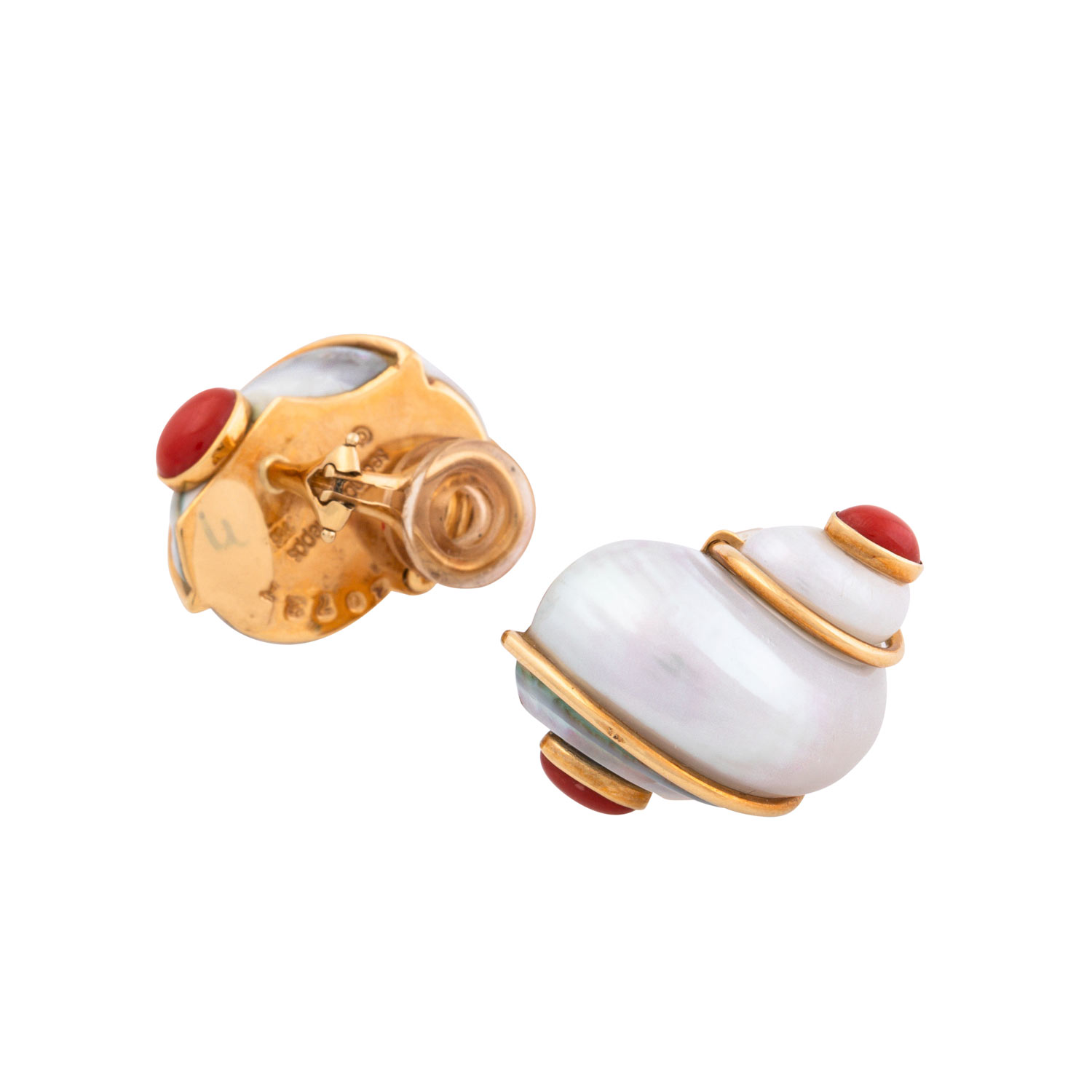 SEAMAN SCHEPPS 'TURBO SHELL' Earclips with sea shells and coral cabochóns. Yellow-Gold 18 K. Original jewlry pouch enclosed. Minor signs of wear. RETAIL ca. 8.800 €.