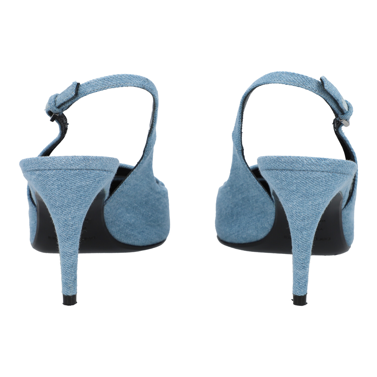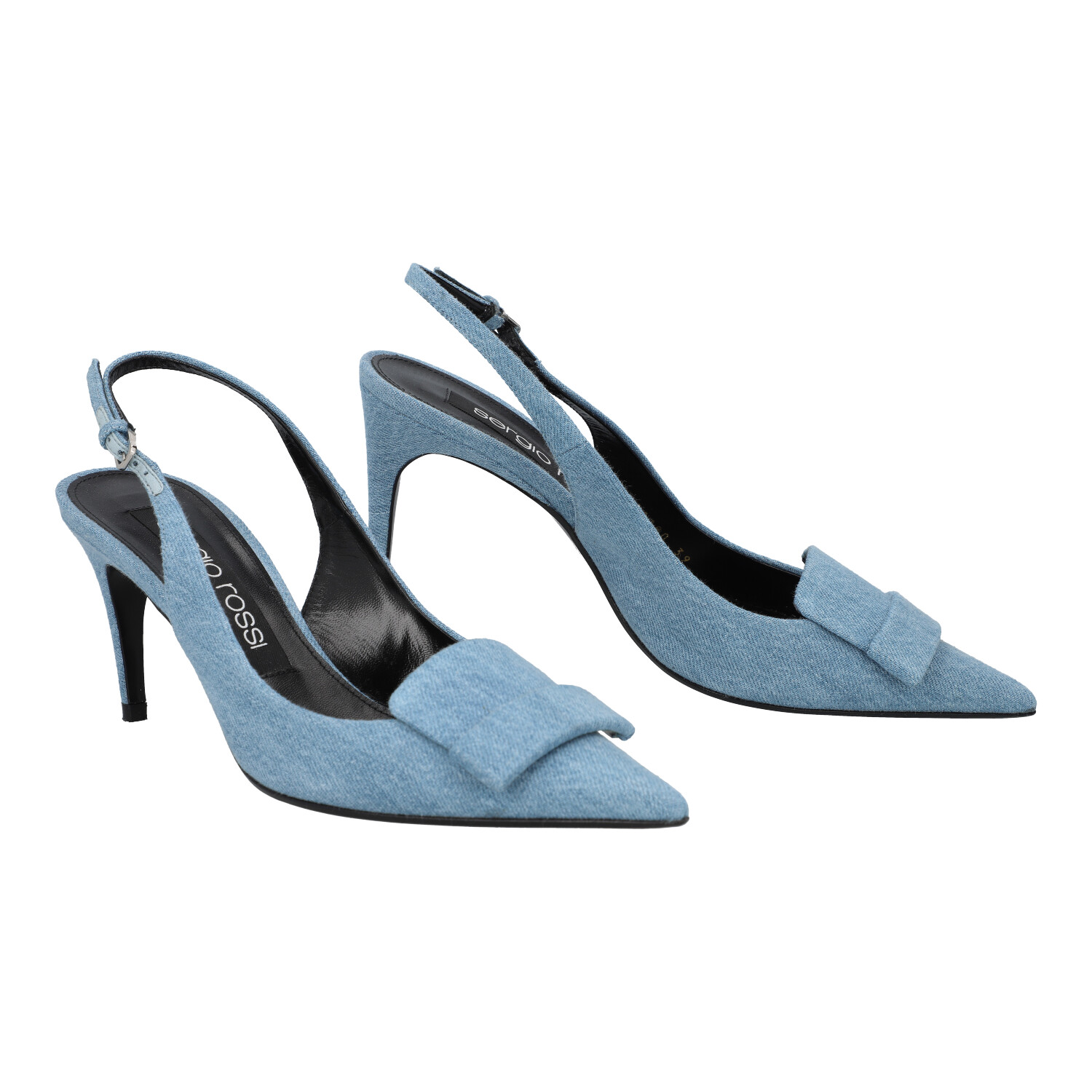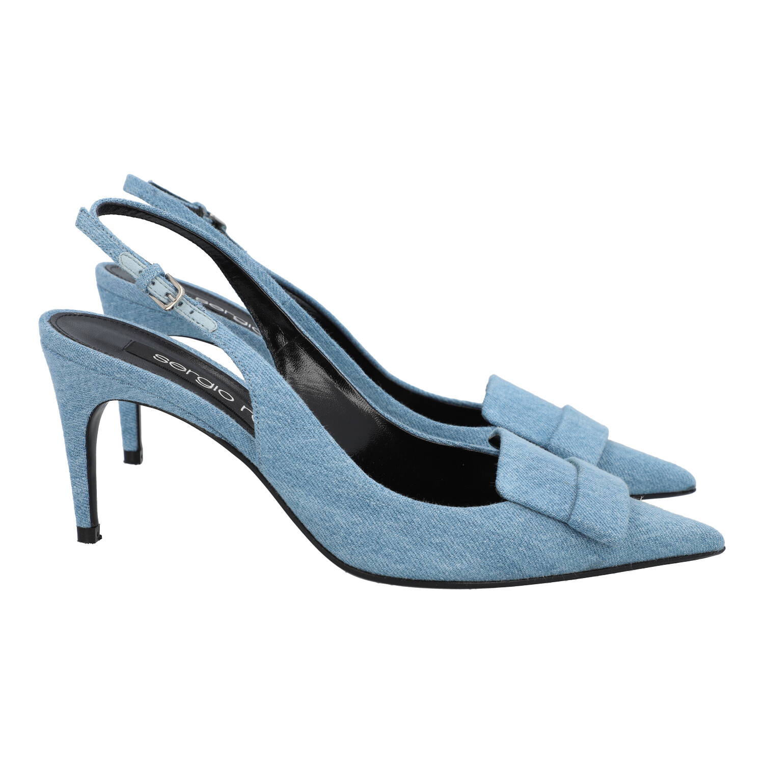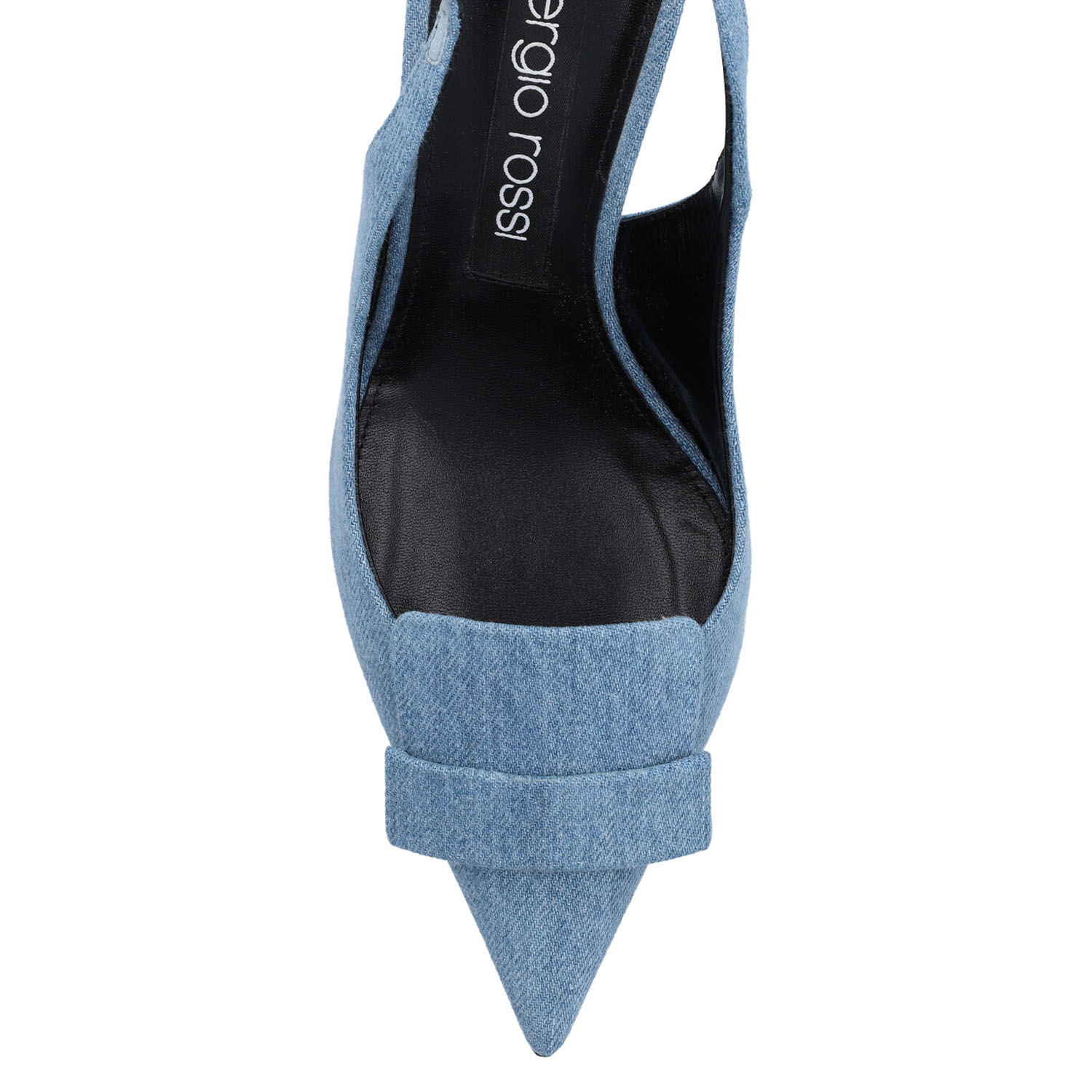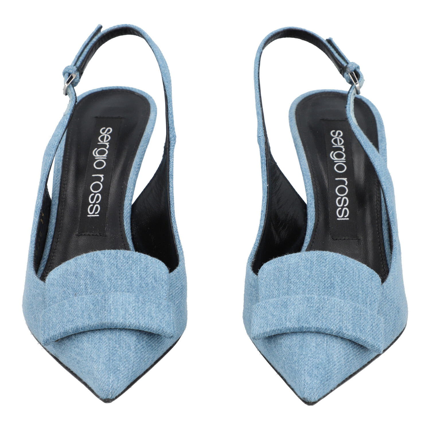 SERGIO ROSSI sandals, size 39. Made of denim in light blue with a pointed shoe shape, leather sole and spiked heel (height 8 cm). Box and dust bag enclosed. Very good condition.