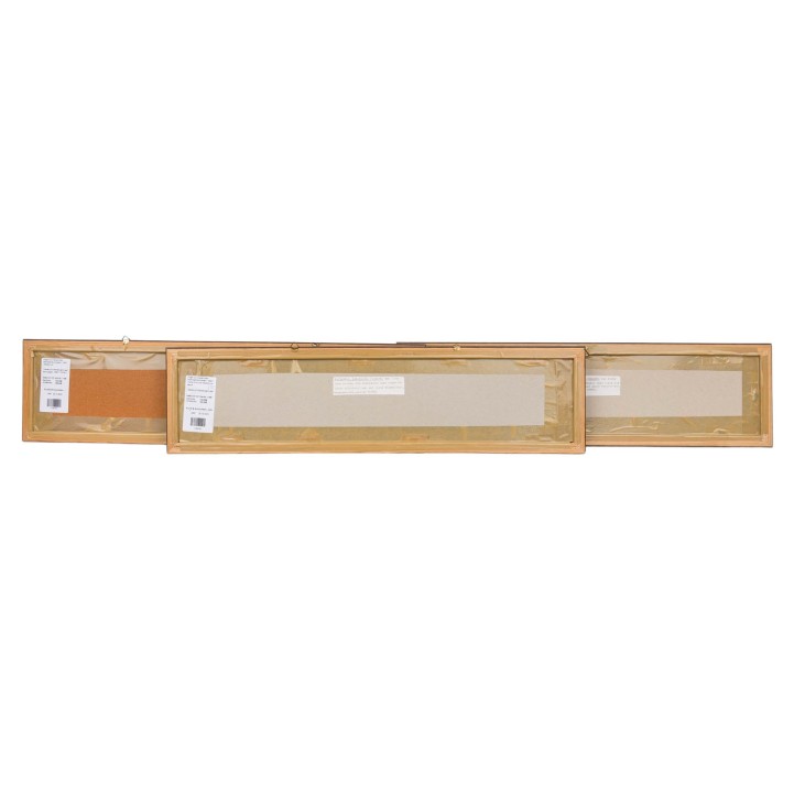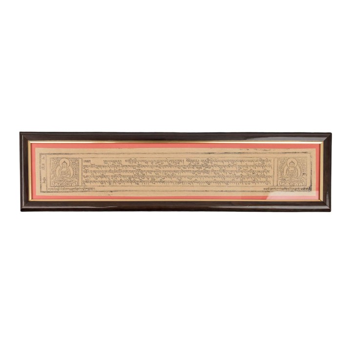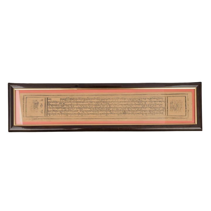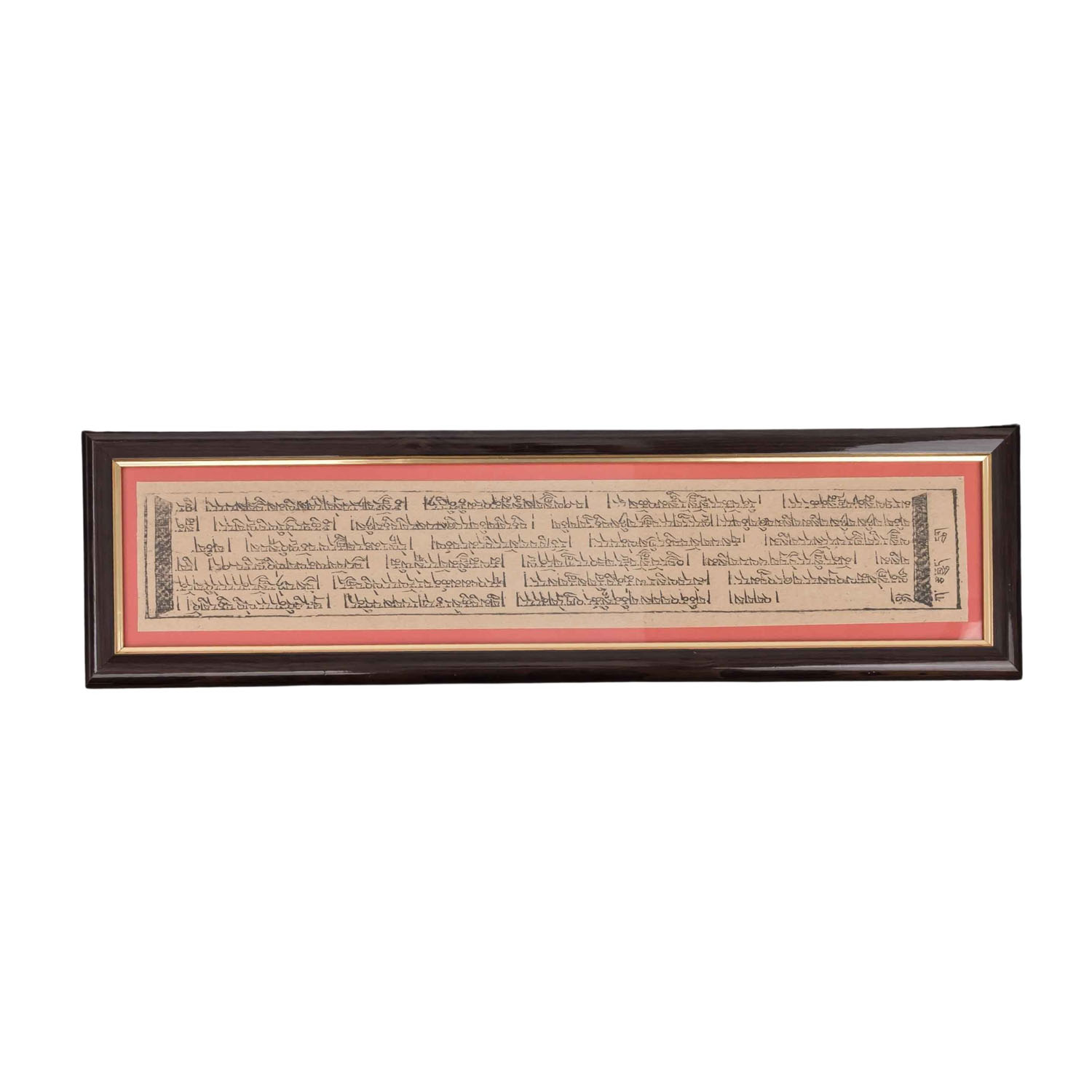 Series of 3 framed palm leaf book pages. TIBET, 15x59,5 cm and 15x53,5 cm, dam.