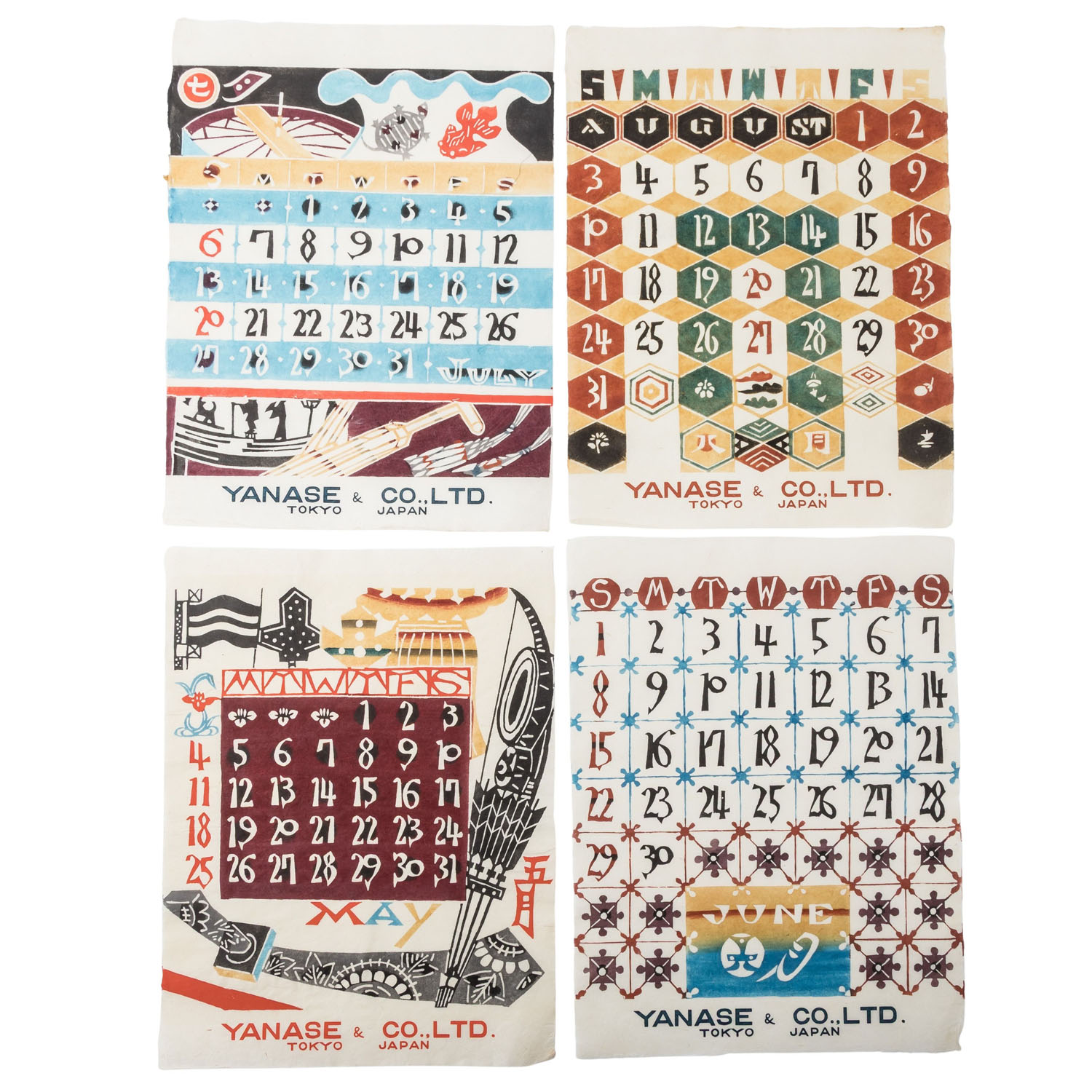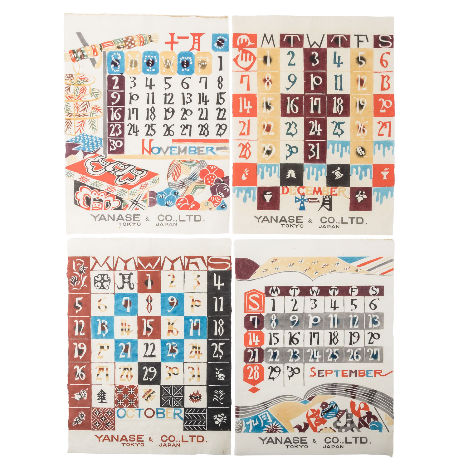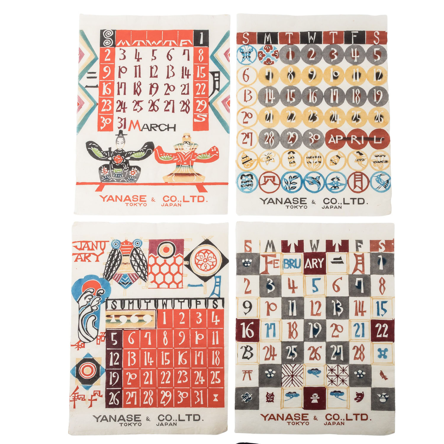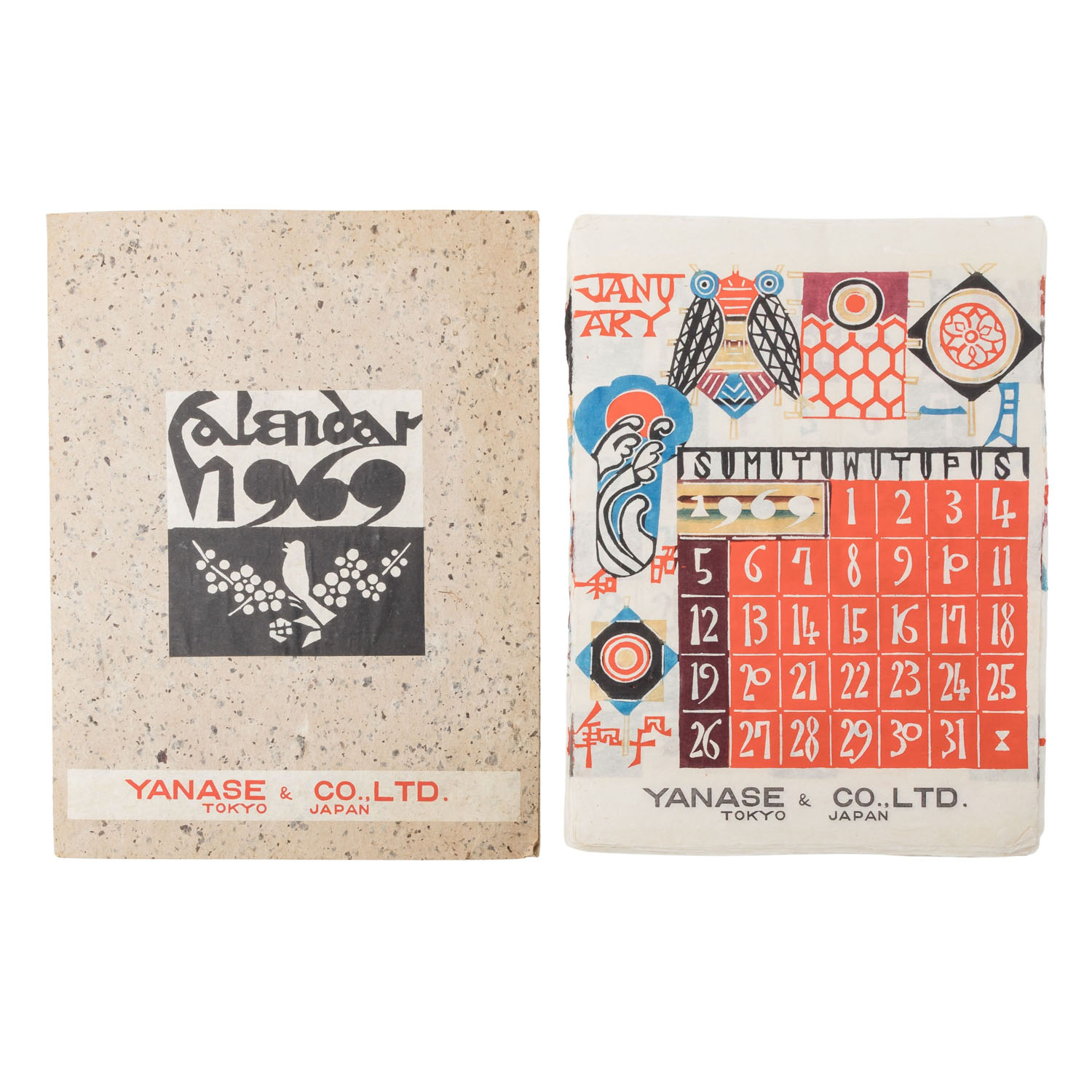 SERIZAWA, KEISUKE (1895-1984) Calendar from 1969 in the form of a folder with 12 monthly pages. This hand-printed calendar was printed on handmade Japanese paper by Japanese katazome master Keisuke Serizawa. The katazome technique is a traditional Japanese stencil technique for dyeing fabric or paper, in which a rice or paste paste is applied through a hand-cut stencil (“kata”) to protect the underlying material from dye. This version of the calendar was produced for the car dealer YANASE & CO,.LTD. TOKYO JAPAN. Signs of age and wear, folder creased at the corners.