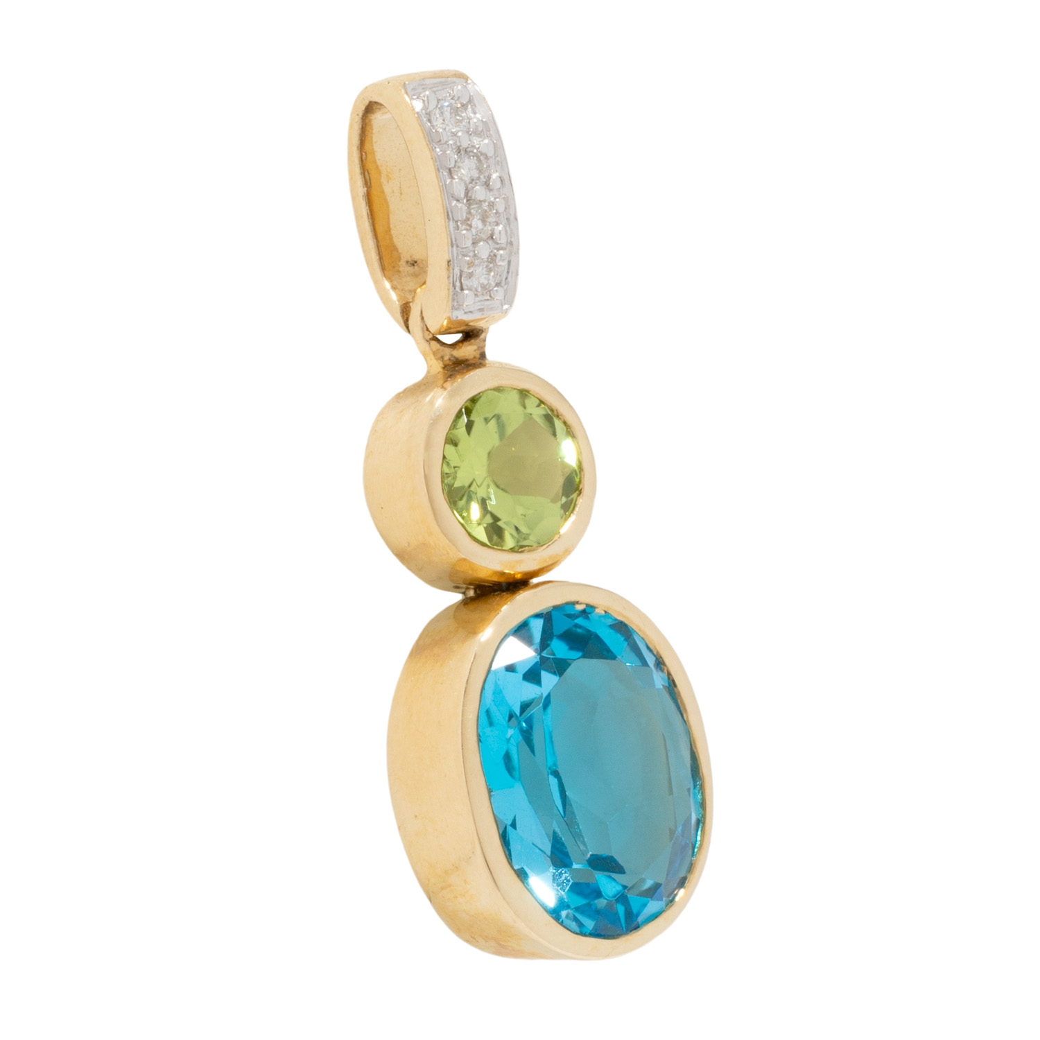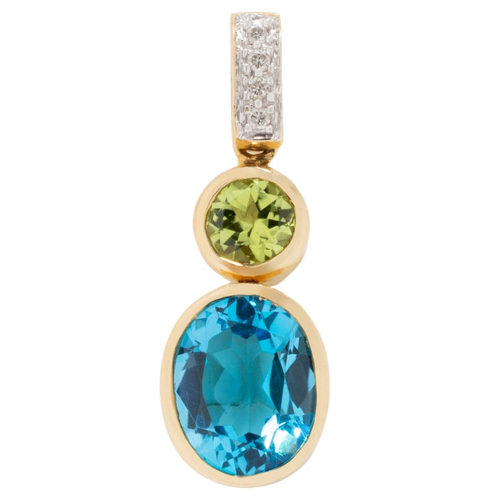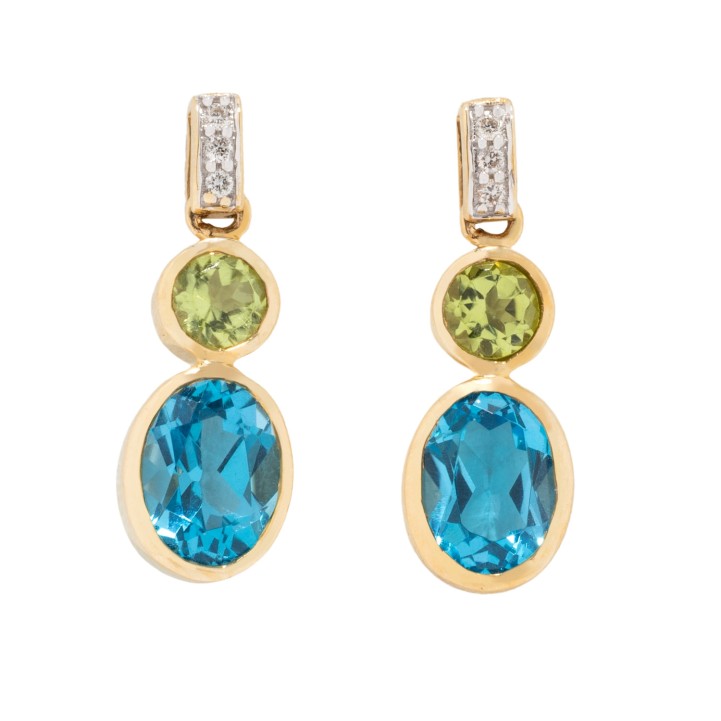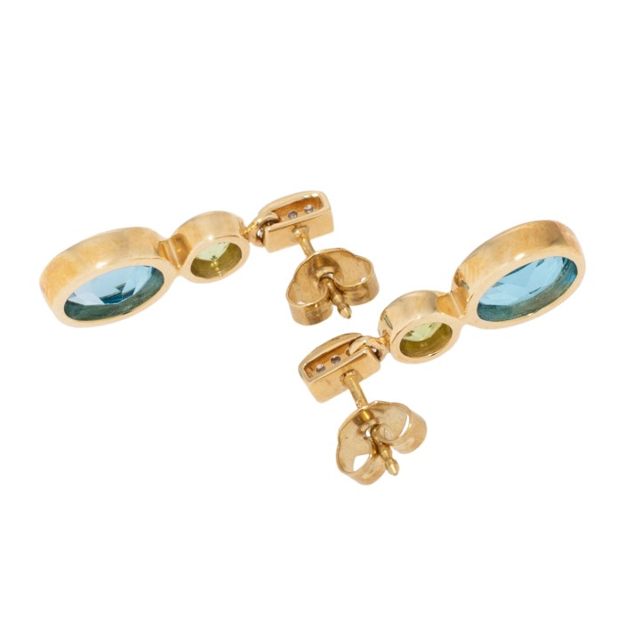 Set of earrings and pendant with blue topaz, peridote and brilliants, totall. c. 0.70ct, good colour and clarity, YG 14K, totall. 7.0g, L pendant: ca. 2.5 cm, L earrings: c. 2 cm, very good condition, hallmarked 585.