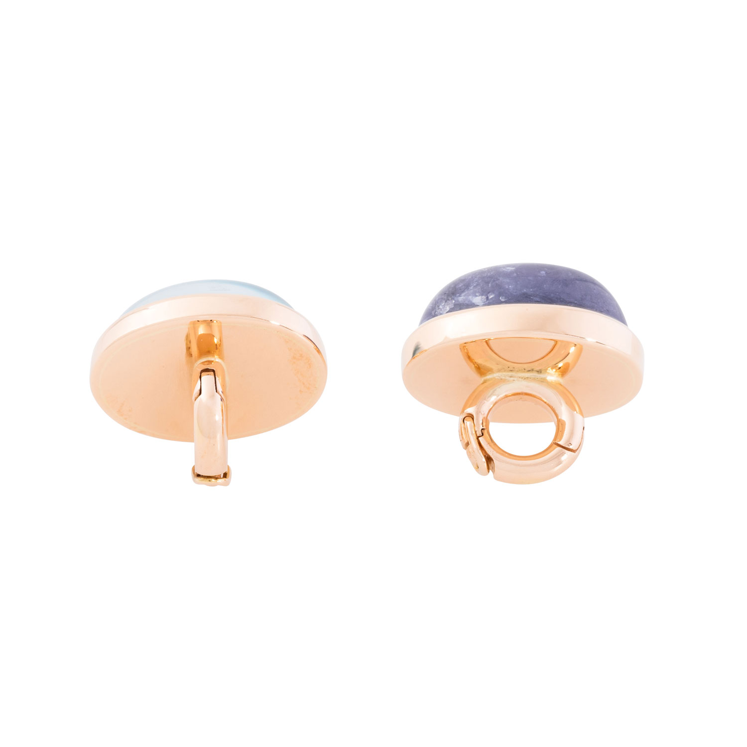 Bundle of 2 charms with oval cabochon-cut blue topaz and tanzanite, 18K yellow gold, 15.1 g, 1,8x1,4 cm, with clip-loops, 21st century, mint condition.