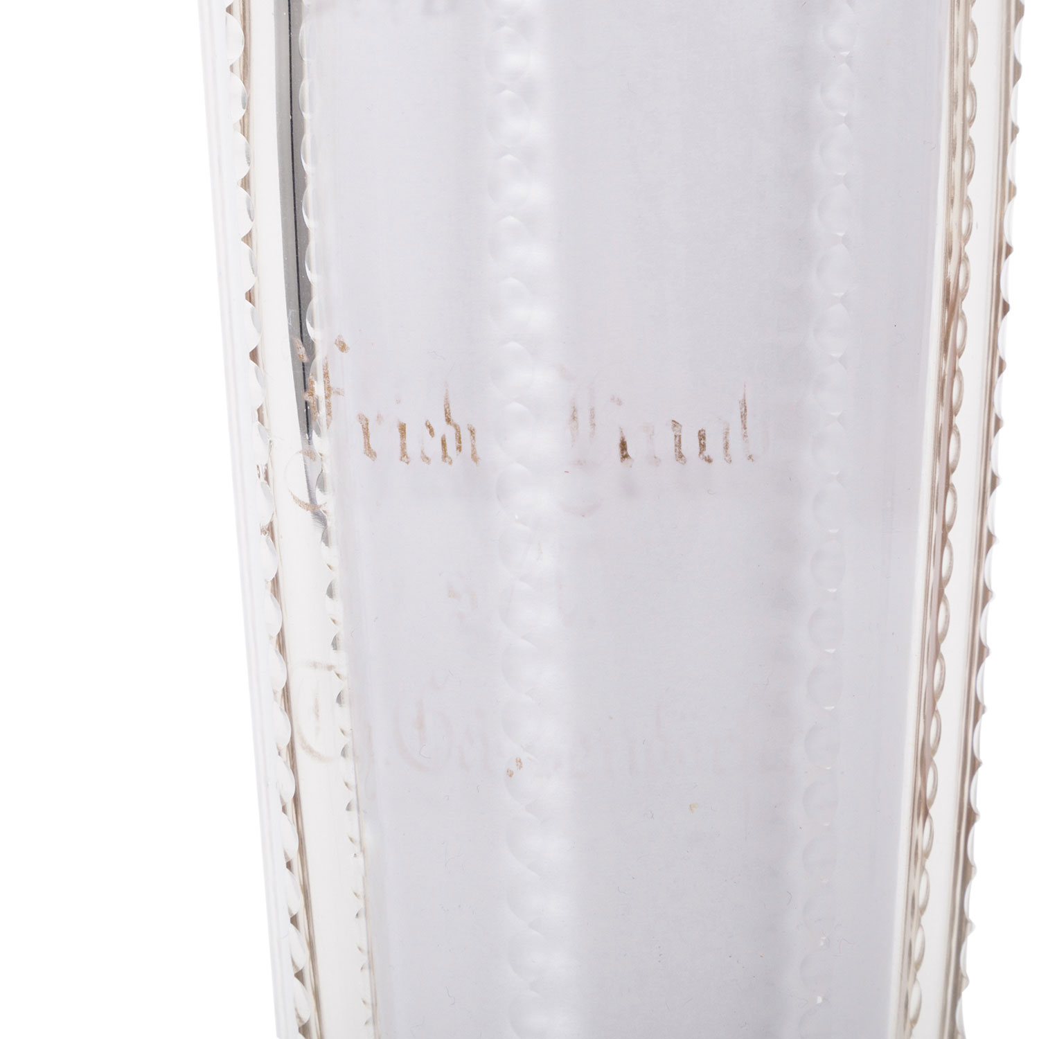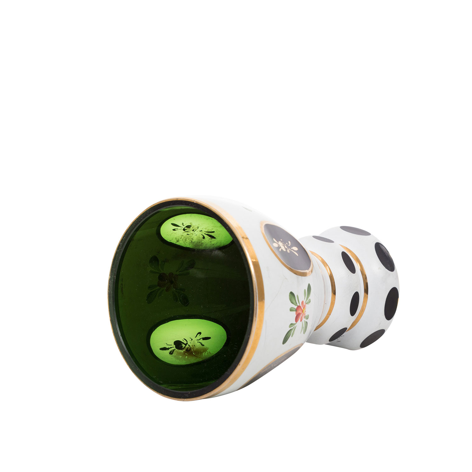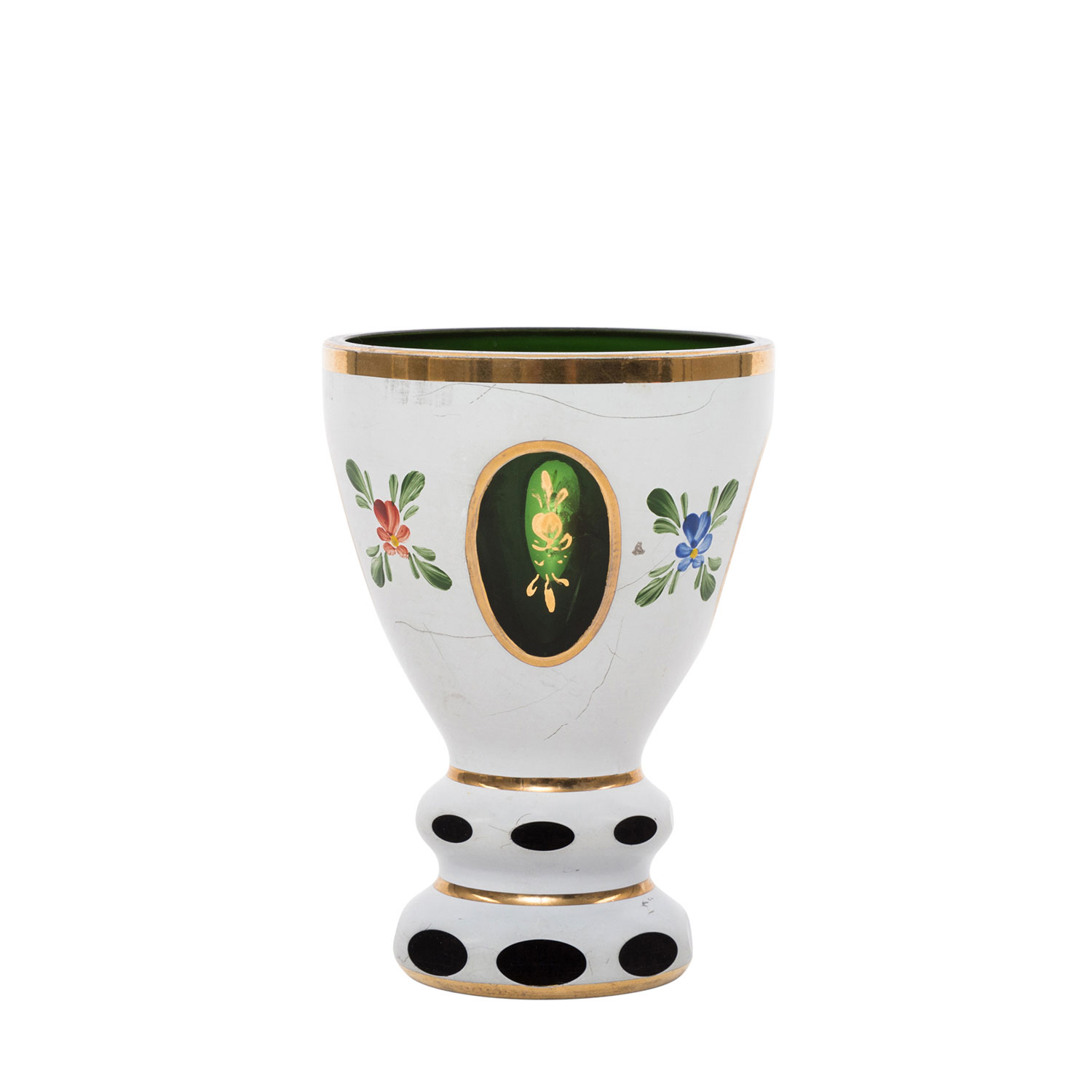 Mixed lot of 2 glasses, 19th/20th century: small Biedermeier beaker, green with white overlay and polychrome flower painting, h. approx. 10cm, rubbed, scratches, souvenir glass on multi-pass round stand, clear glass, in cartouche monogram, writing heavily rubbed, h. approx. 19.5, signs of age and use.