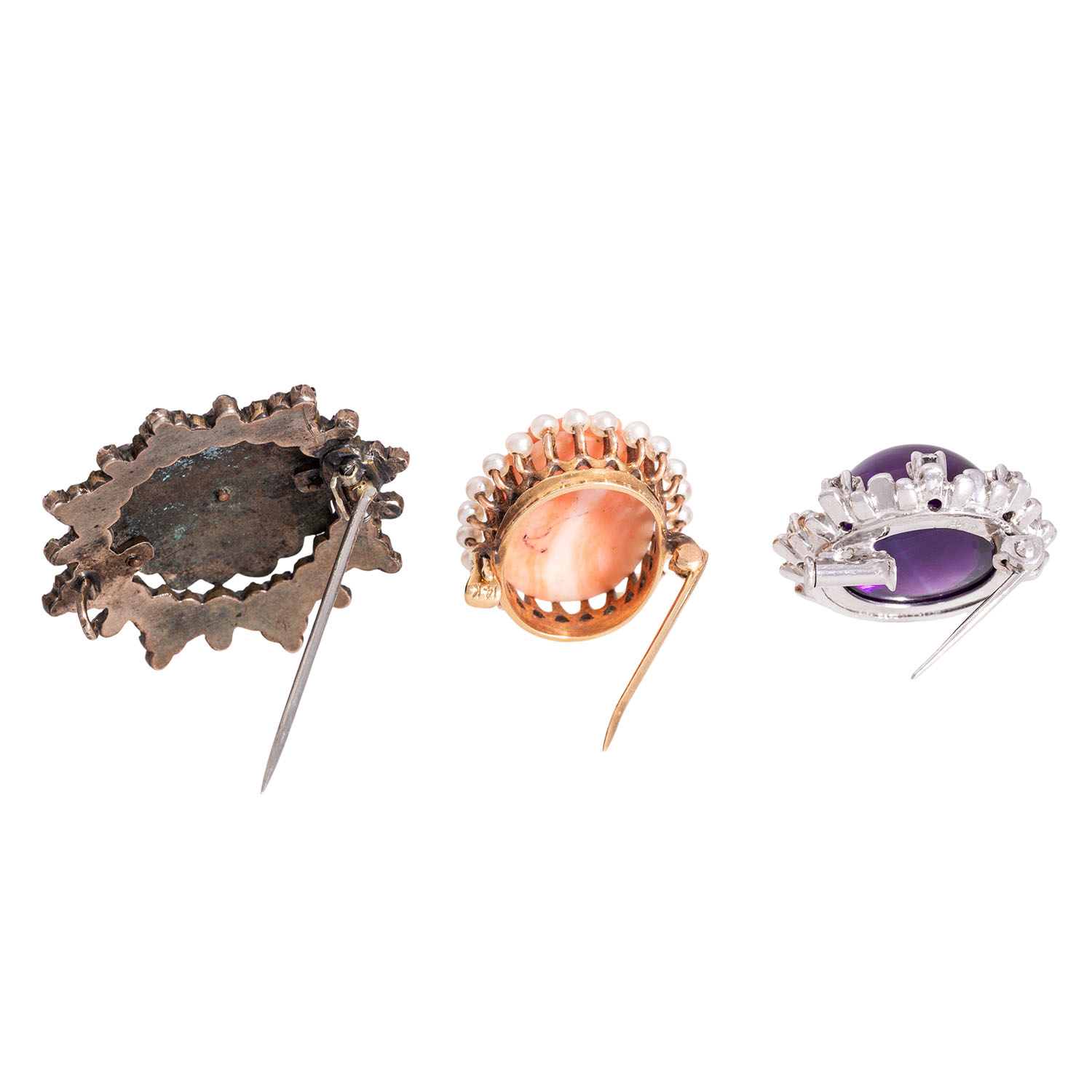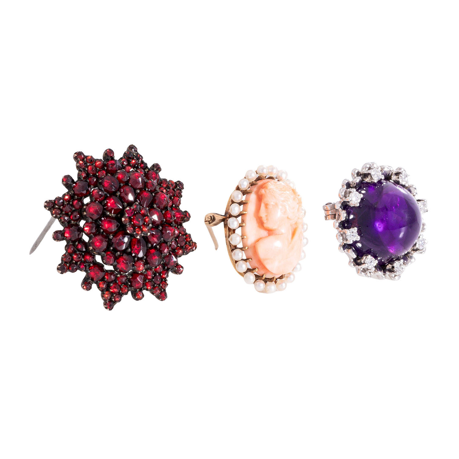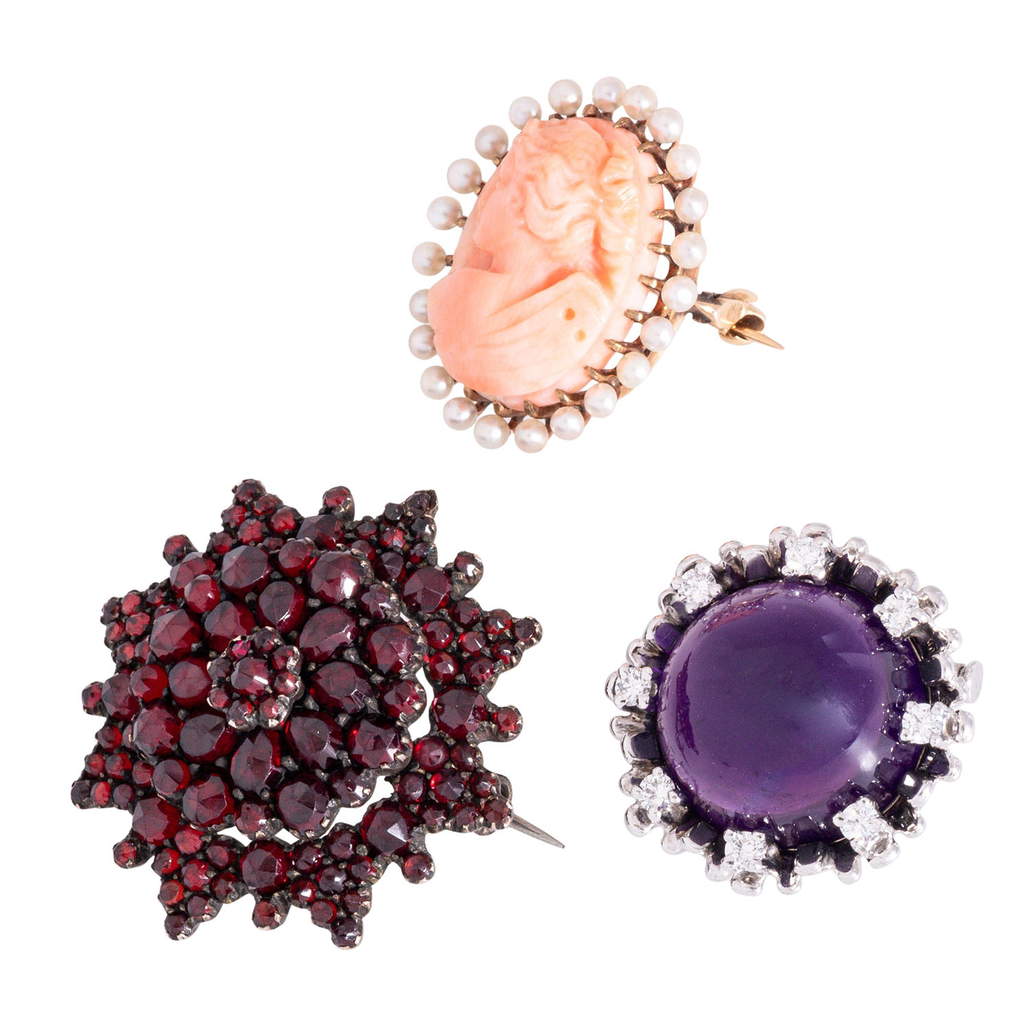 Bundle of 3 brooches, #1: 18K WG, 9.2 g, amethyst cabochon, small brilliant-cut diamonds totalling ca. 0.24 ct, good colour a. clarity, D: ca. 2 cm, maker's mark Richard Baur // #2: 14K YG, 4.5 g, coral, pearls // #3: silver/copper alloy with garnets, D. ca. 3 cm, 20th century, signs of wear, NO SHIPPING OUTSIDE THE EU!