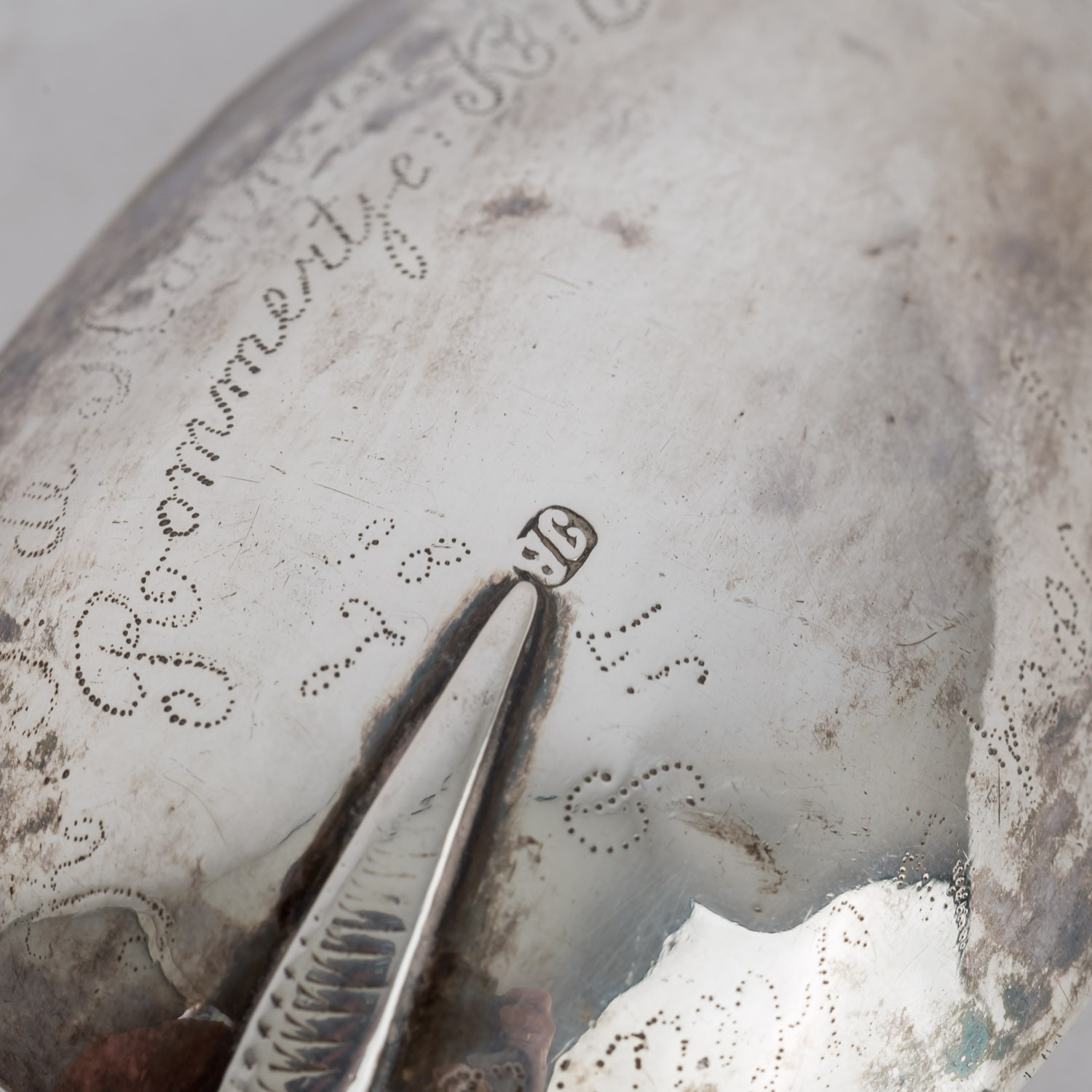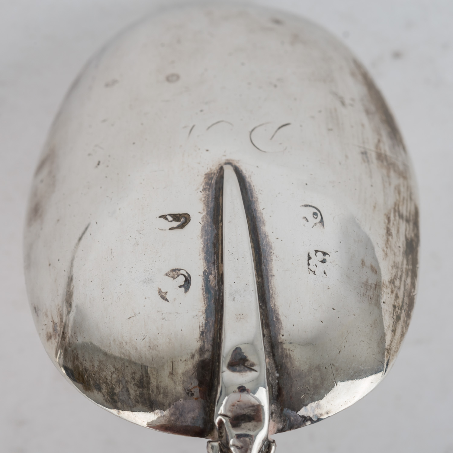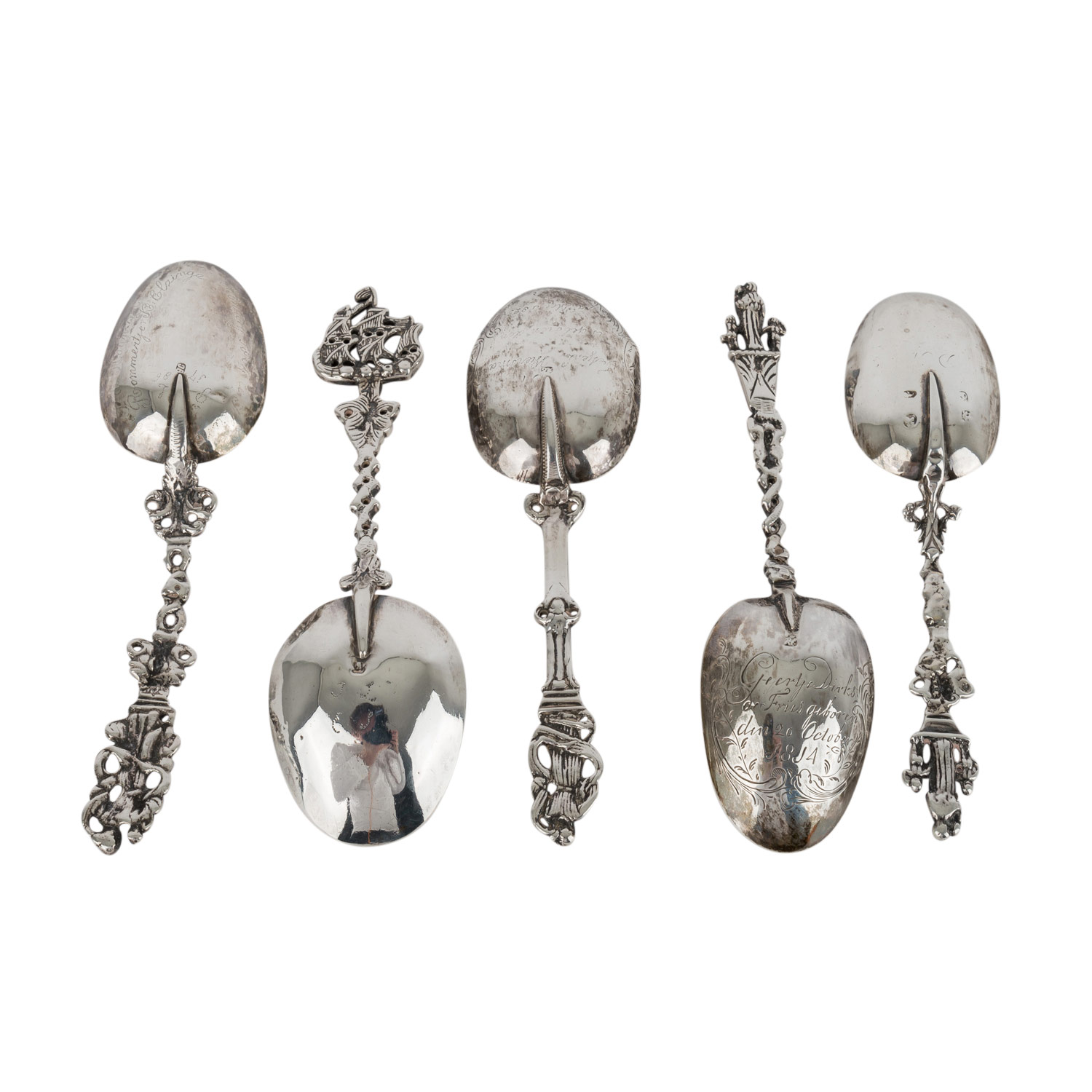 Set of 5 Andean spoons, 19th century, figural handle, the back of the bowl partly engraved, marks worn, l. approx. 17.5 - 19 cm. Signs of age and use.