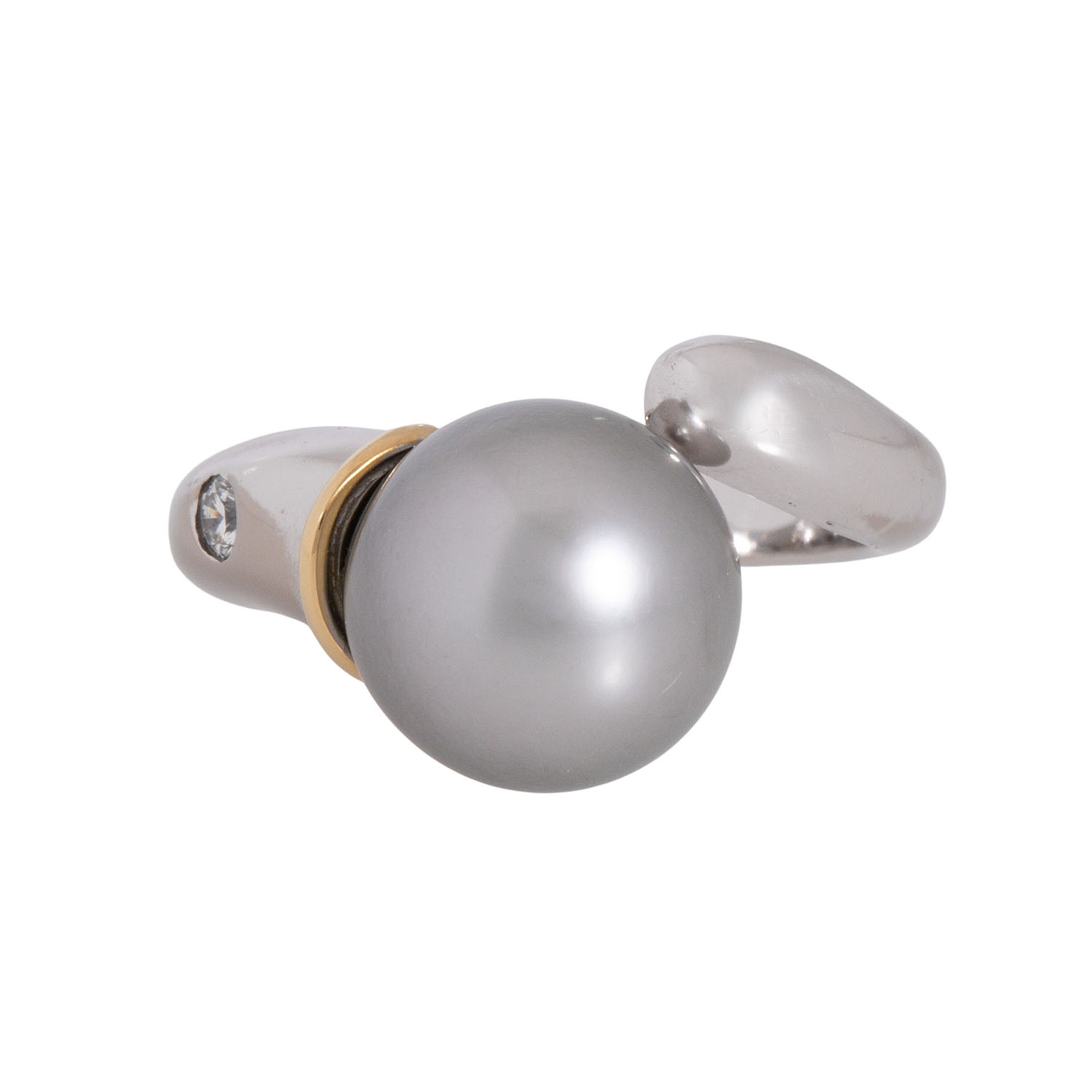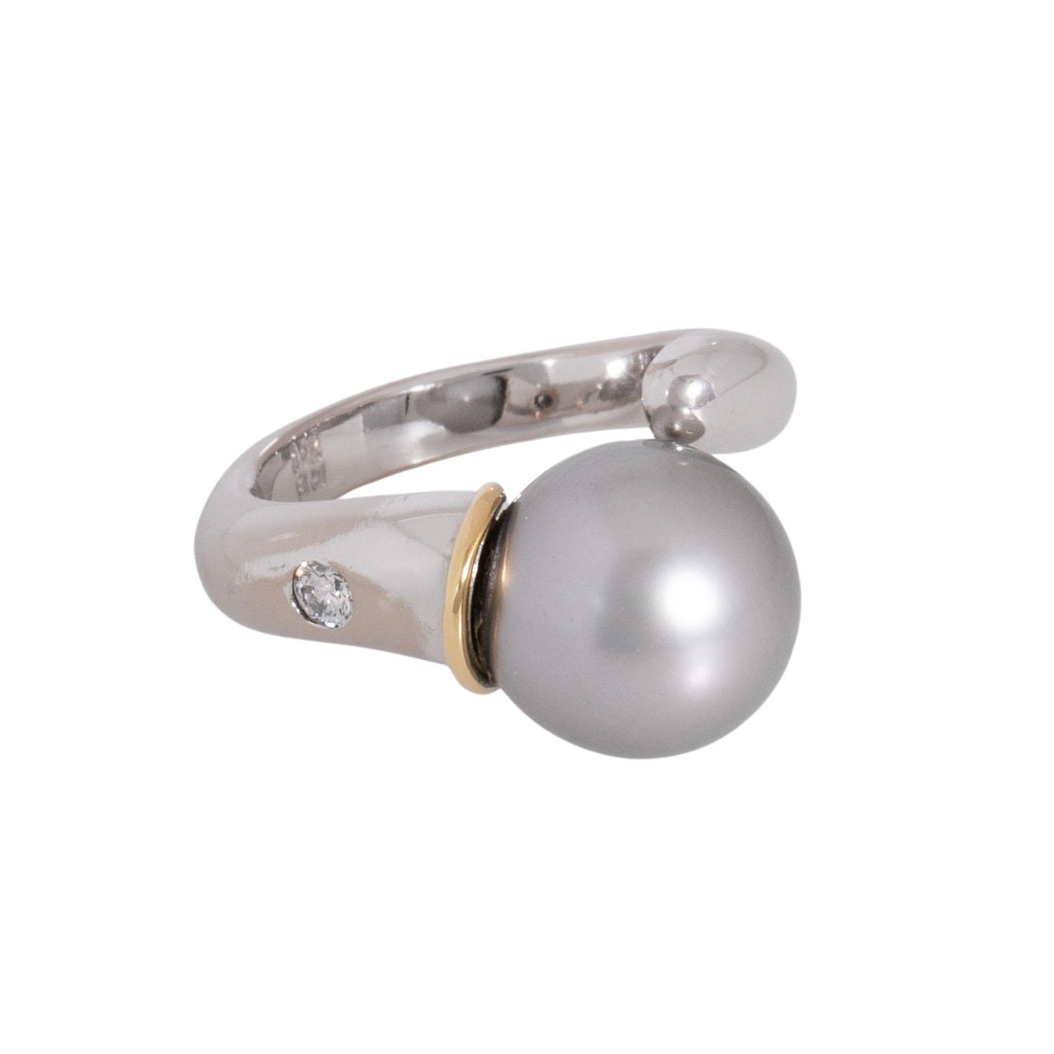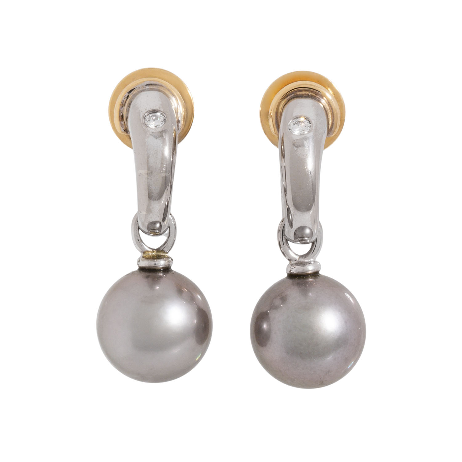 Jewel set ring and earrings with Tahiti cultured pearls 12 mm and brilliant-cut diamonds totalling ca. 0.2 ct, 18K white and yellow gold, 27.6 g, ring size 53, earrings with removable pearl pendants, 20th/21st century, minor signs of wear, marked 'RB', high quality workmanship.