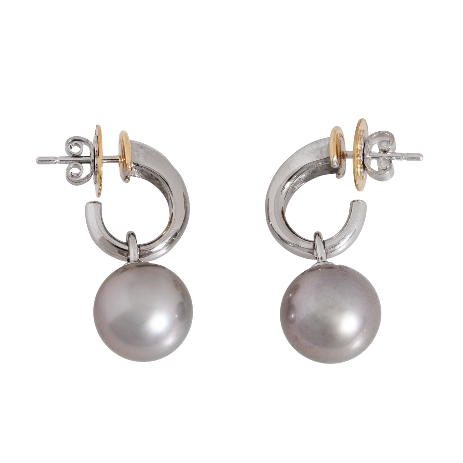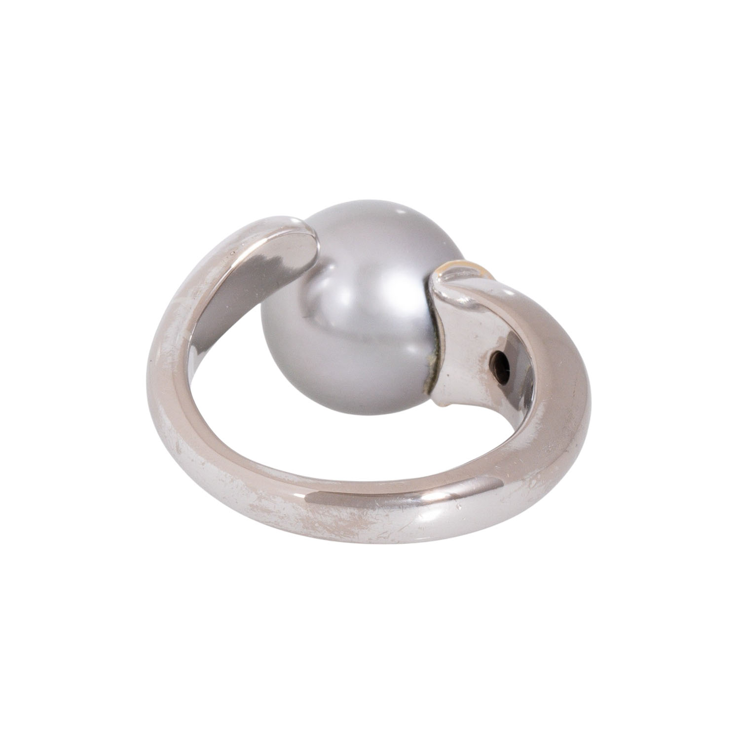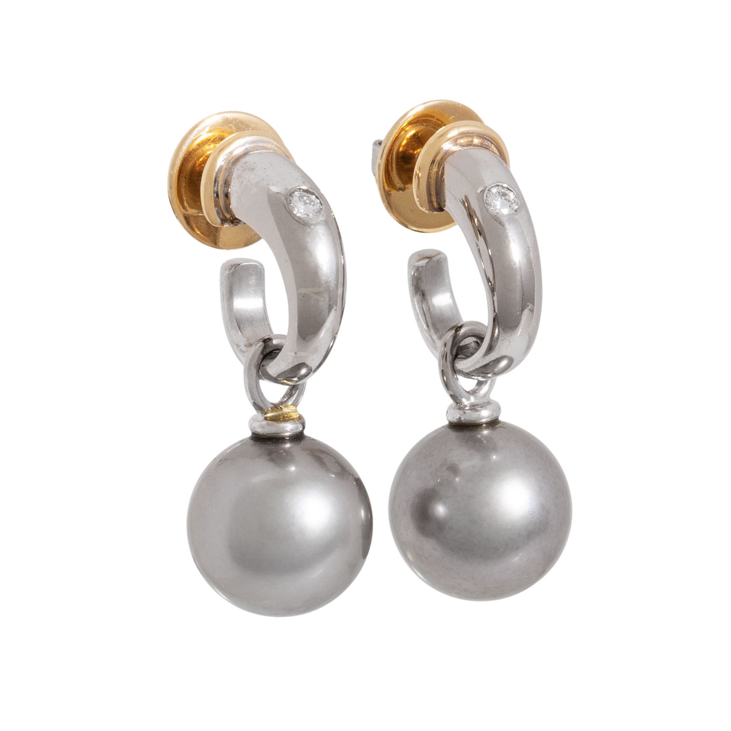 Jewel set ring and earrings with Tahiti cultured pearls 12 mm and brilliant-cut diamonds totalling ca. 0.2 ct, 18K white and yellow gold, 27.6 g, ring size 53, earrings with removable pearl pendants, 20th/21st century, minor signs of wear, marked 'RB', high quality workmanship.