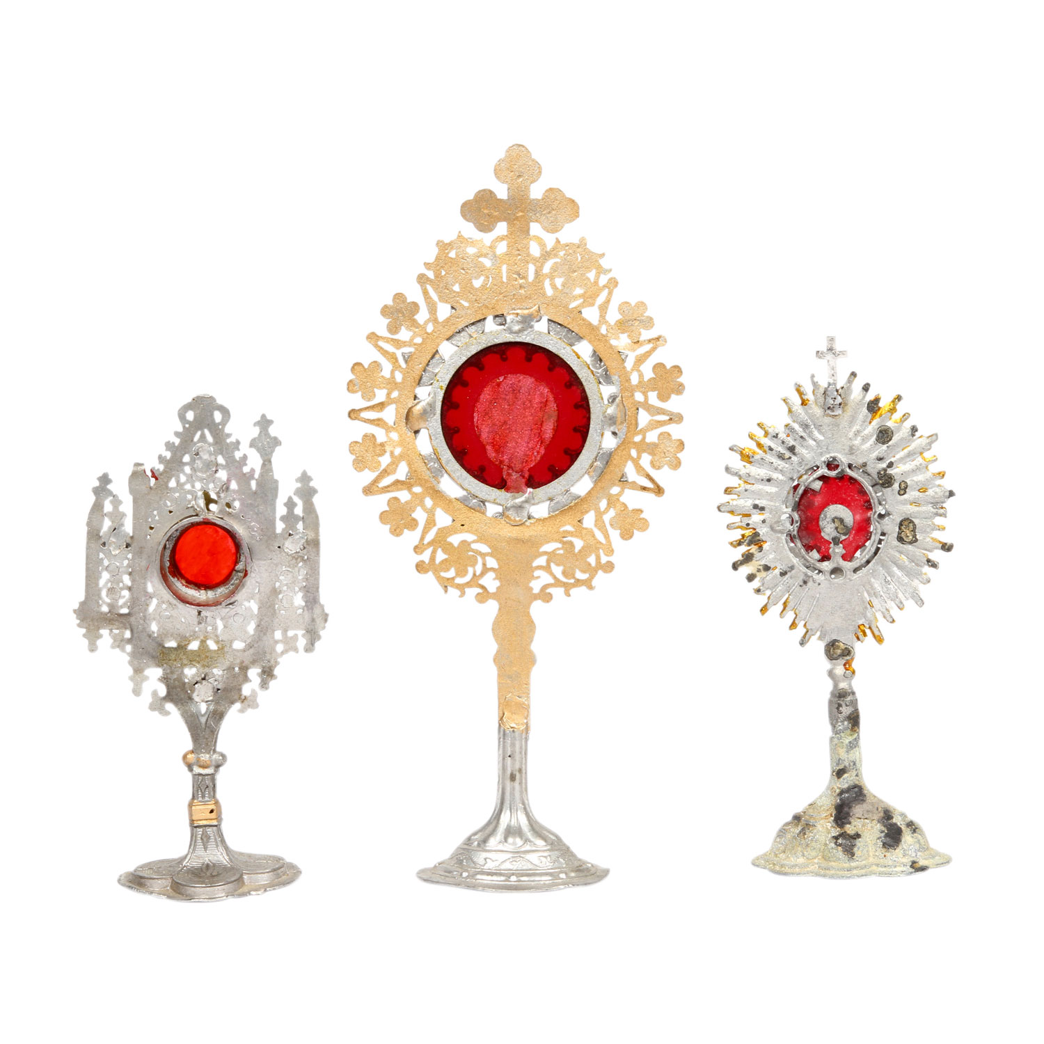 Mixed lot of three monstrances, 19th/20th century, pewter, 1x w. Set with stones. Signs of age, 1x missing part, h. approx. 10/15 cm.