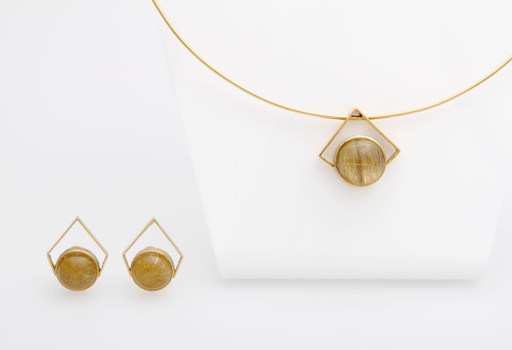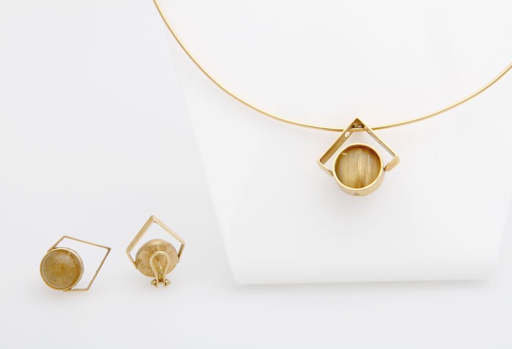 Set: Pendant on choker and pair of clip ear studs, each with a rutilated quartz cat's eye,