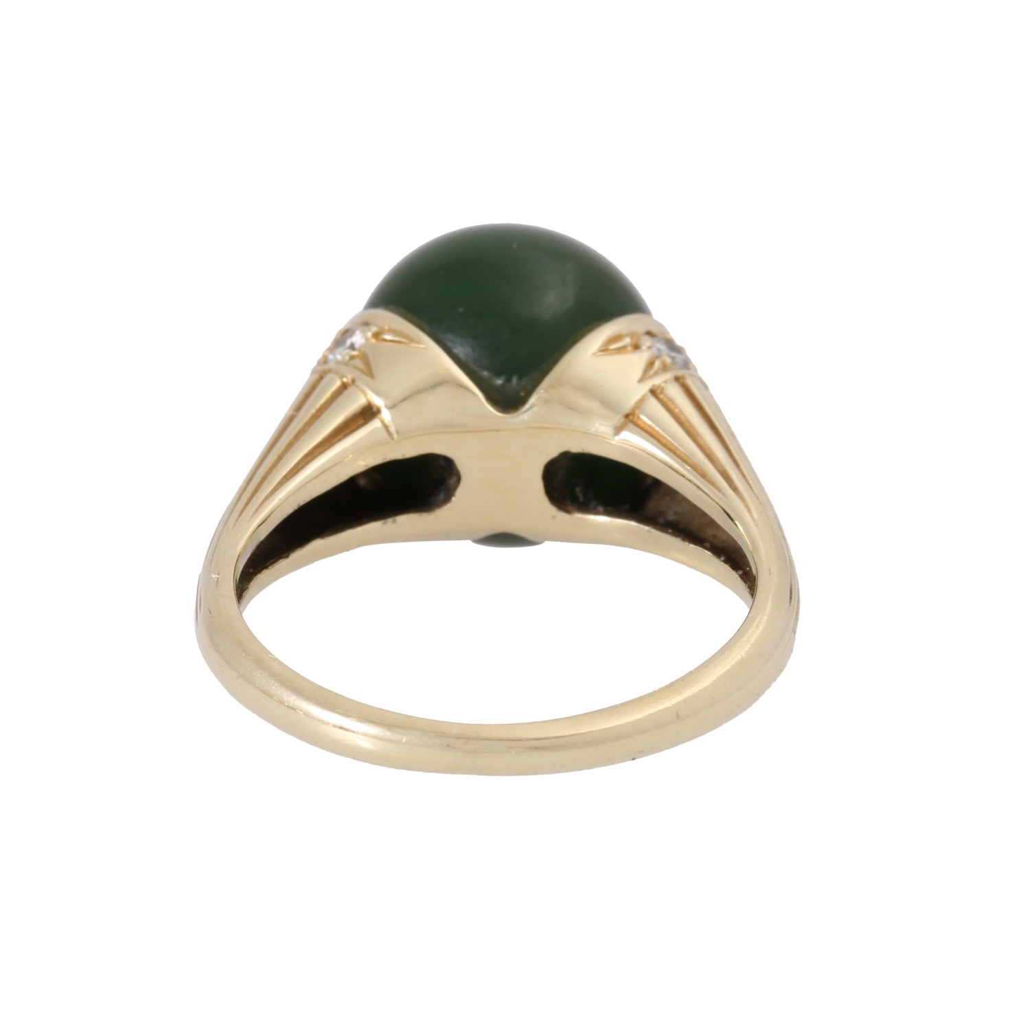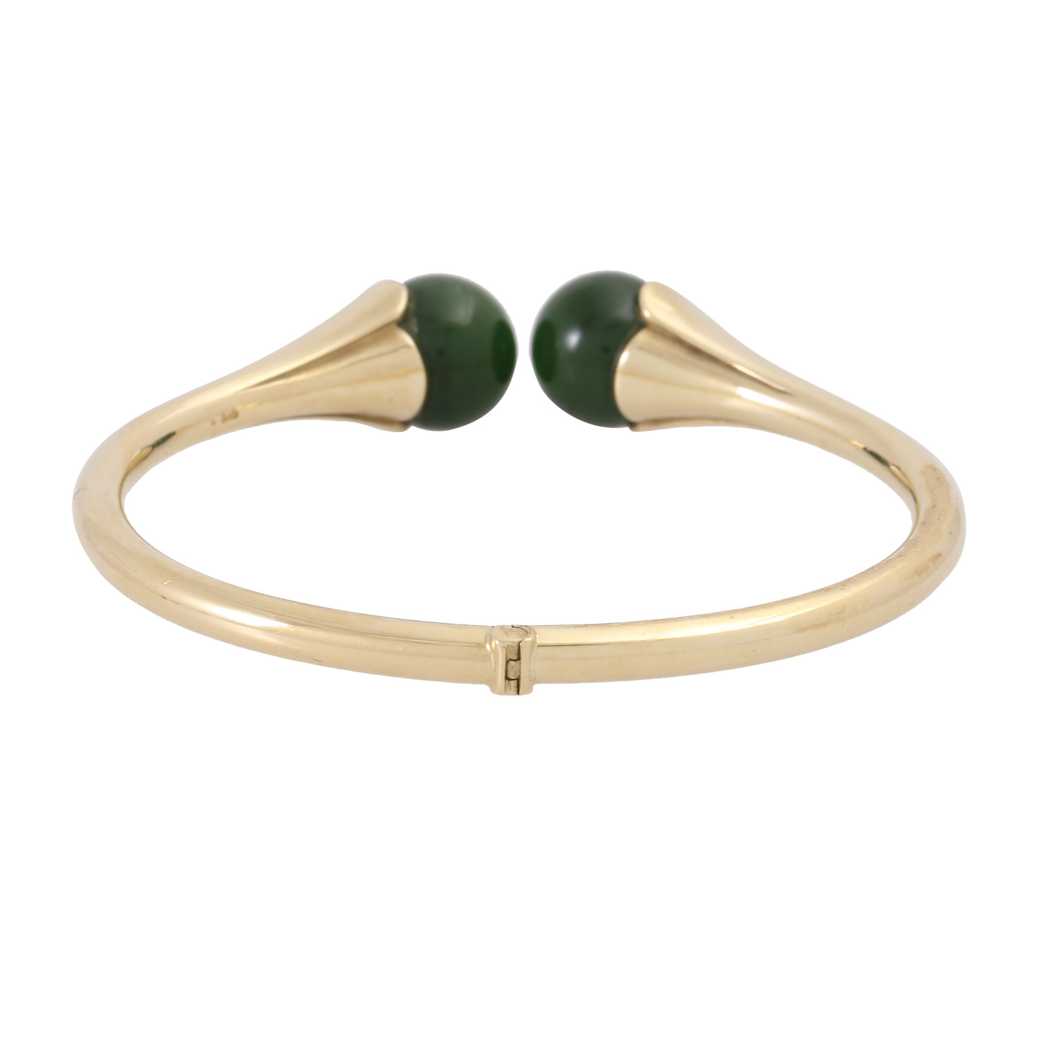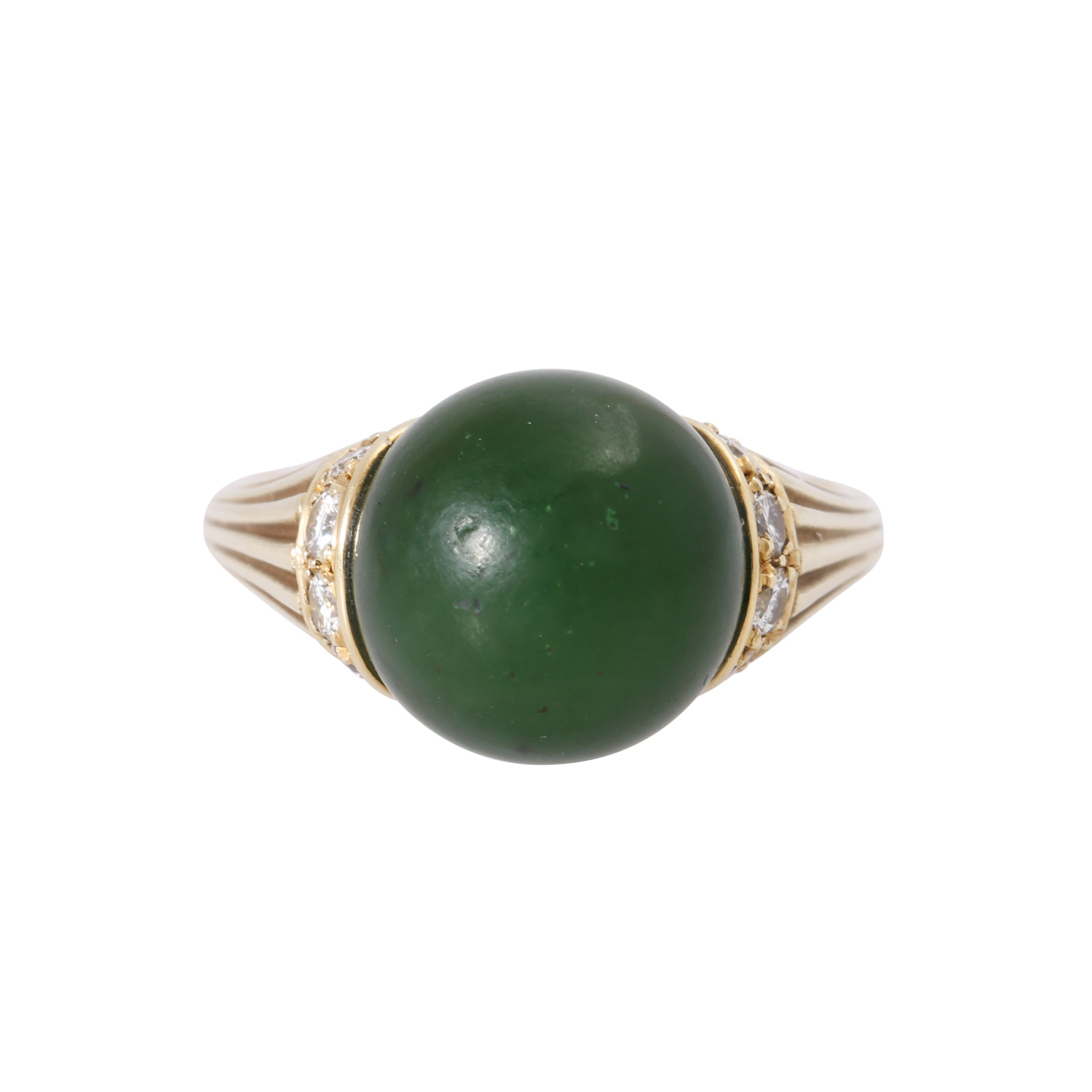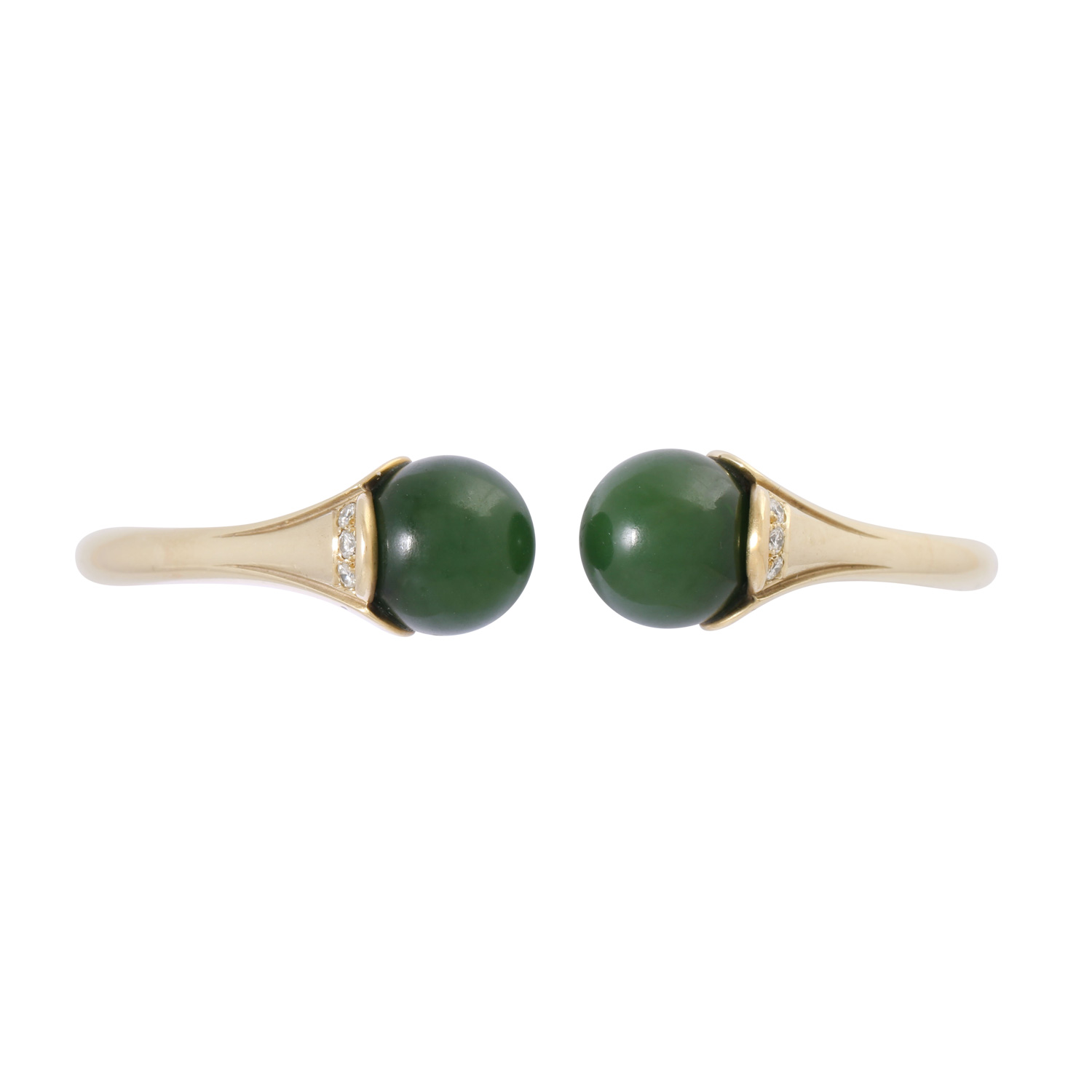 Set: Ring and bracelet with 3 jade balls, Ring: jade ball D: ca. 11 mm, 8 brilliant cut diamonds, totalling ca. 0.2 ct, WHITE (H)/VS, ring size 53. bracelet: 2 jade balls D: ca. 12 mm, 6 brilliant cut diamonds, totalling ca. 0.12 ct, WHITE (H)/VS, inner circumference ca. 16.5 cm, 14K yellow gold, 27.2 g, late 20th century, minimal signs of wear.