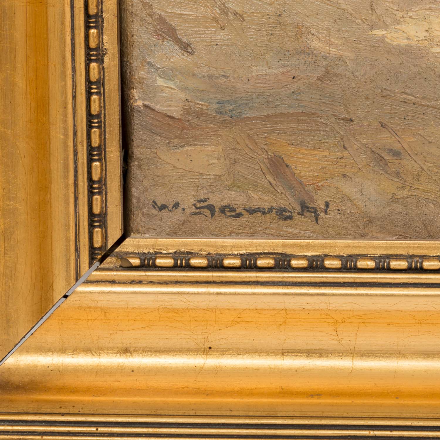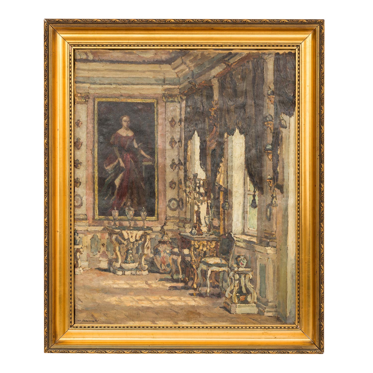 SEWOHL, WALDEMAR (Wismar 1887-1967 / 69 Berlin), 'Castle interior with a portrait of a woman', with Rococo furniture, signed, oil / canvas, HxW: approx. 62x50 cm (74x62 cm with frame). Corrugated canvas and part at the upper edge. detached from the stretcher, minimal. color rubbing, stains and varnish yellow, in need of restoration. With frame (minimally damaged). Study rejected on CANVAS back.