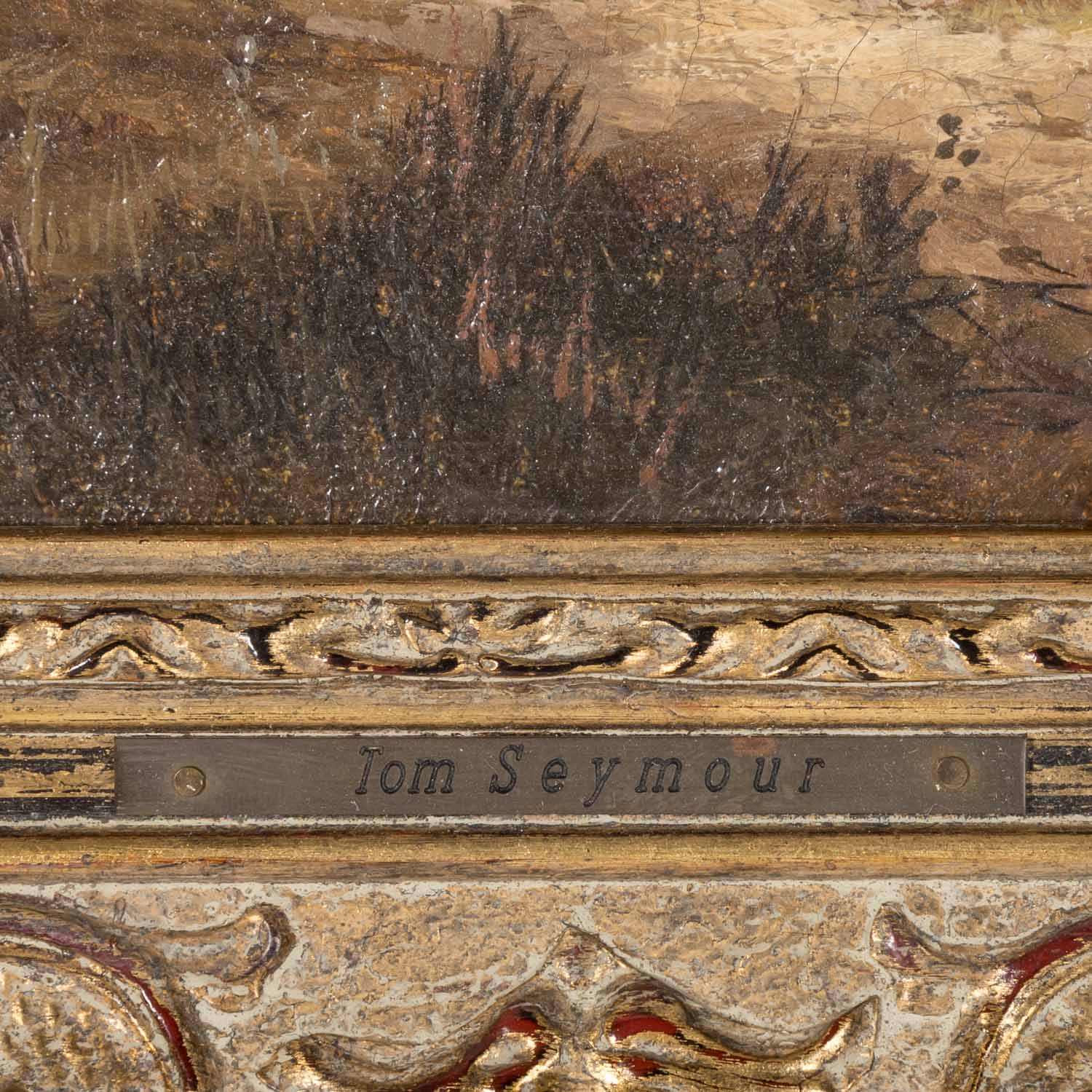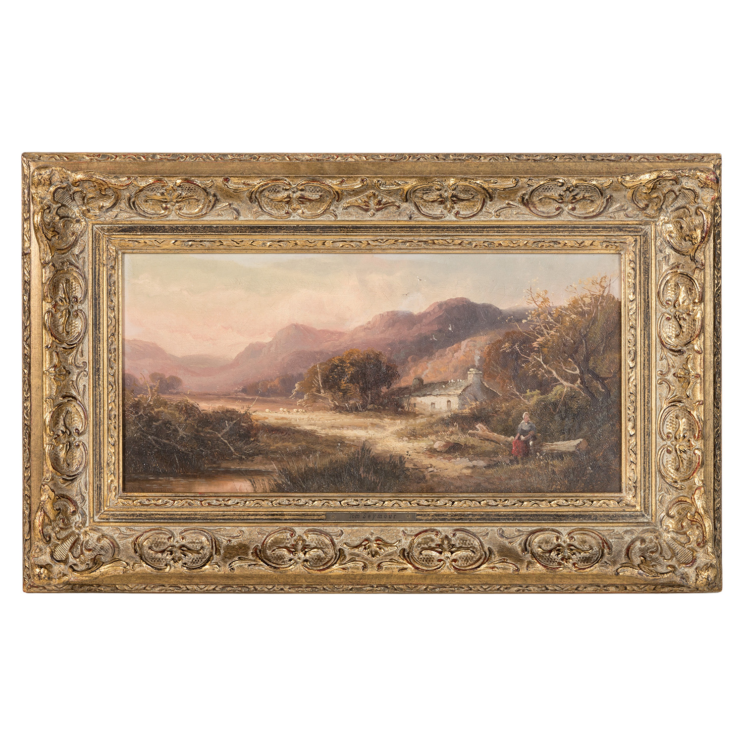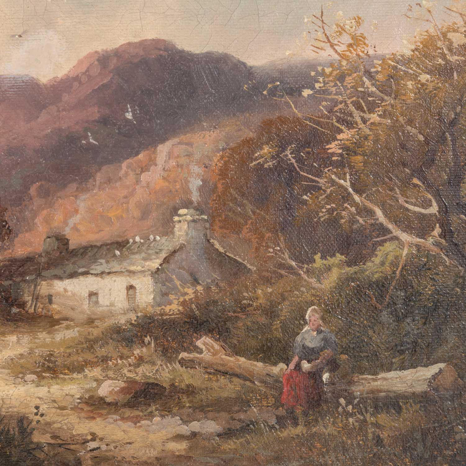 SEYMOUR, TOM (1844-1904) ‘Sunset with farm and woman on a tree stump’