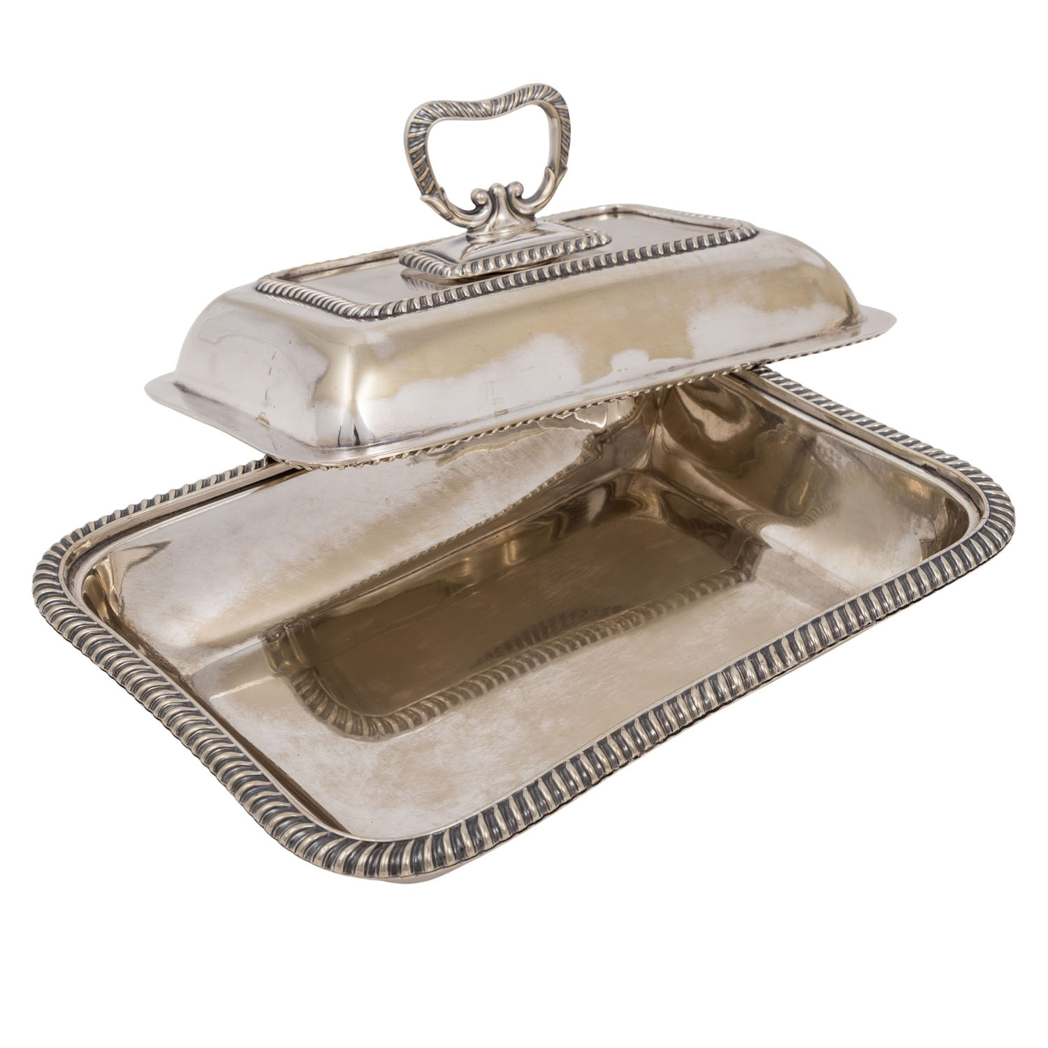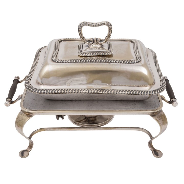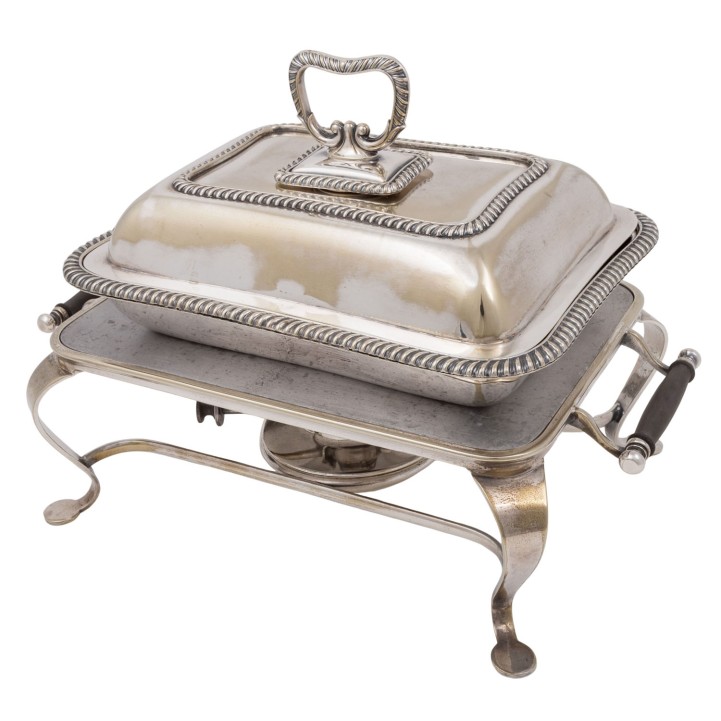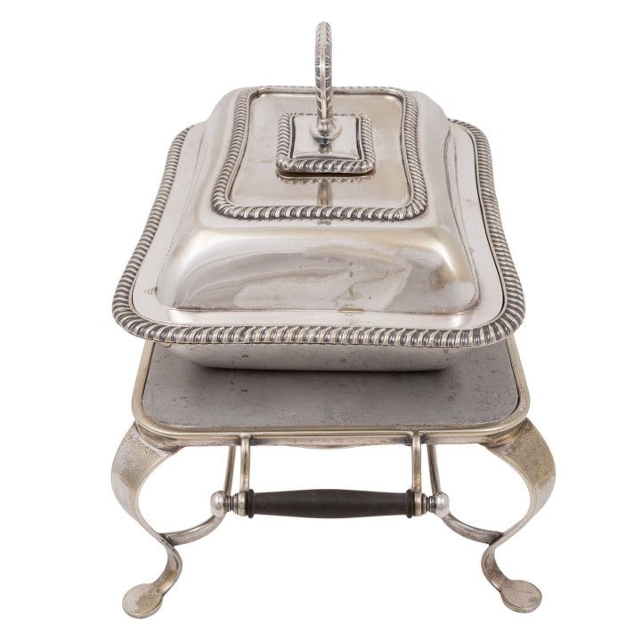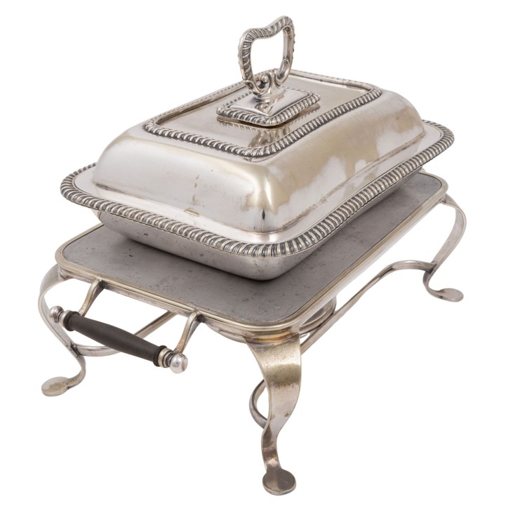 SHEFFIELD Warming vessel and chafing dish, silver-plated, circa 1900. Lidded bowl with corded decorative rim, removable handle, hallmarked “L & W S” (LEE & WIGFULL), approx. 14x28x21 cm, plus a chafing dish with warming plate and burner, no manufacturer's details, approx. 11.5x37x23 cm. Handle loose, heavily rubbed, signs of age and use.