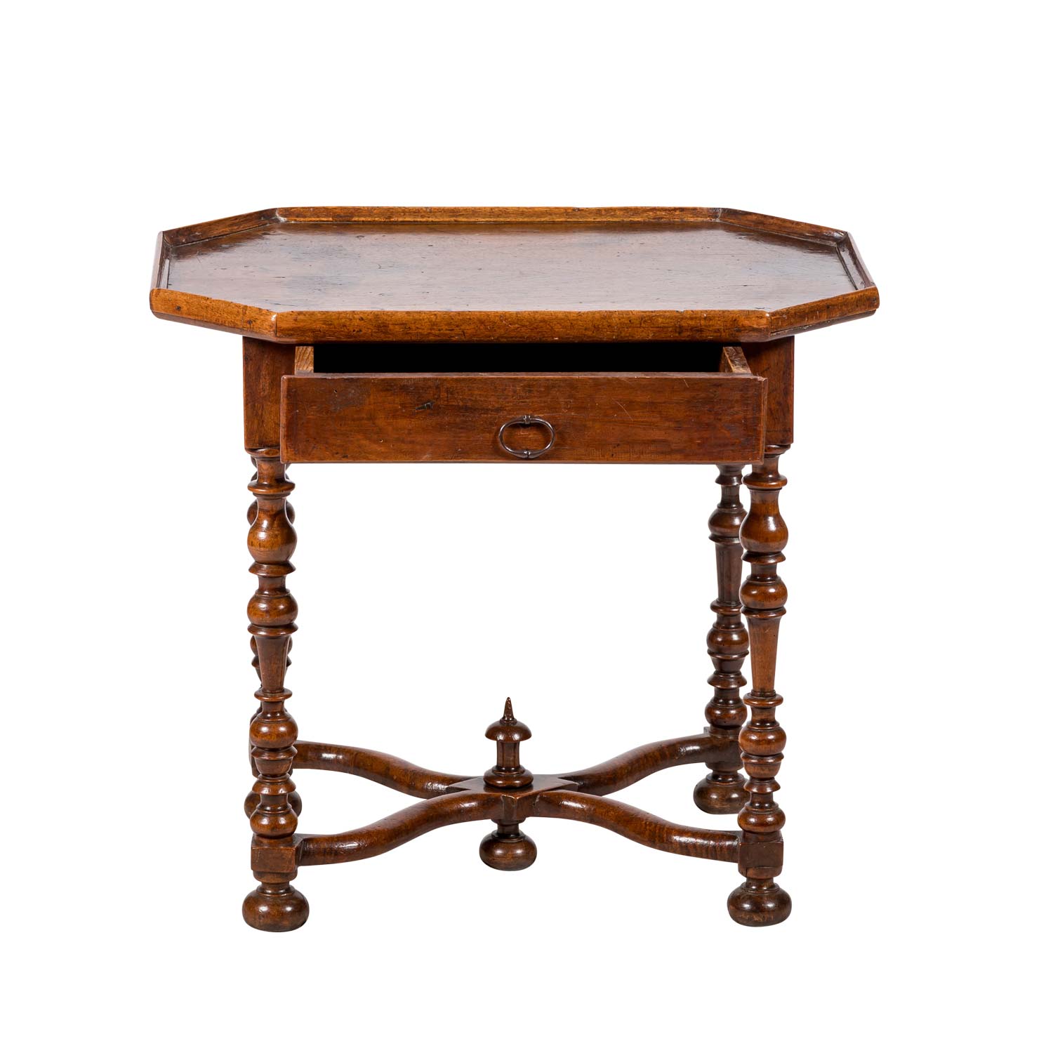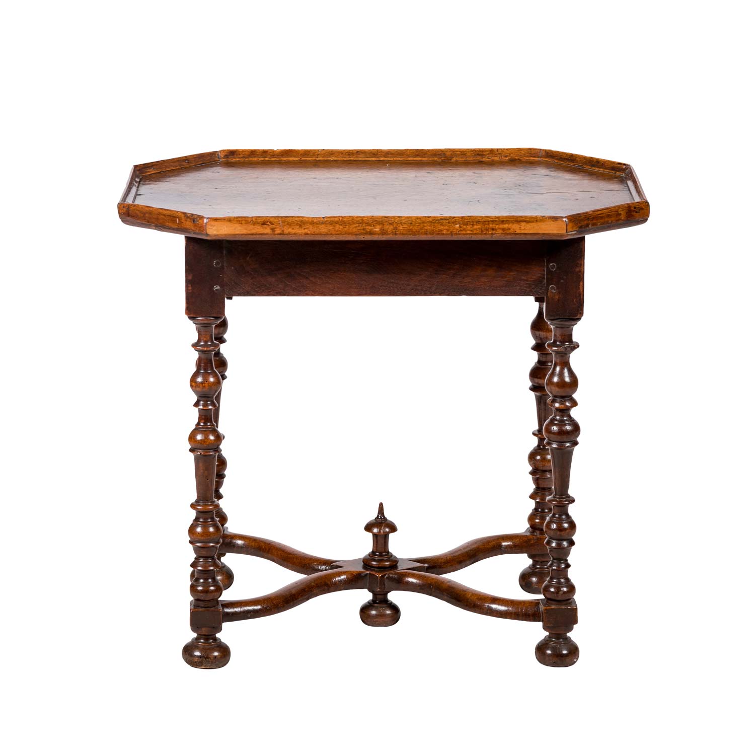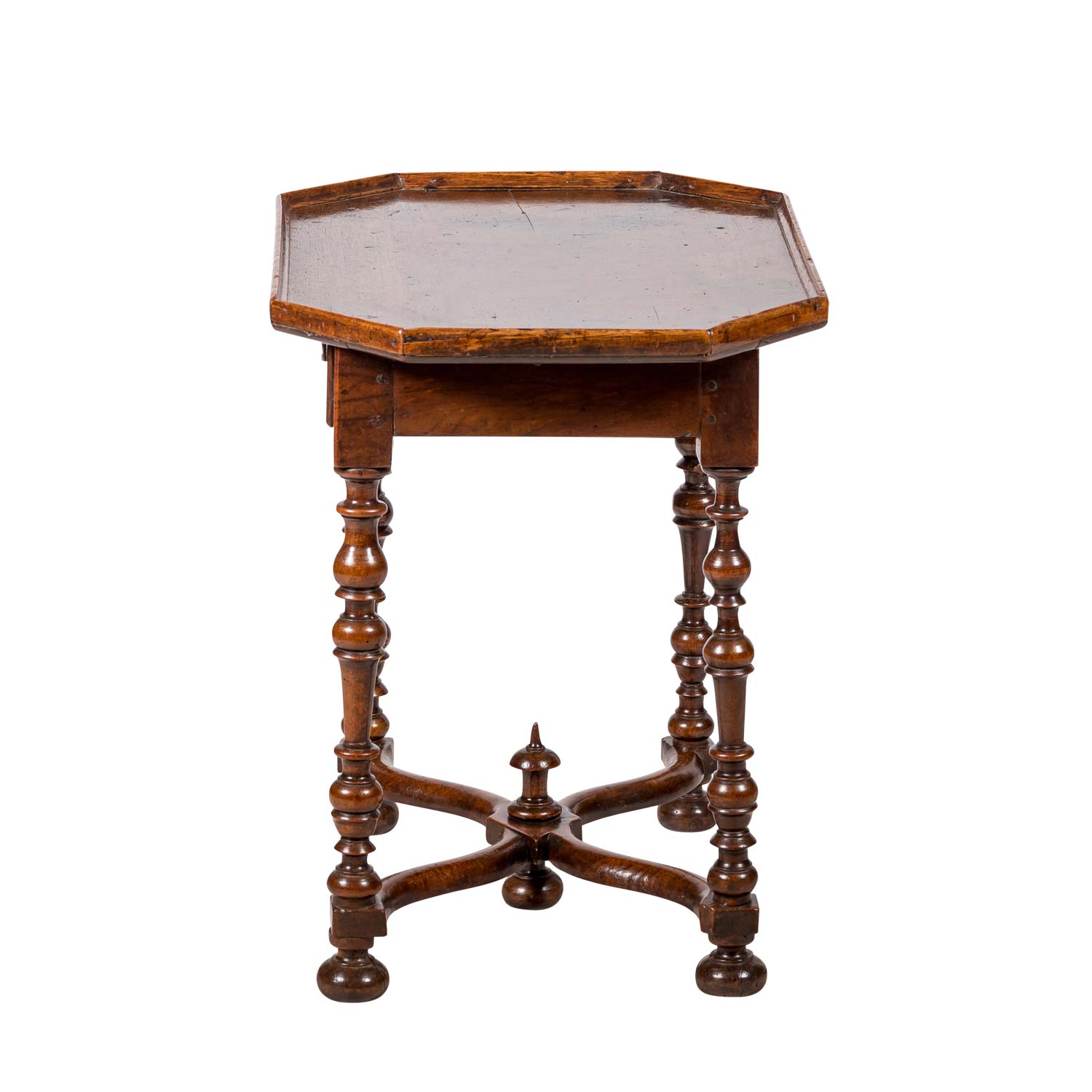 France, 19th century, turned oak, rectangular top over baluster-like legs with X-bar, hxwxd: 62/67/46 cm. Signs of use.
