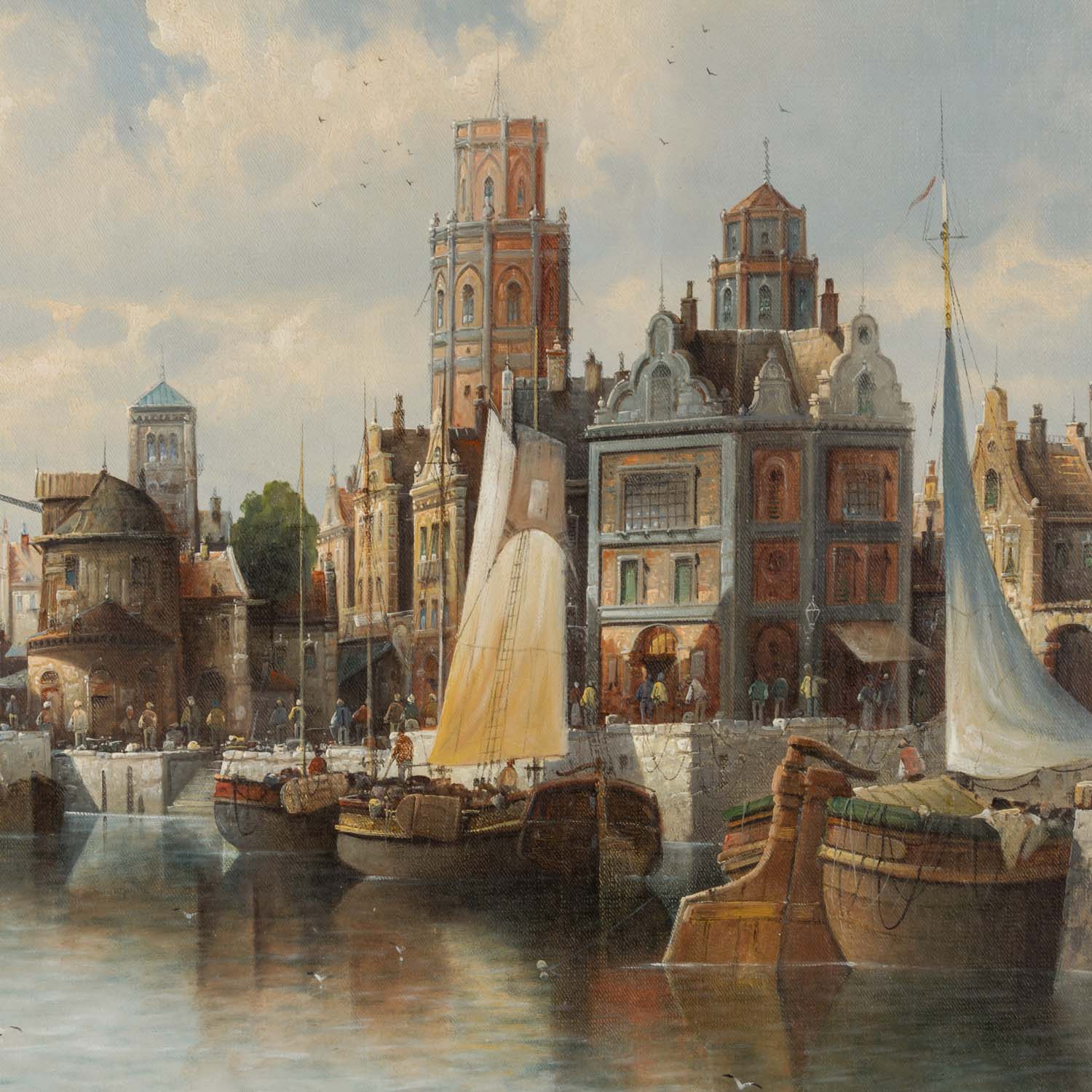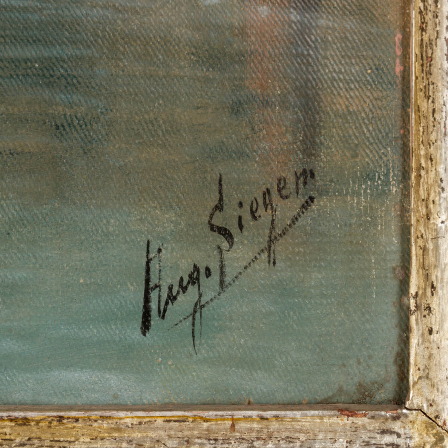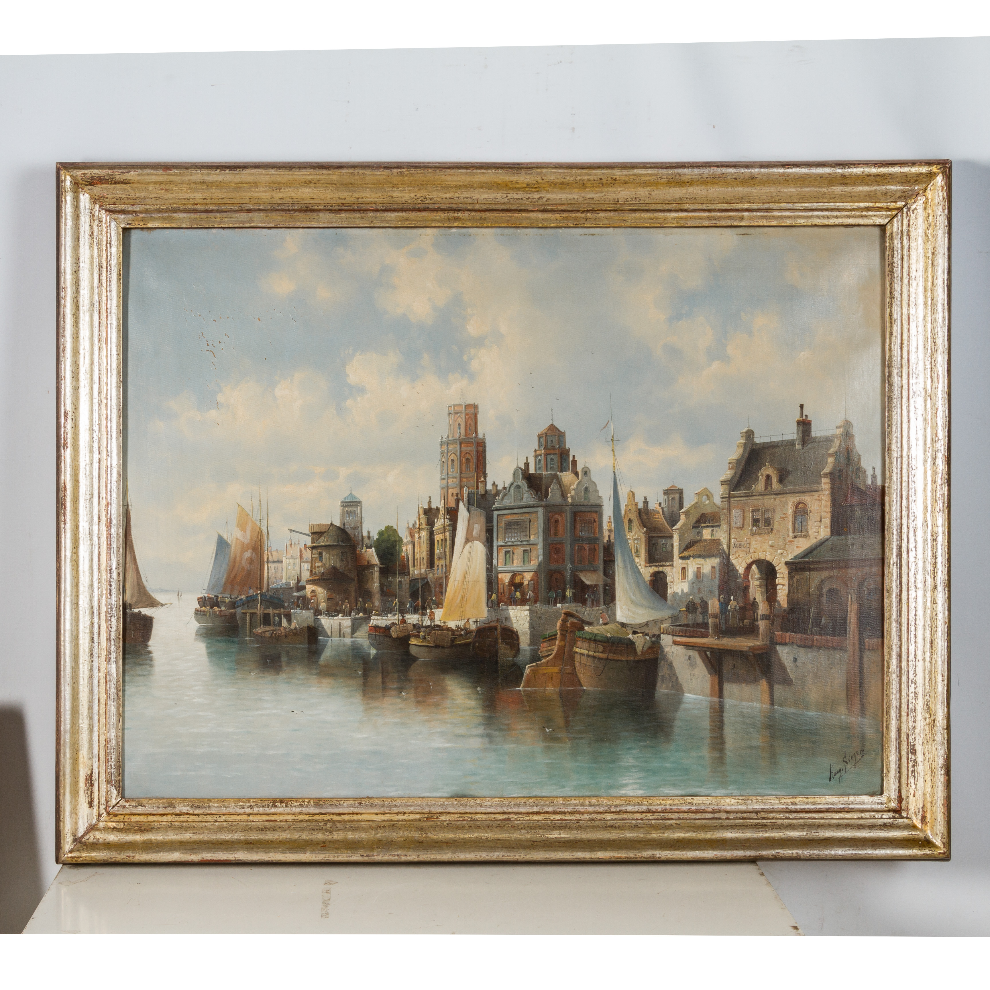 SIEGEN, AUGUST VON (1850 - ?), 'harbour town', signed lower right: ‘Aug. Siegen’, oil on canvas, HxW: approx. 74 x 99.5 cm (HxW frame: approx. 91 x 116 cm). Traces of age and rubbing, loss of colour, slightly stained. With frame (traces of age).