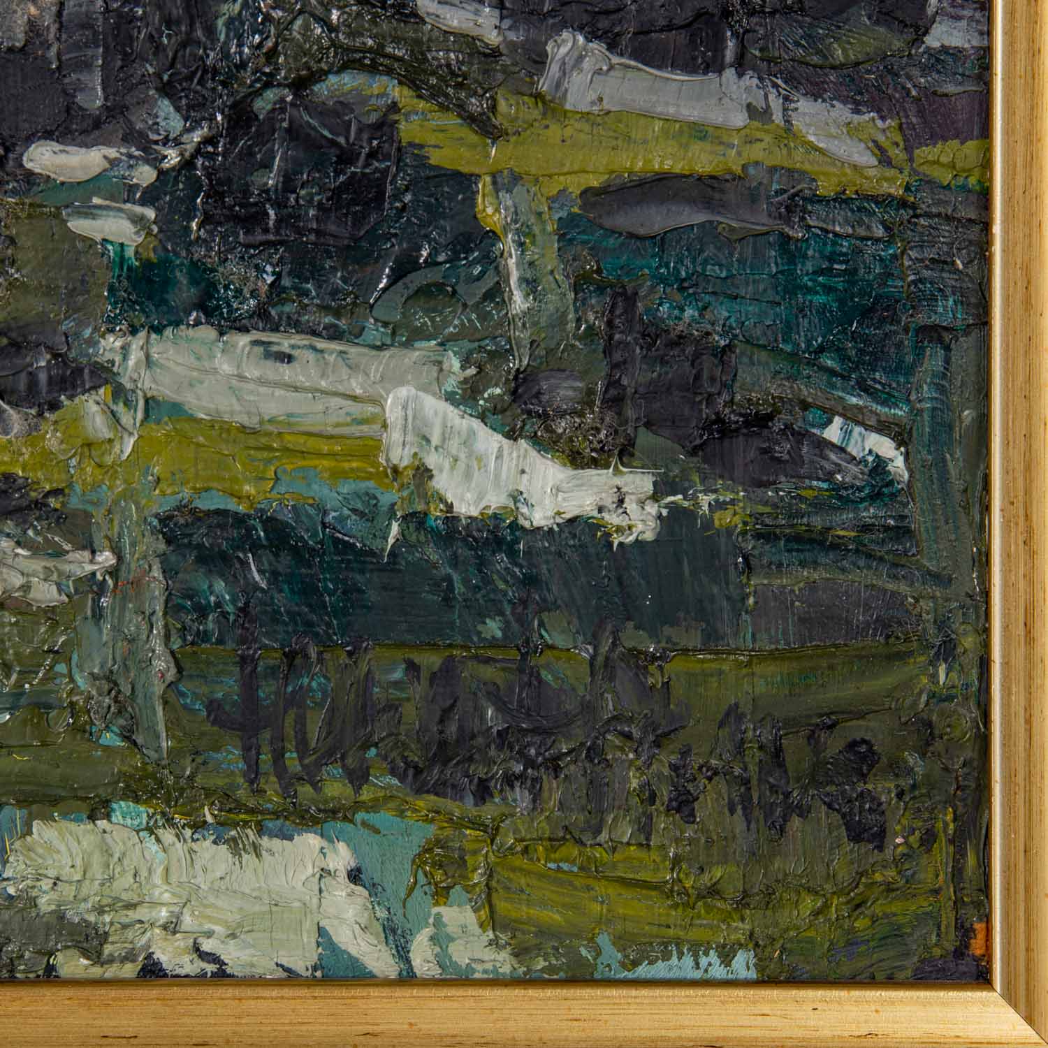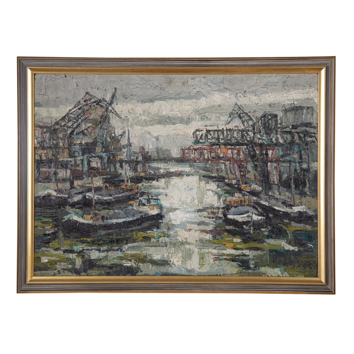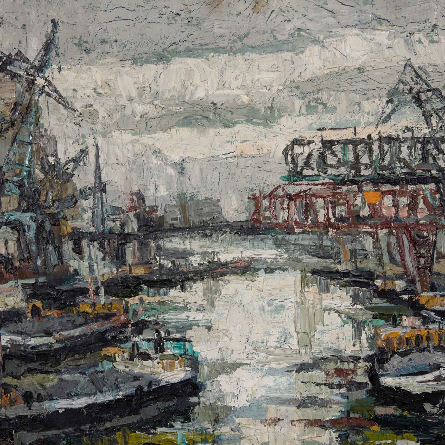 SIESSER, HELMUT (1926-1995), 'Stuttgart, the port', cranes unloading the ships on the Neckar, l.r. signed, oil/hardboard, HxW: approx. 65.5x91 cm (75x100 cm with frame). Signs of age and wear, part. Craquelé and small chips of paint, traces of fibers. With frame.