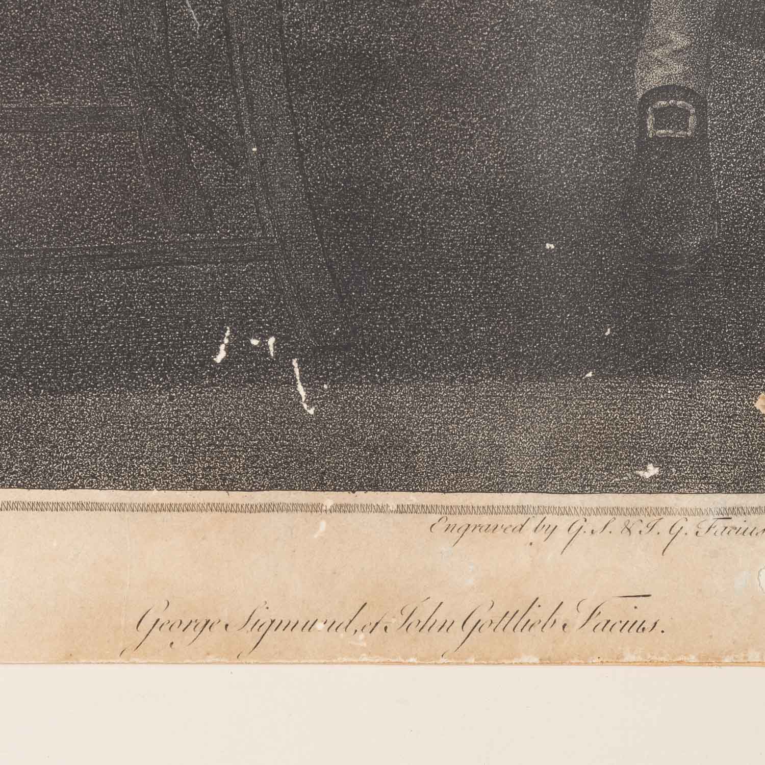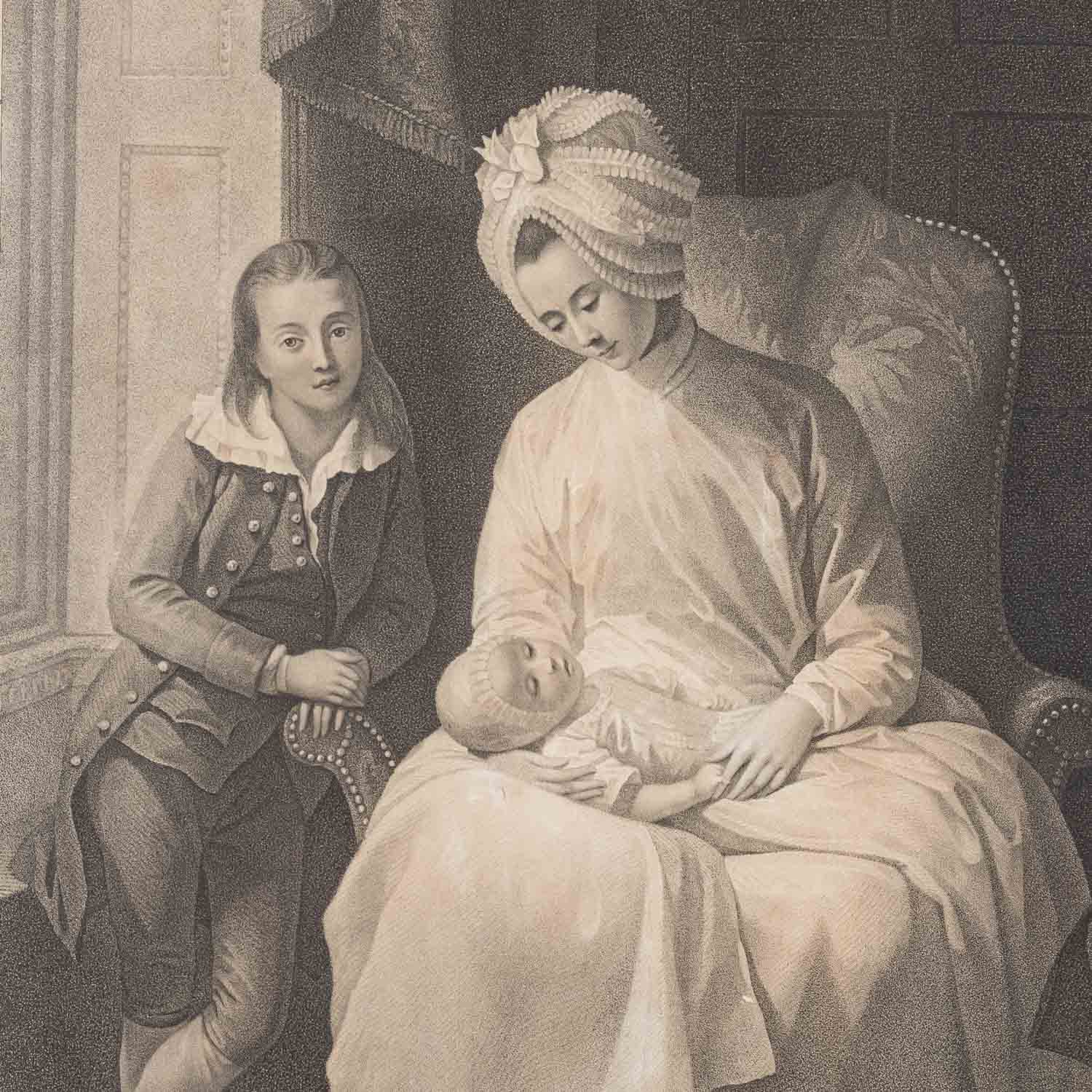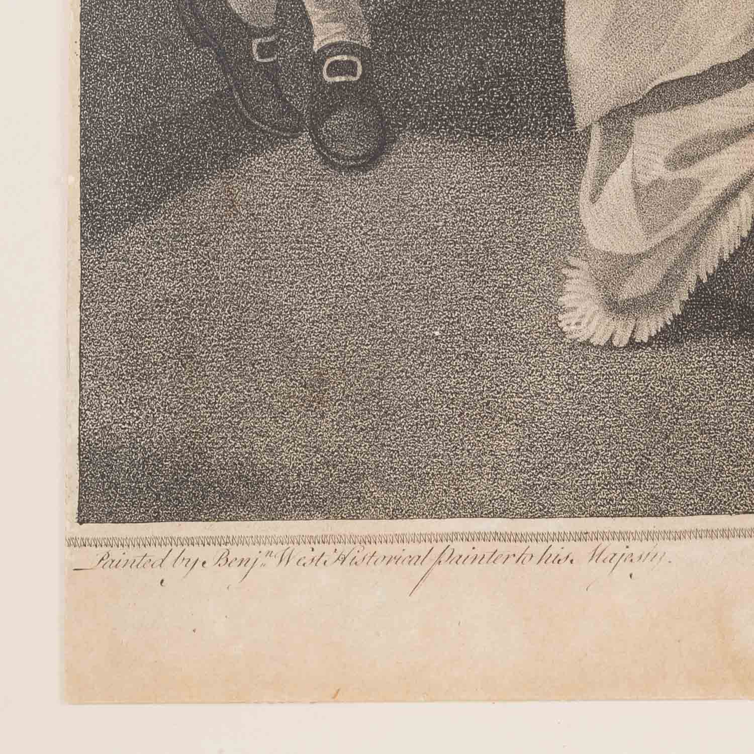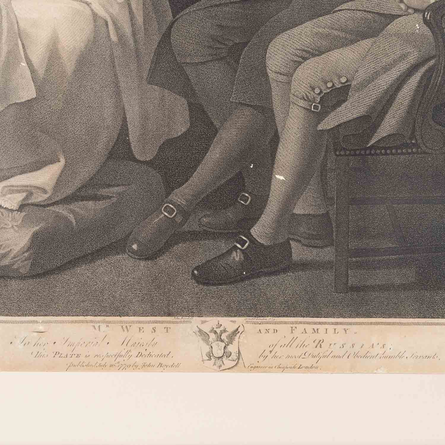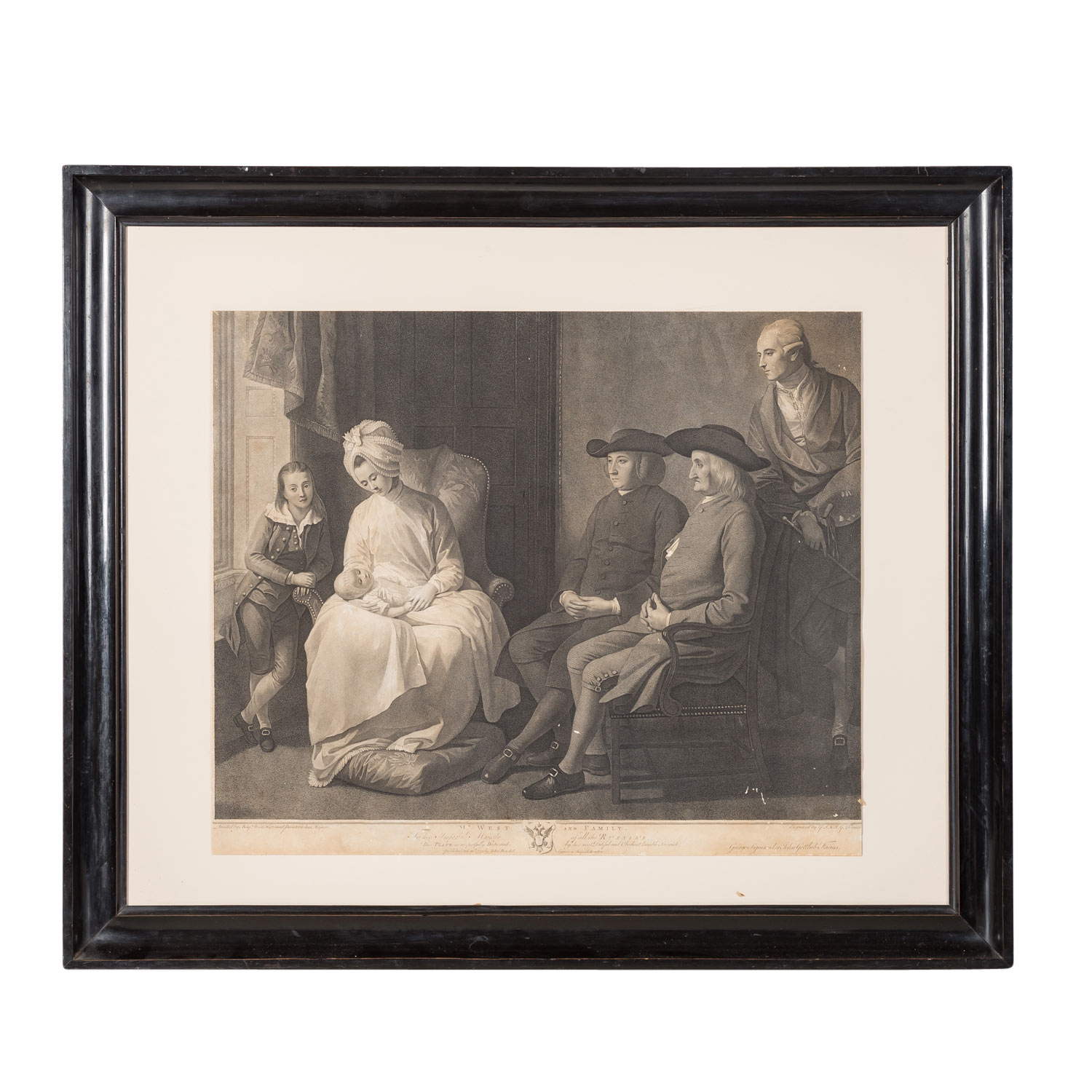 SIGMUND, GEORGE & FEINS, JOHN GOTTLIEB, 18th century, 'Mr. West and Family', 1779, after B. West, mezzotinto/paper pulled on cardboard, inscribed in the plate and with foot title, HxW: plate dimensions approx. 54x64 cm, cardboard dimensions approx. 69,4x83,4 cm, outer frame dimensions approx. 79,5x93,5 cm. Age spots, trimmed, browned, stained, brittle margins. Framed on cardboard behind glass (frame damaged).