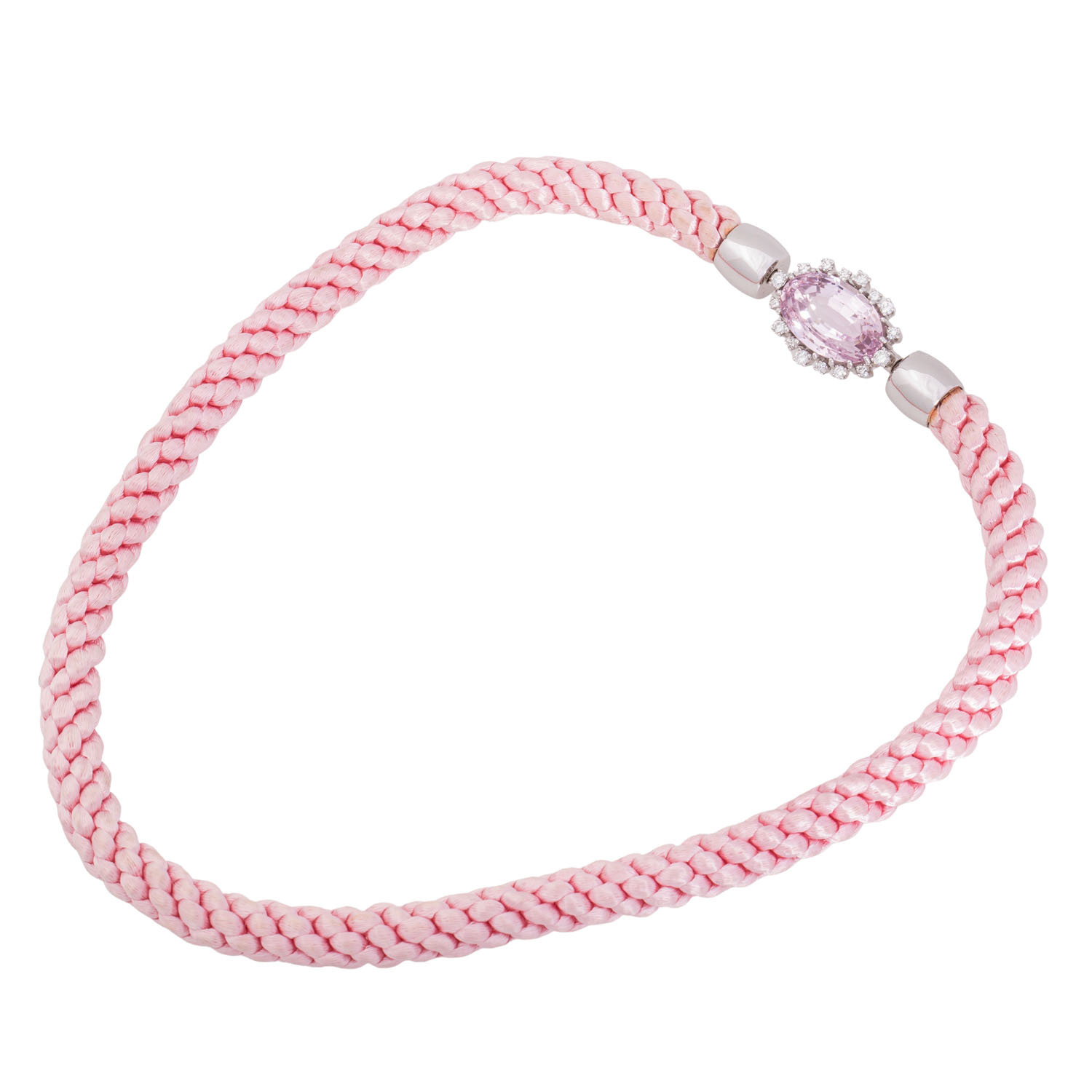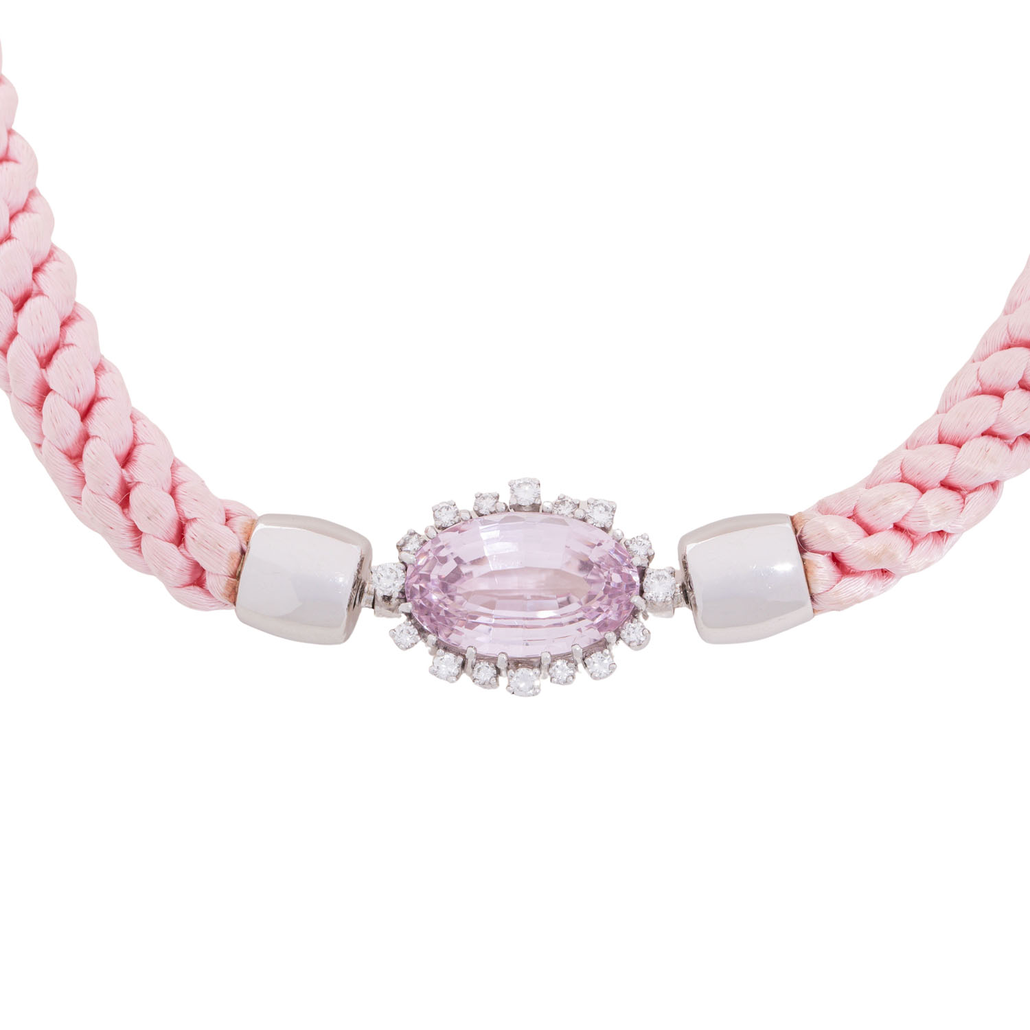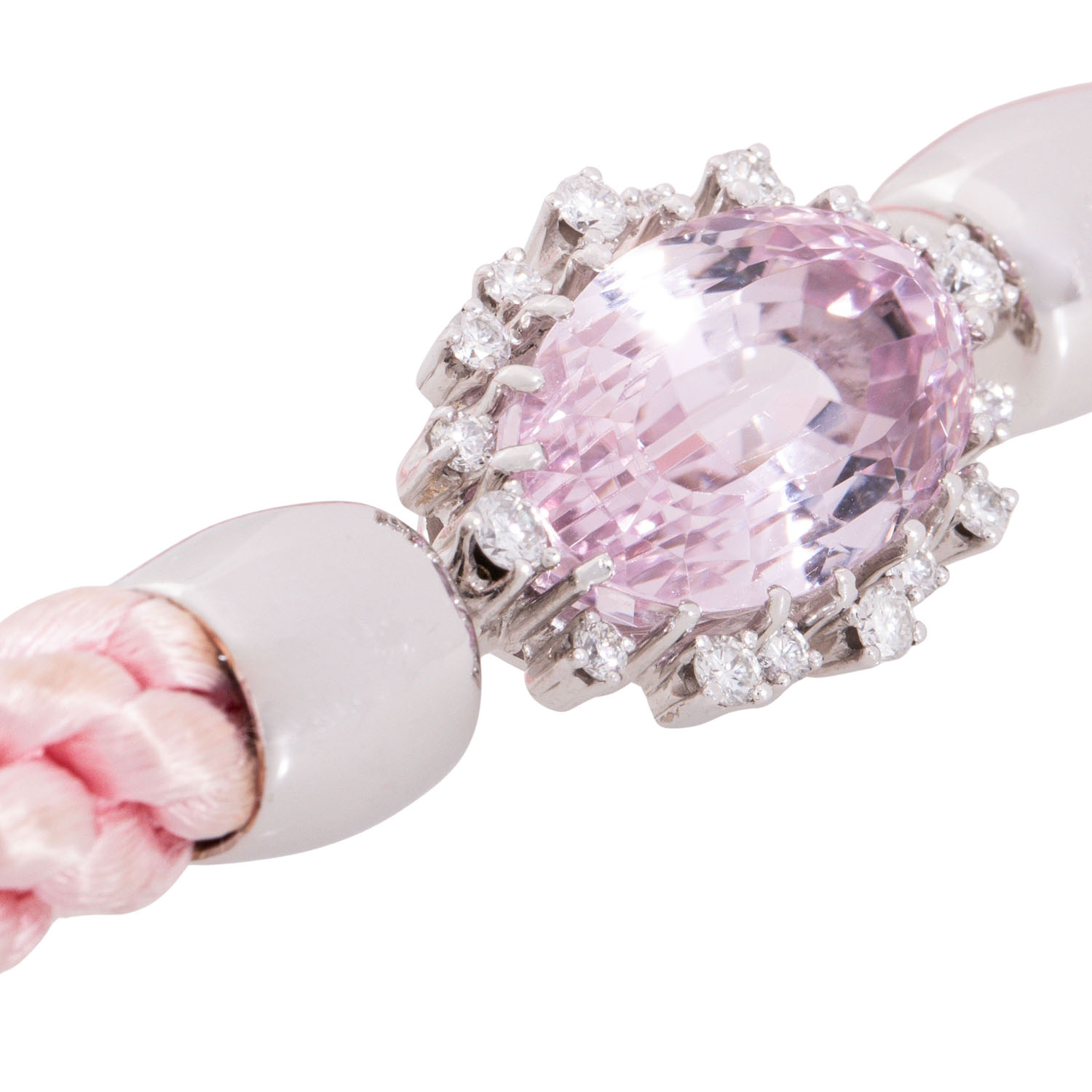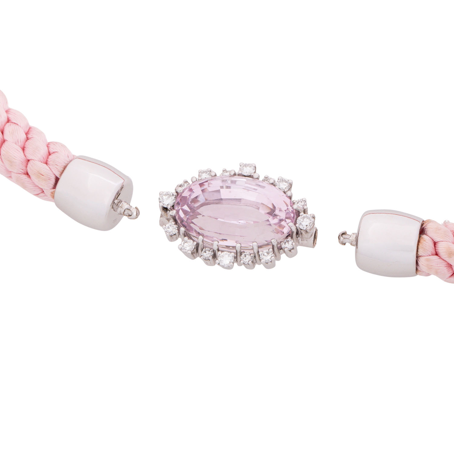 Silk string with clasp in 18K white gold, set with kunzite, oval faceted, ap. 20 x 13 mm, 16 brilliant cut diamonds, totalling ap. 0.8 ct, WHITE (H)/VS, capsules in 18K white gold, totalling 39.5 g, D (cord): 9.5 mm, L x W (clasp): 26.6 x 19.6 mm, late 20th century, minimal signs of wear.