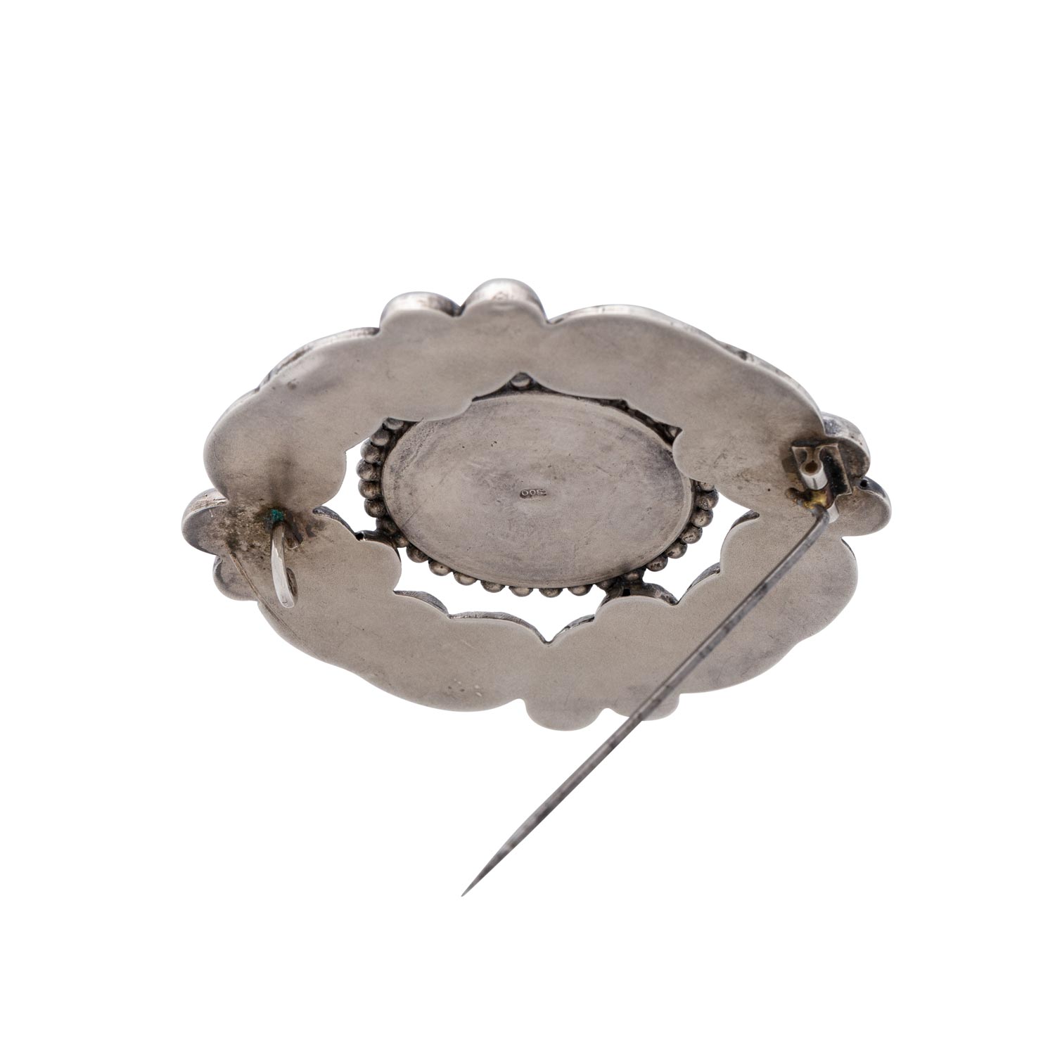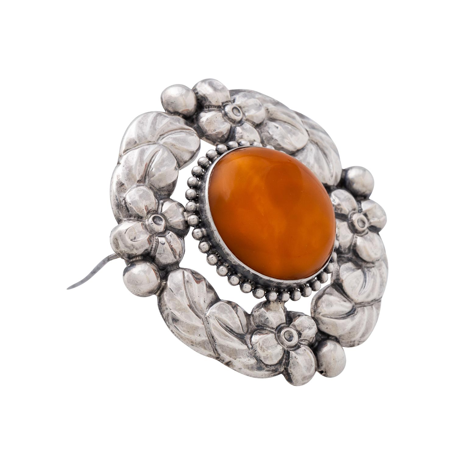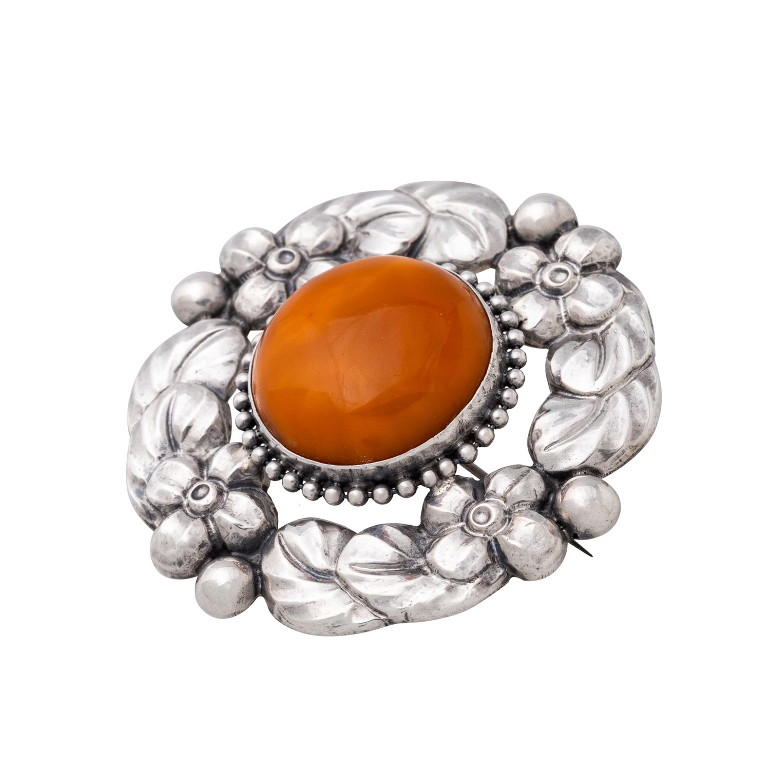 Silver brooch with butterscotch amber, 15.7 gr, diameter ca. 6 cm, 1st half 20th century, good worn condition.