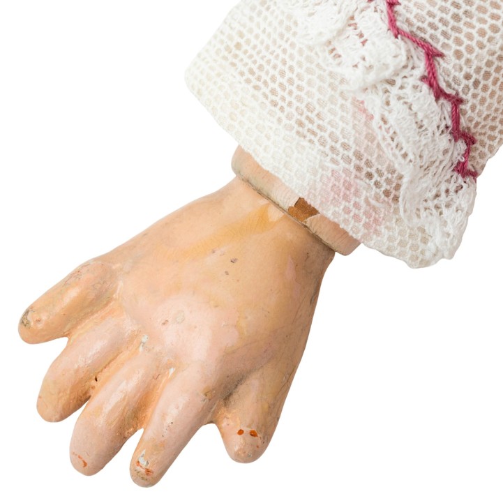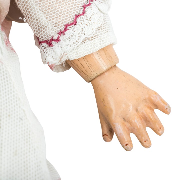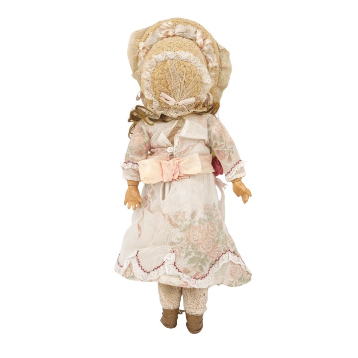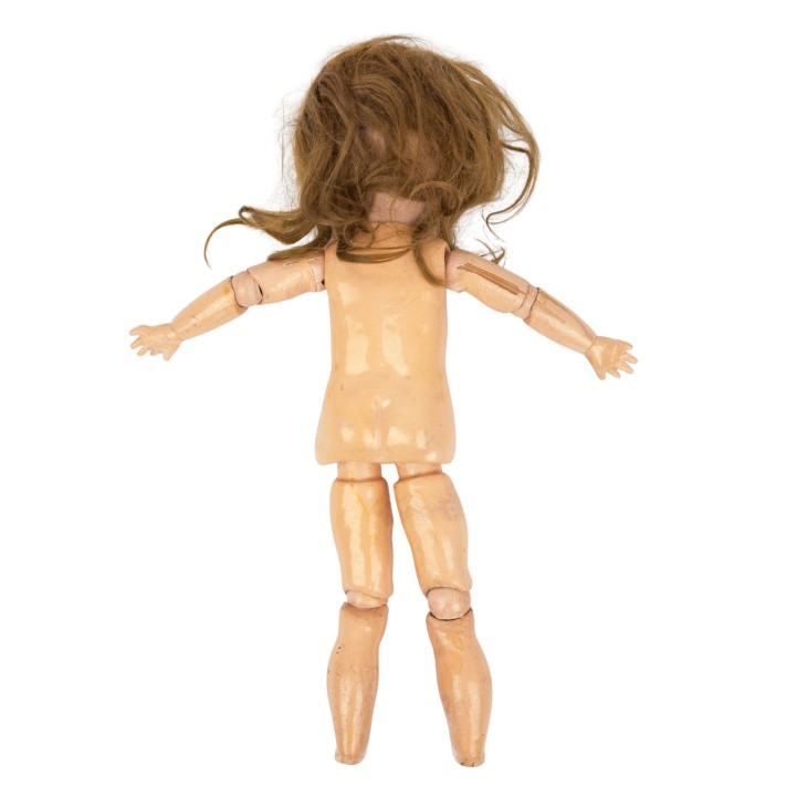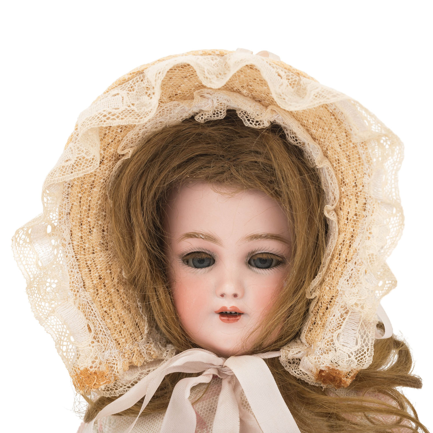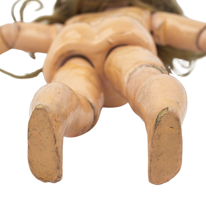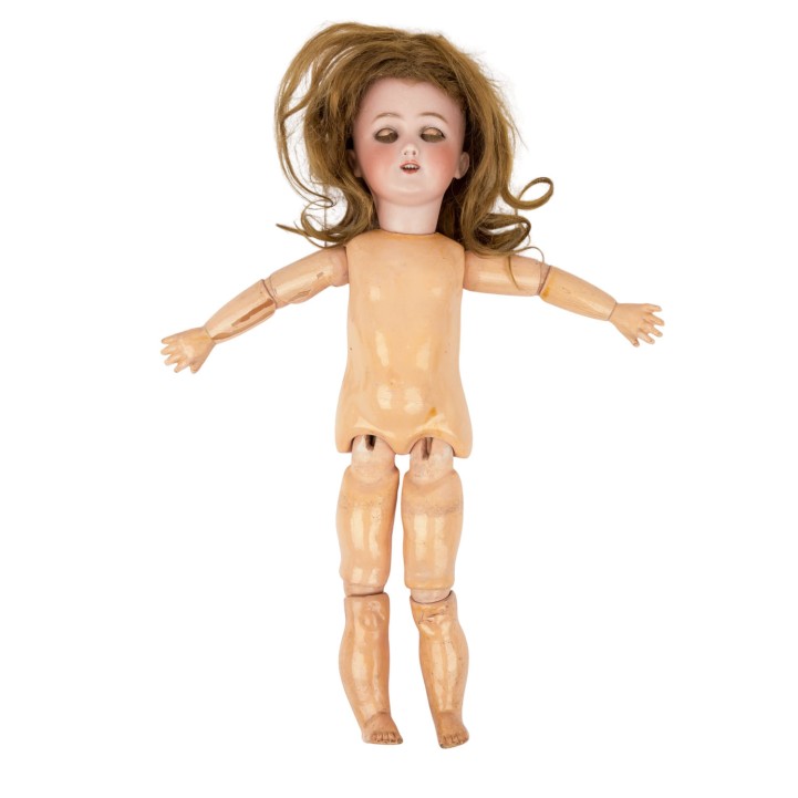SIMON & HALBIG early porcelain head doll, from 1898, marked on the neck '1248 Germany Simon & Halbig', manufactured from 1898, porcelain crank head with light brown wig (traces of glue), blue sleeping eyes with ray iris, eyelashes and eyebrows in the same color, open mouth with row of teeth, pierced ears, ball-jointed body made of wood mass composition, dress, underwear, shoes, stockings and hat included, H 39 cm, signs of age.