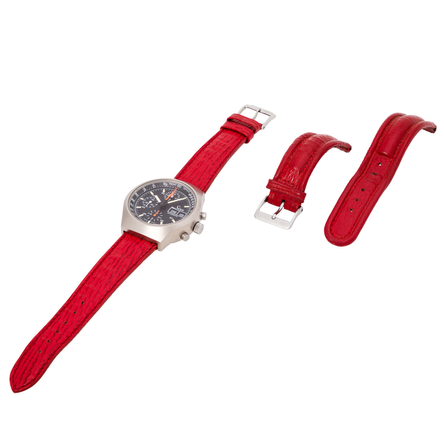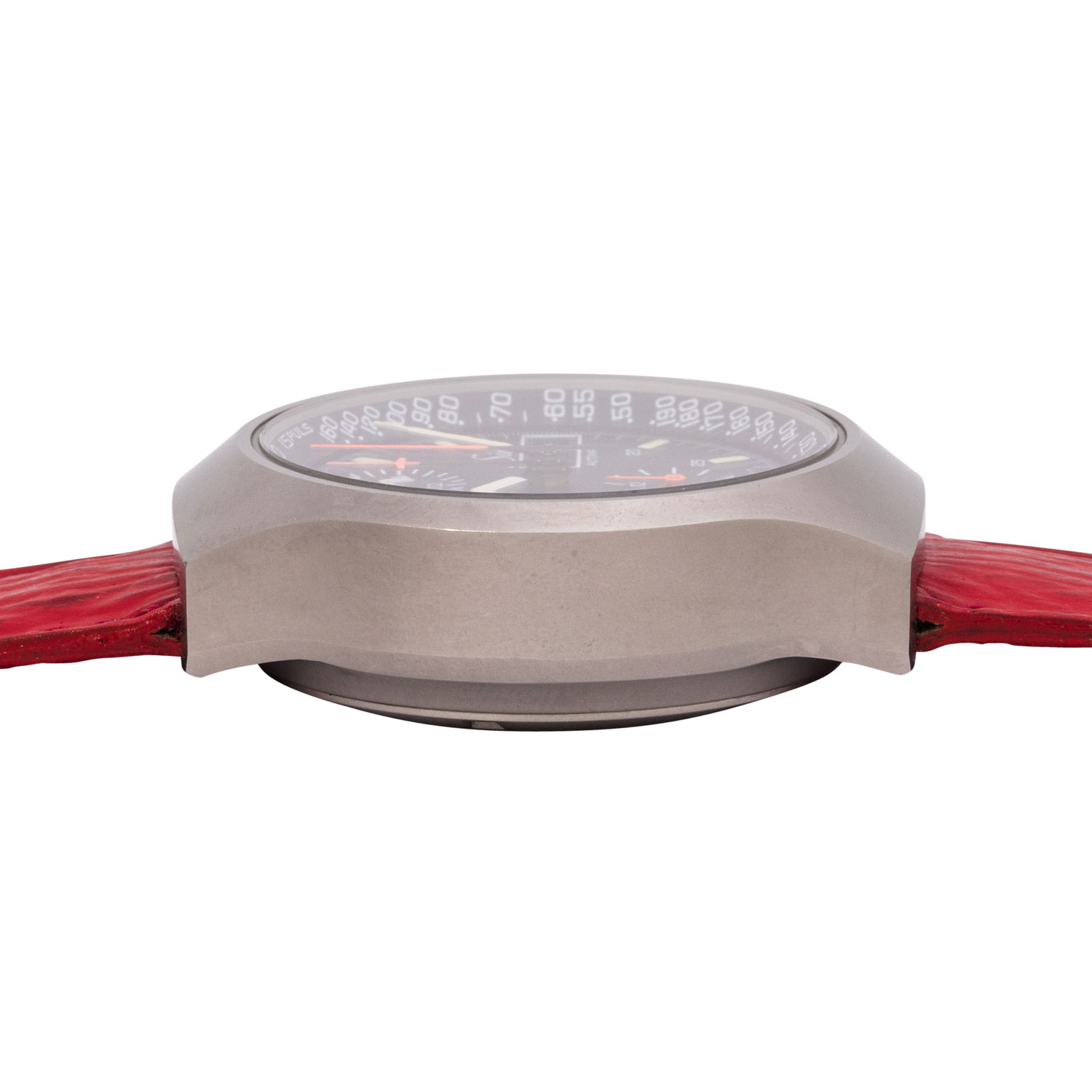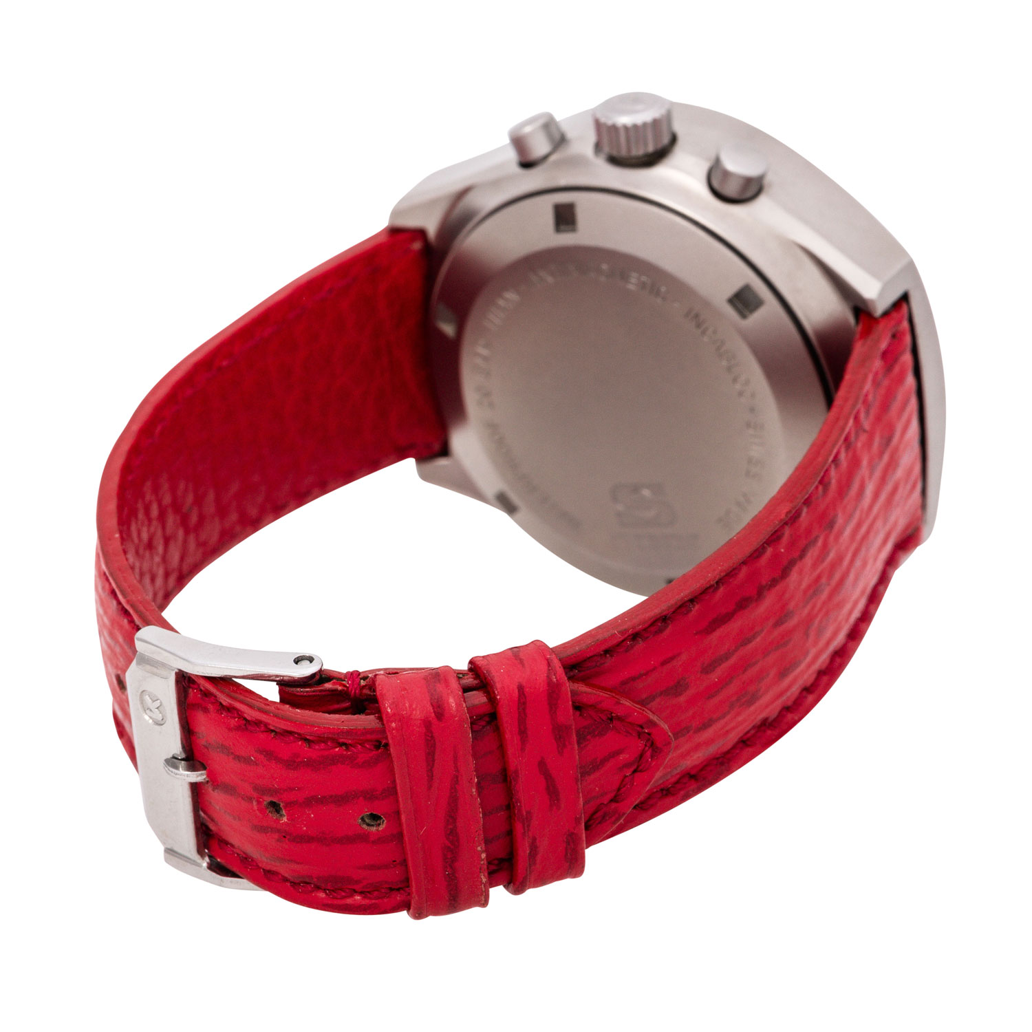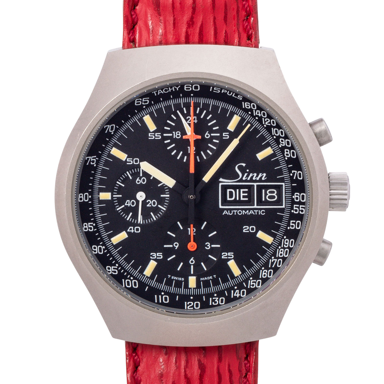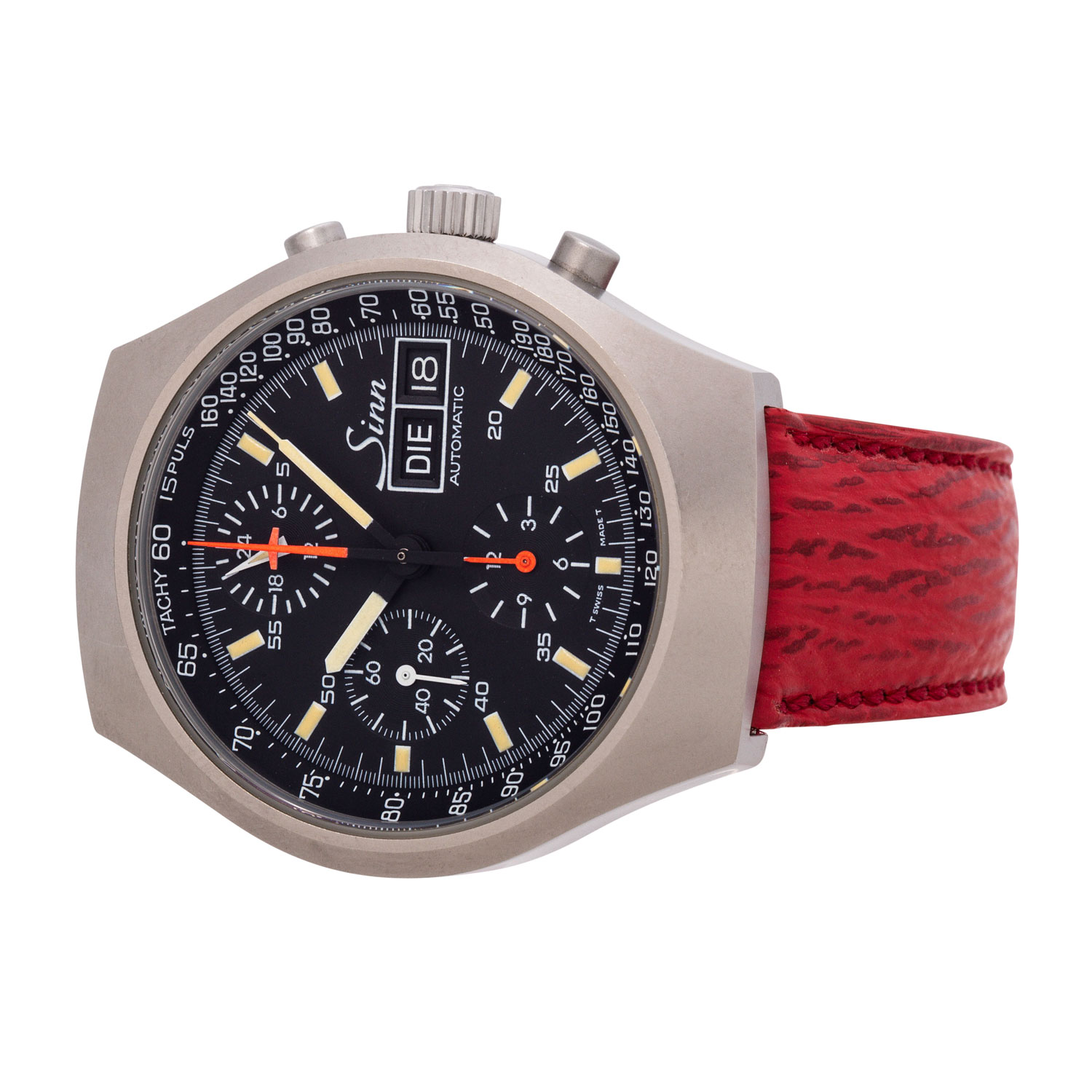 SINN 157 Titanium day date chronograph men´s wristwatch. Titanium. Automatic movement Lemania cal. 511 with good rate values (+11 seconds, 266°). Black dial with tritium indices and hands, day and date display and 3 chronograph registers. New leather strap with pin buckle. Good condition, slight signs of wear on the case. Old leather strap attached. Diameter approx. 40 mm without crown.
