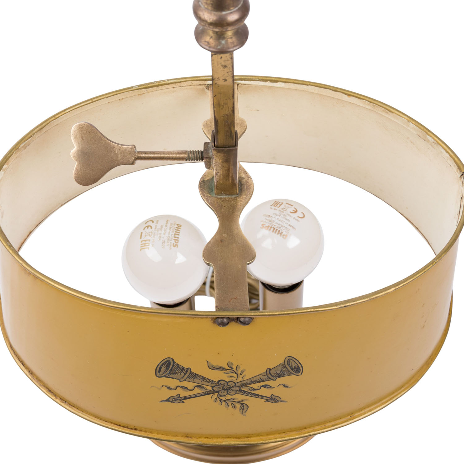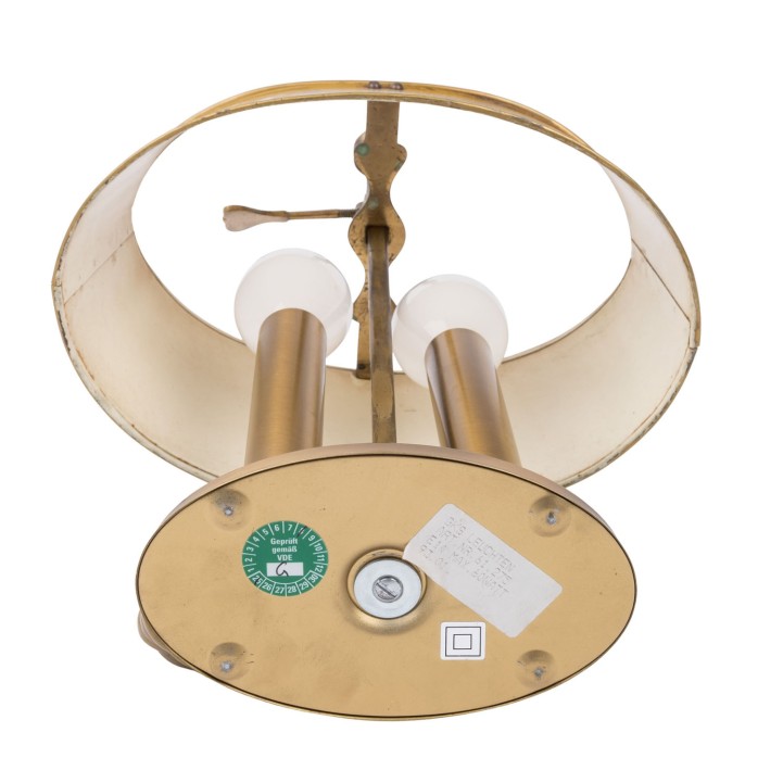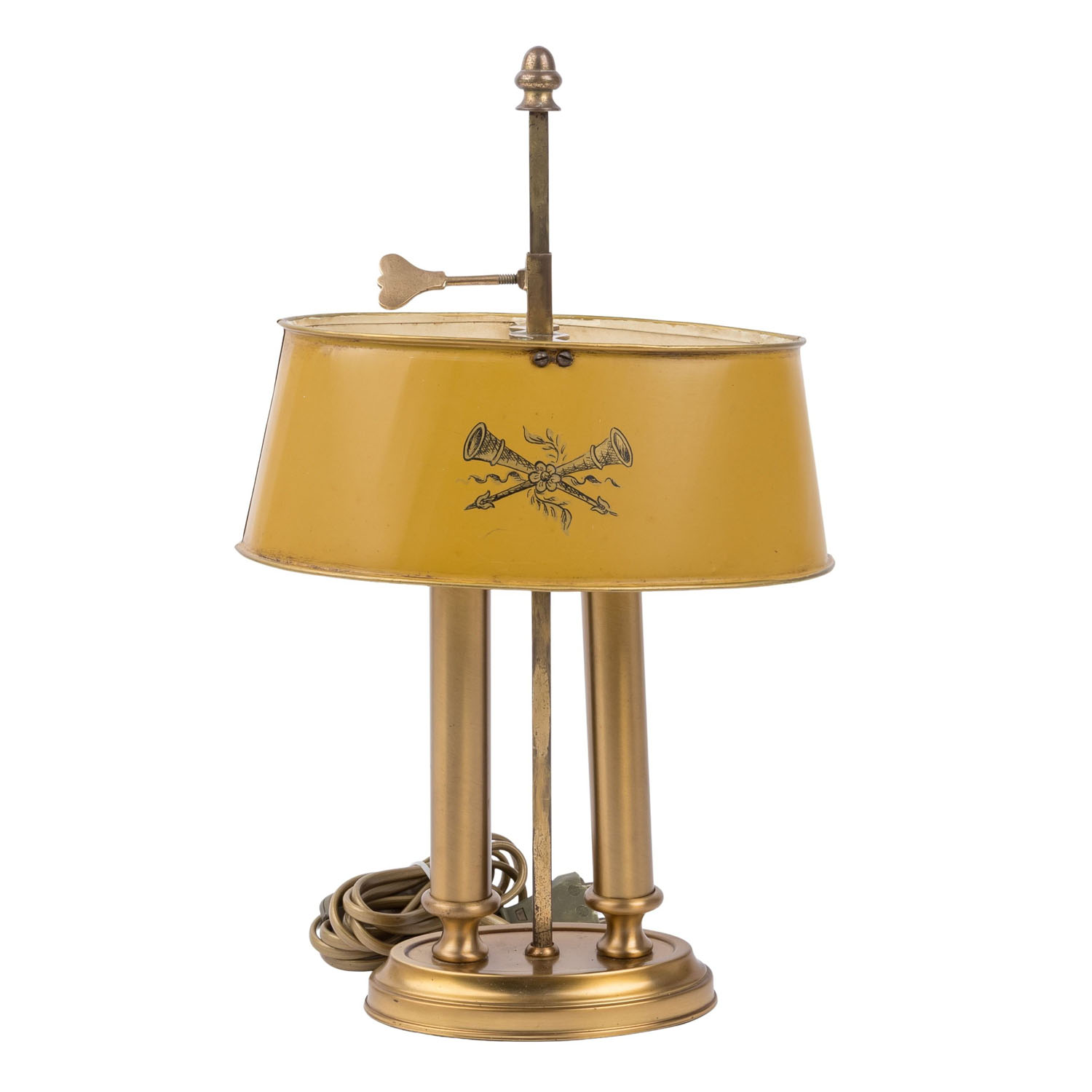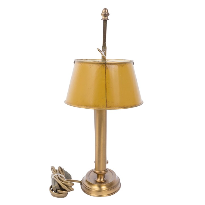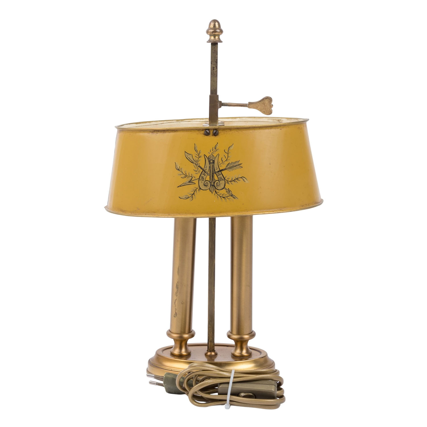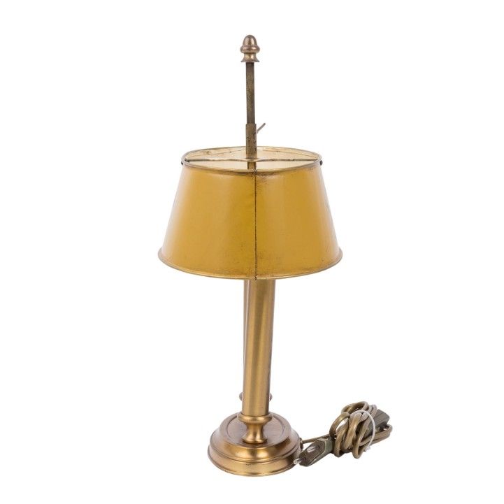 Small bouillotte lamp, 2-bulb, made of brass with yellow, height-adjustable metal shade, H: 40 cm. Signs of age and wear.
