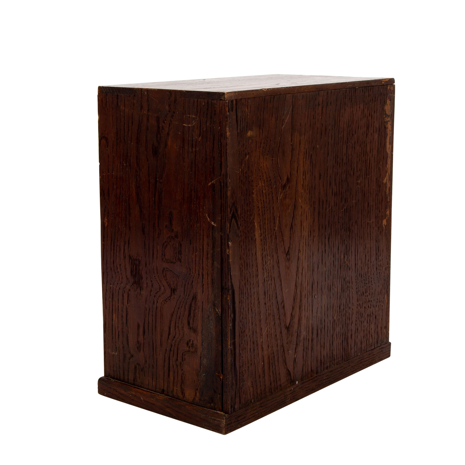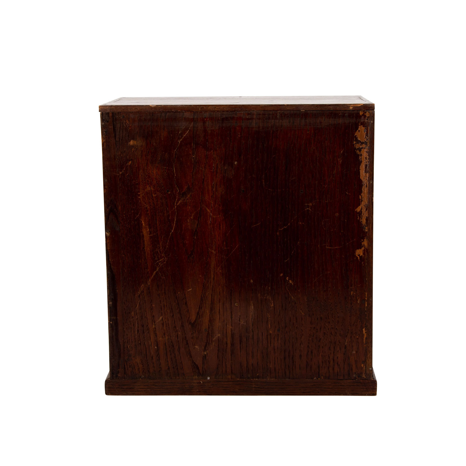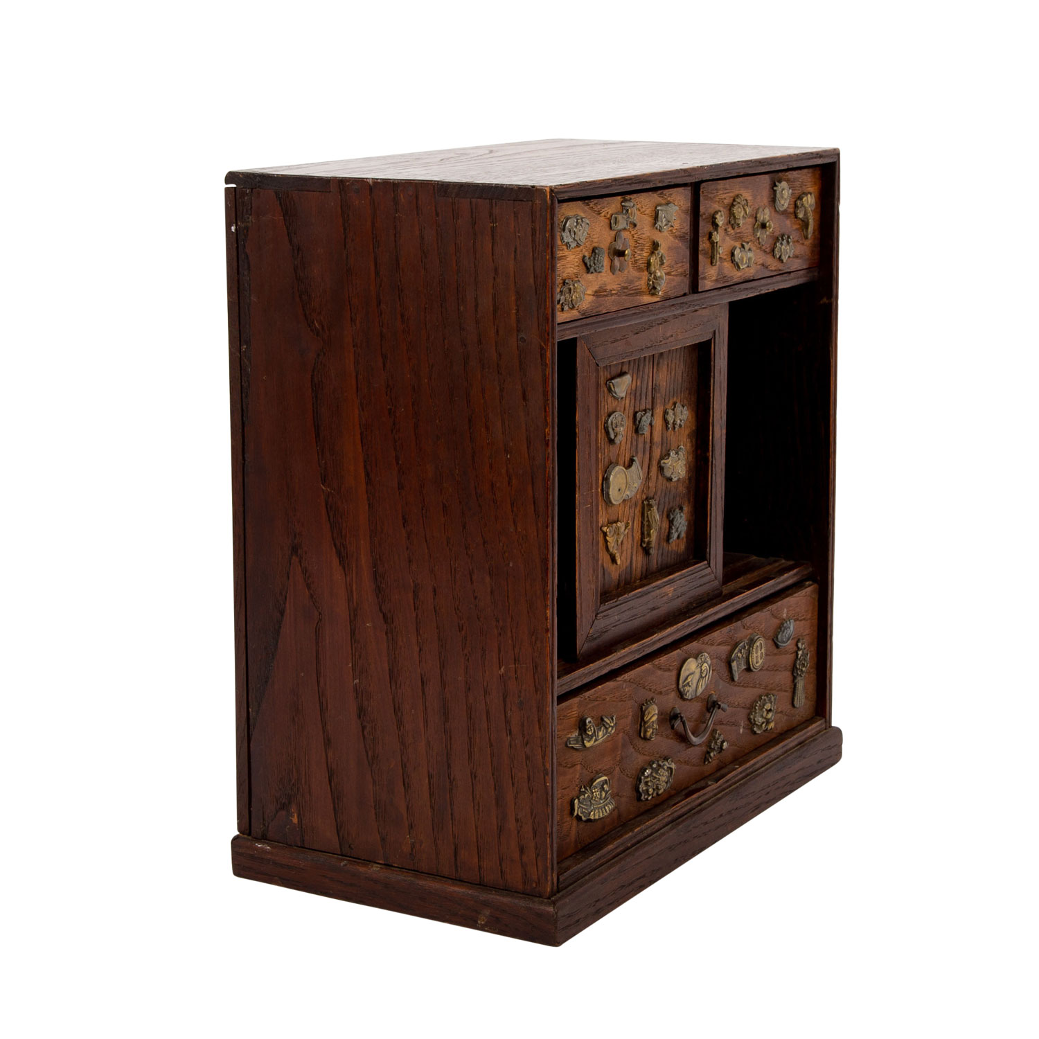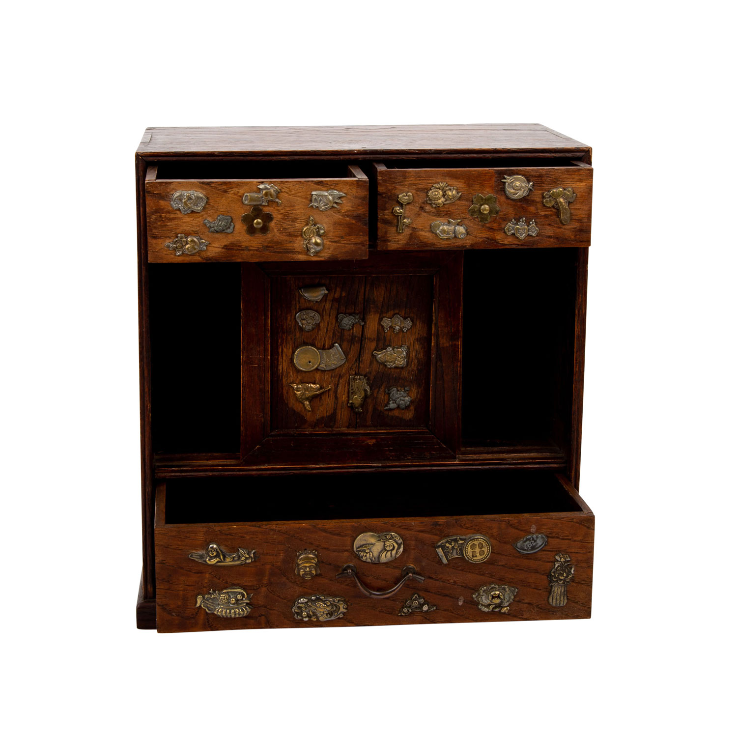 Small wooden cabinet, 1930s/40s, decorated with metal Chinese emblems. 33x30x17,5 cm. Traces due to age and use. Formerly in possession of a Southern German noble family.