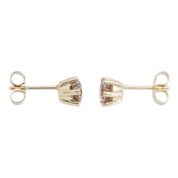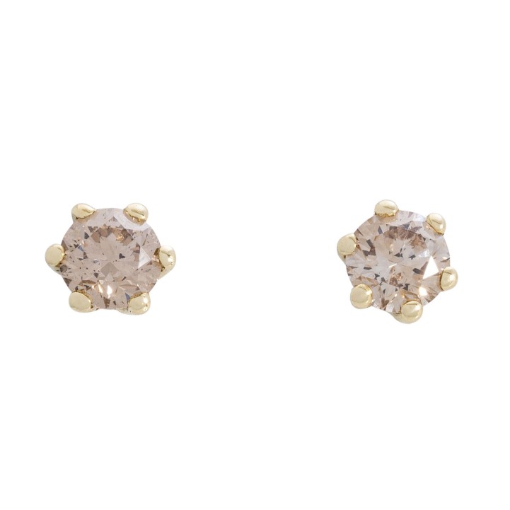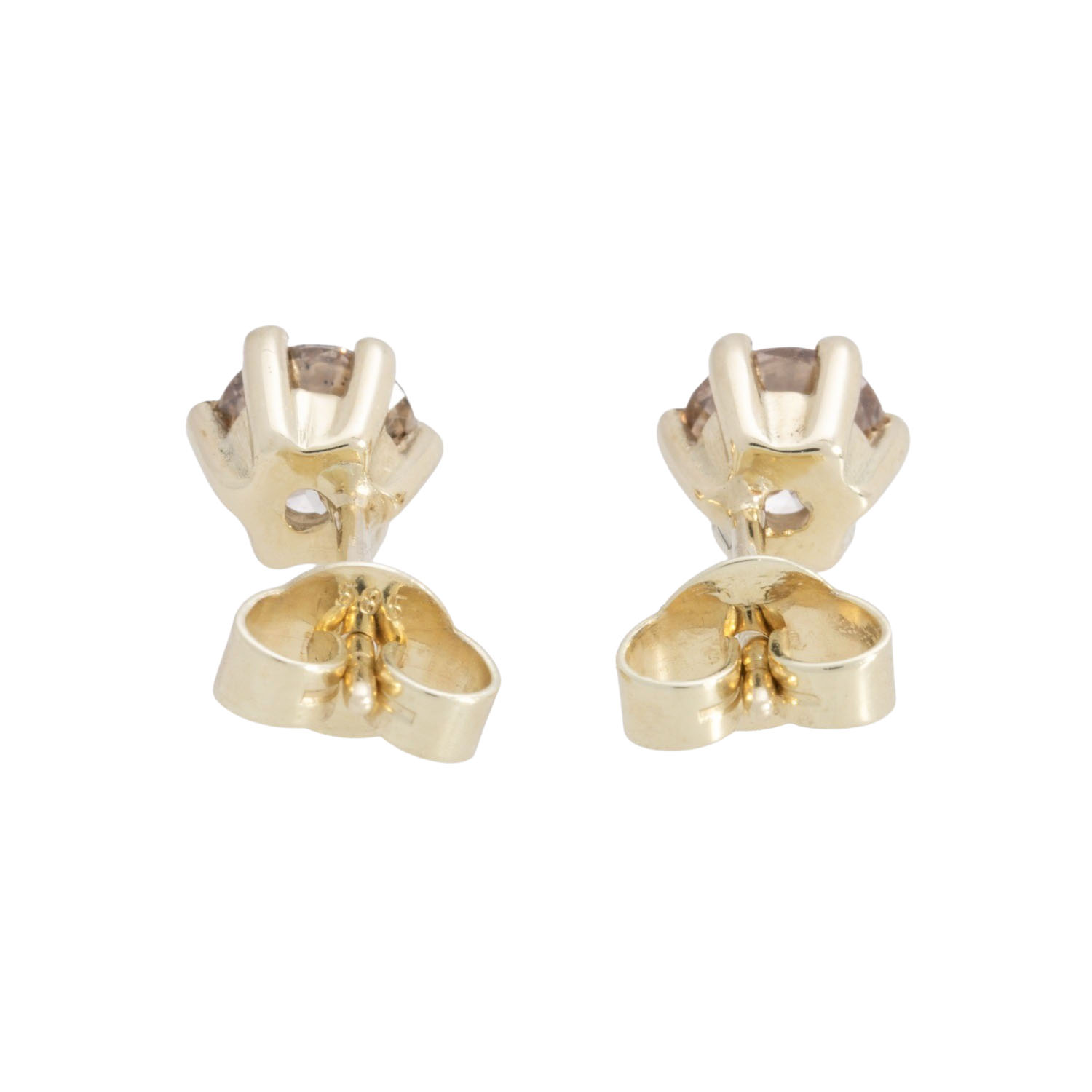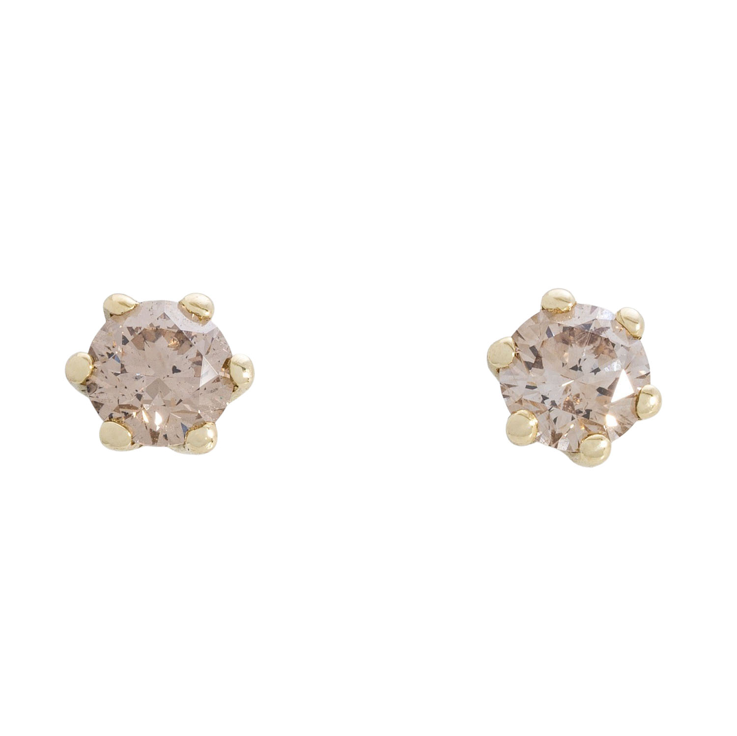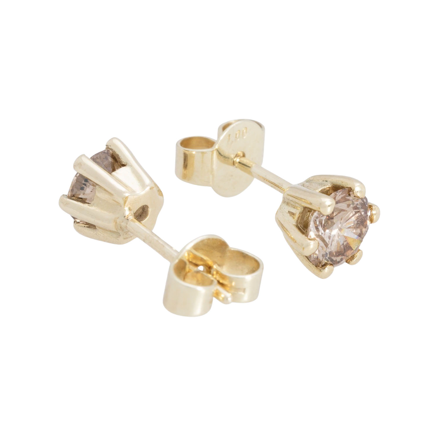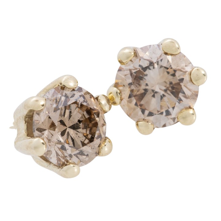 Solitaire earpins with brilliant-cut diamonds totalling ca. 1 ct (marked), ca. Light Fancy Brown/SI2-P1, 14K YG, 1.7 g, 20th/21st century, minimal signs of wear.