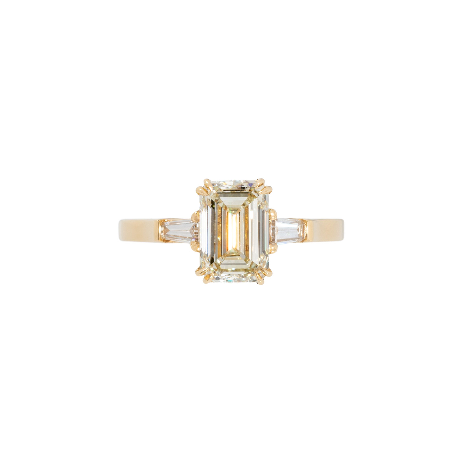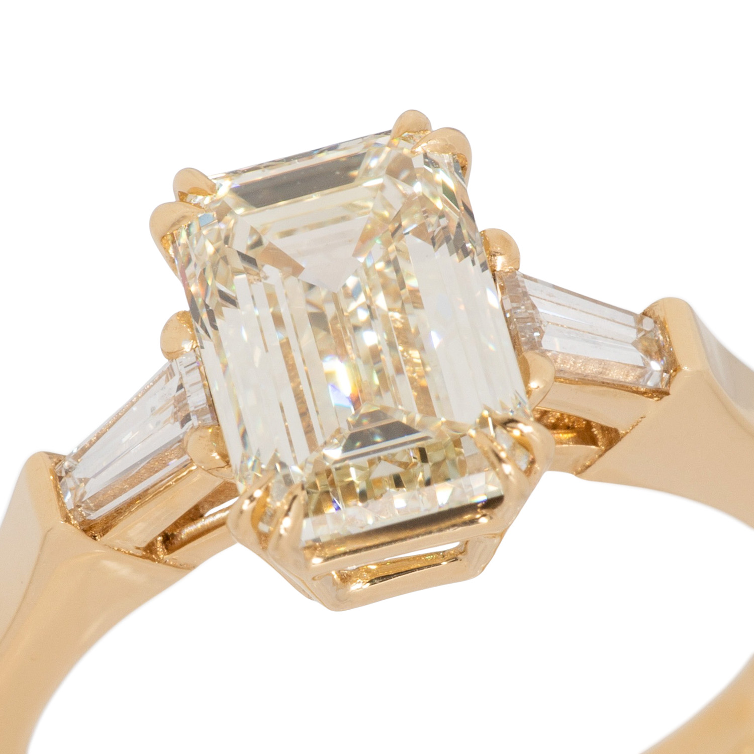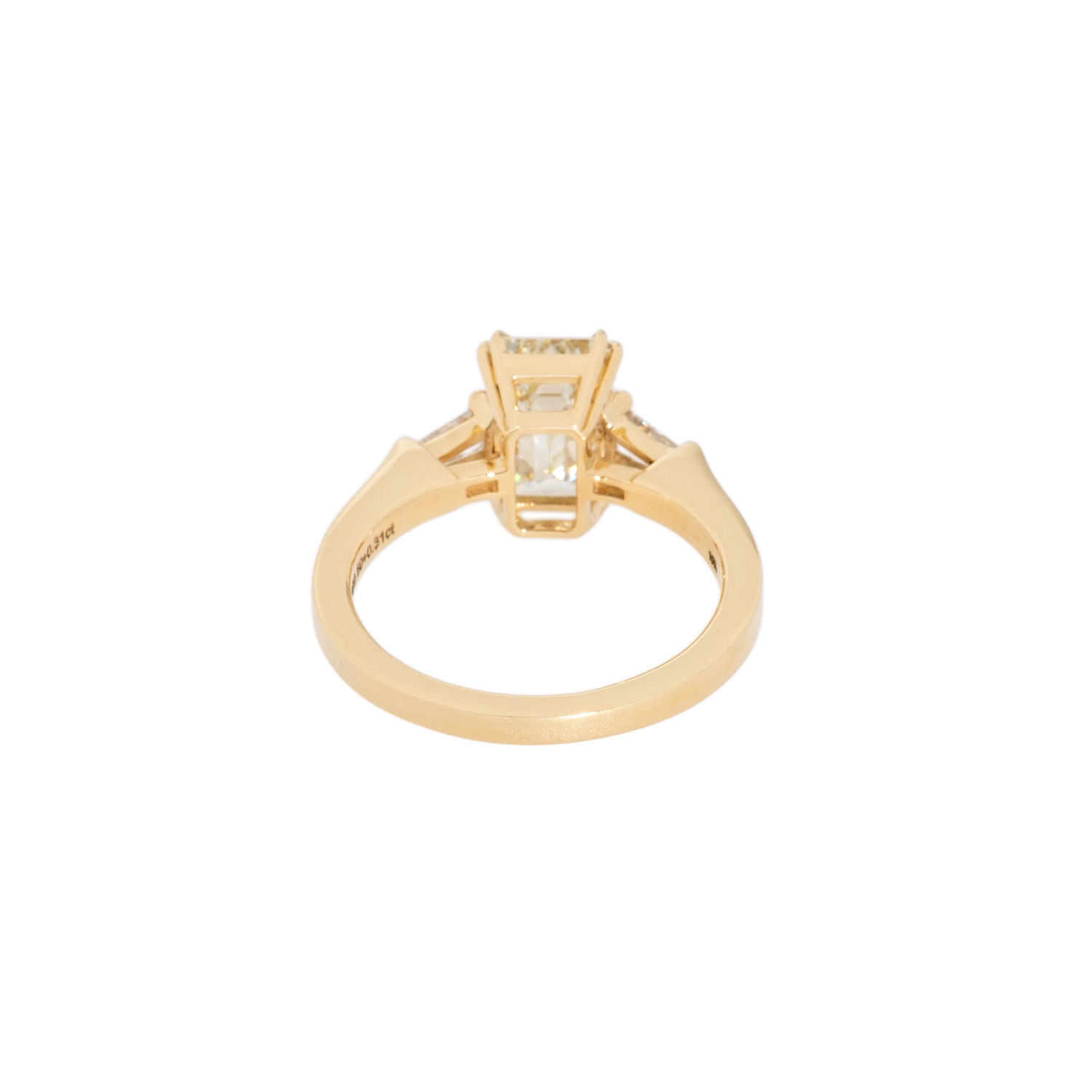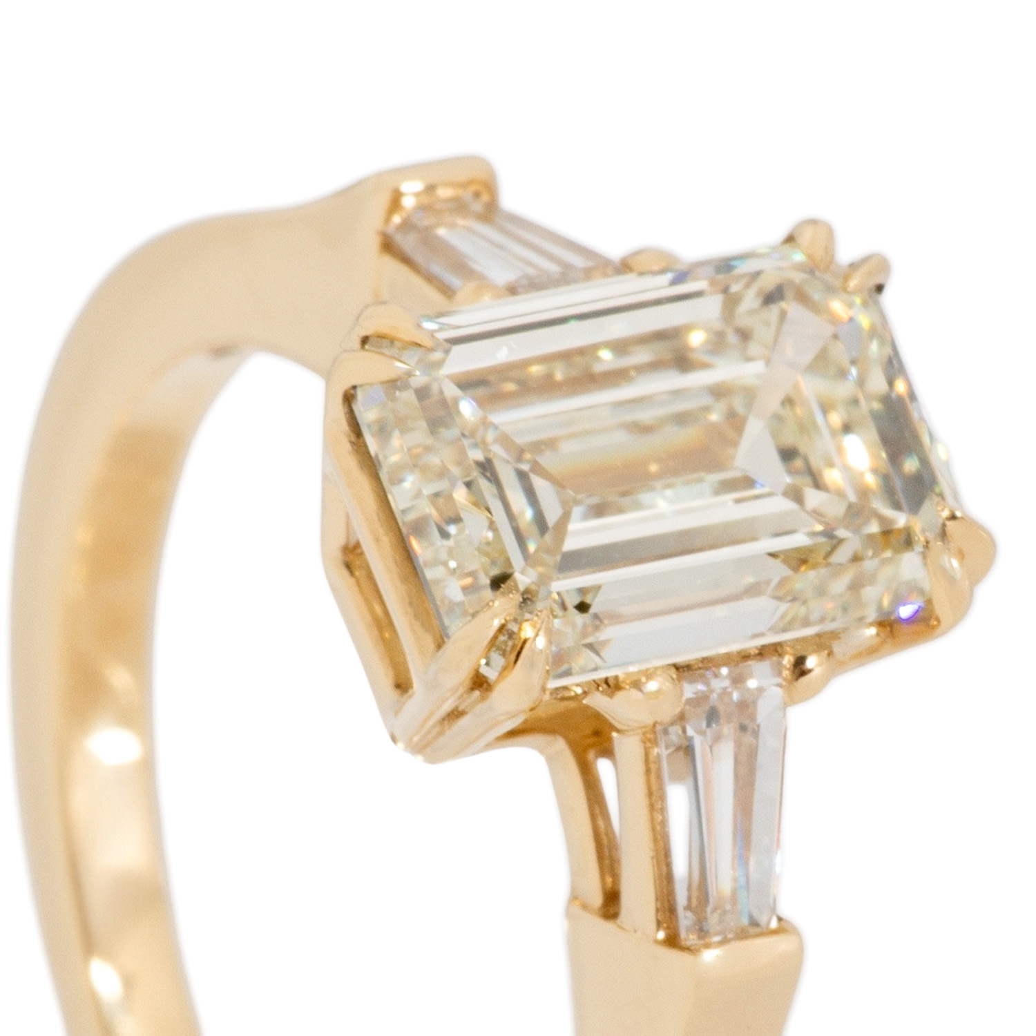 Solitaire ring, set with 1 diam. emerald cut 2,50 ct. N/VVSI1 with GIA 2496817502 flanked by 2 tapered diam. 0,31 ct. H/SI. YG 18 K, 5,23 g. Size ca. 55. High quality craftsmenship.