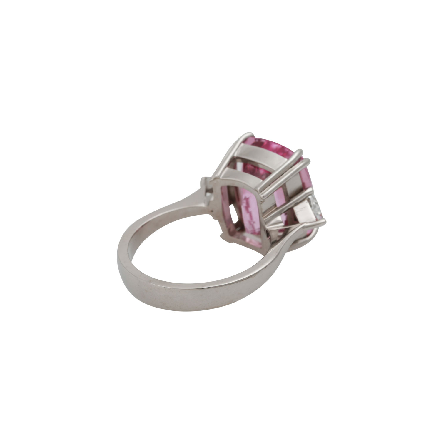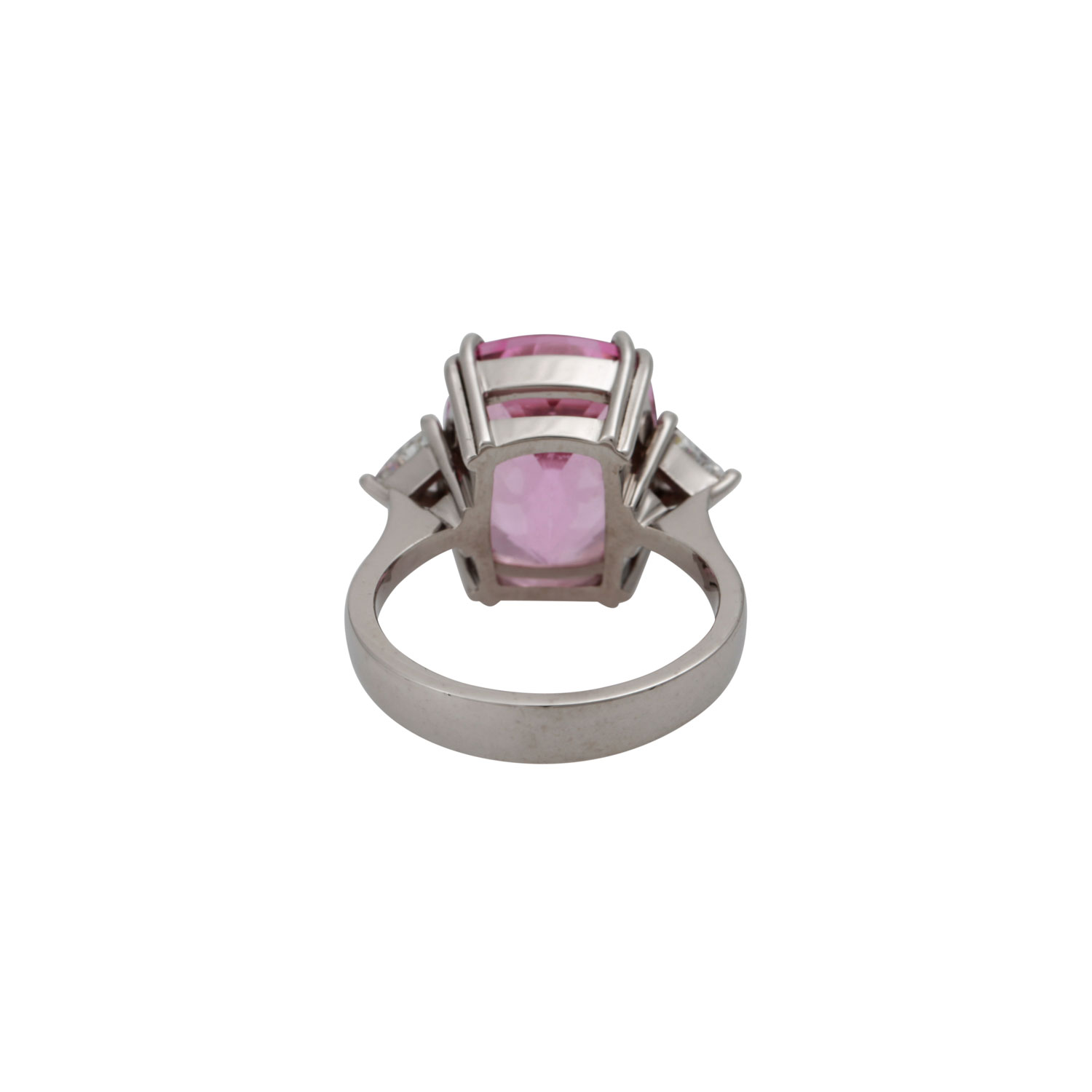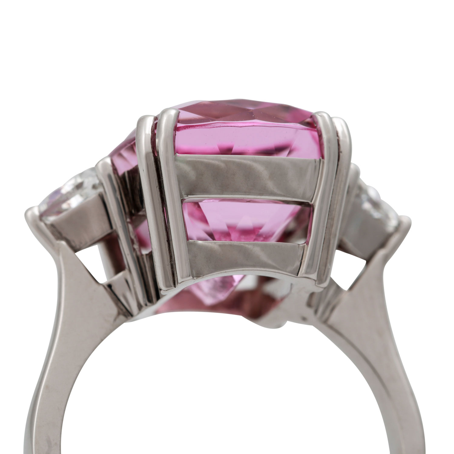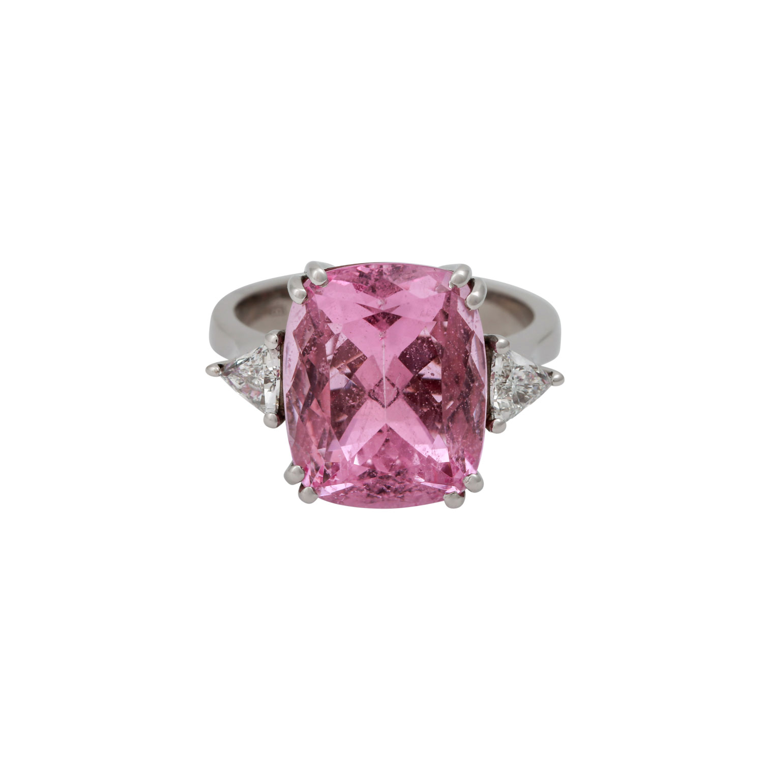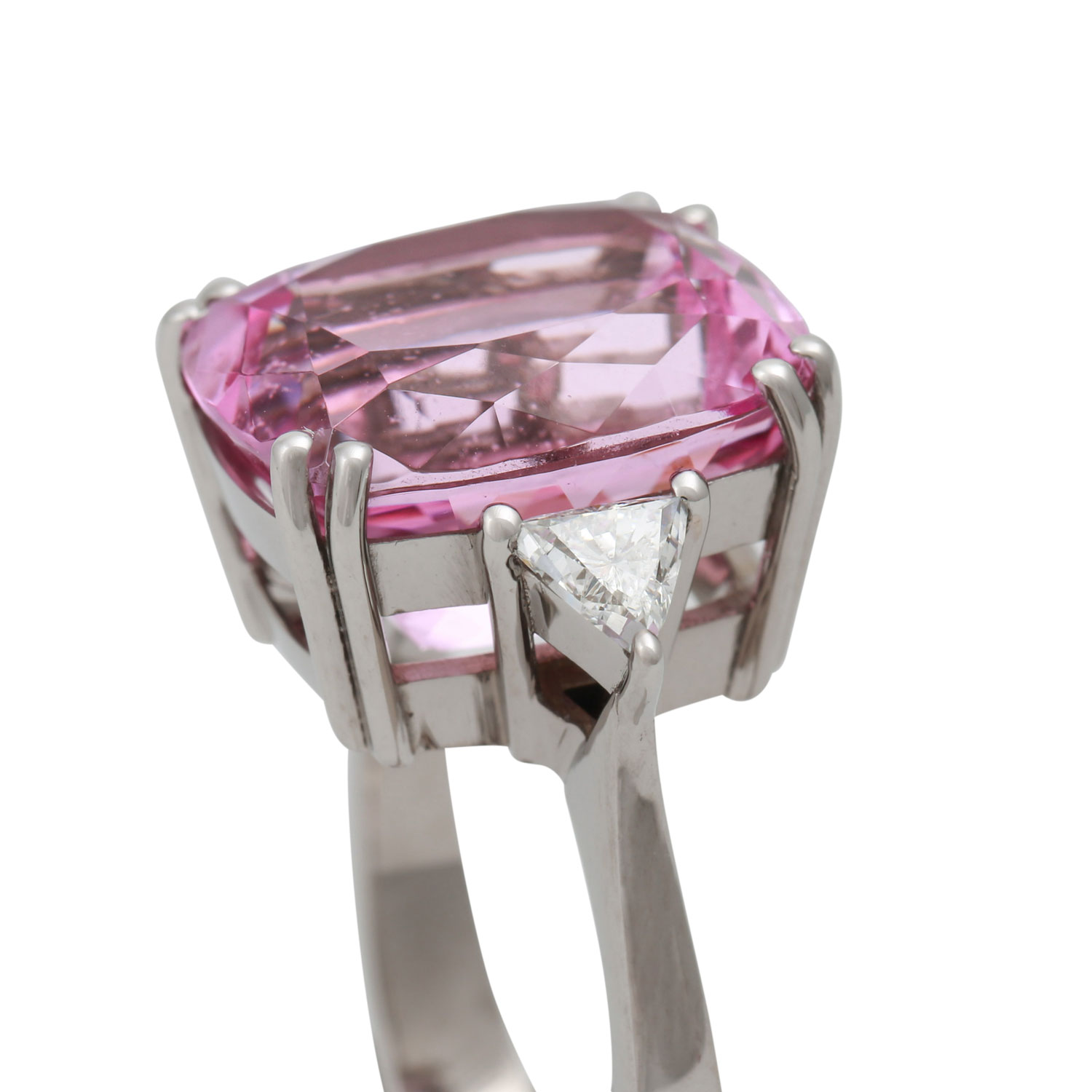 Solitaire ring with 1 very fine, pink morganite 9,95 cts. with DSEF-expertize and 2 diamond-triangles approx. 0,40 ct. FW/VSI.