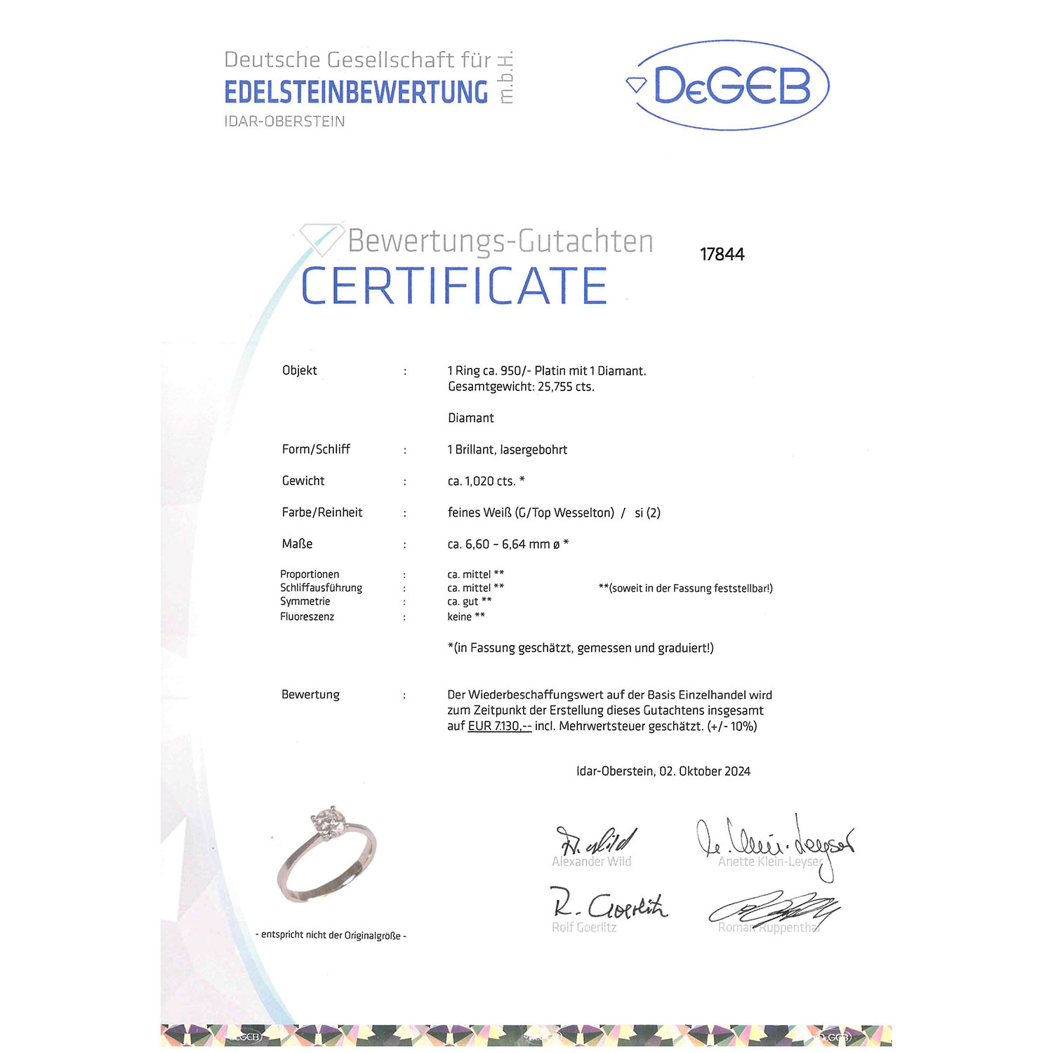 Solitaire Ring, with brilliant-cut diamond 1,02 ct. RW (G)/SI2, laser drilled, 950 platinum, 5 g, ring size 64, 21st century, very good condition, DEGEB certificate no.: 17844 from 10/2024 on 7130 € enclosed. High quality goldsmith work.