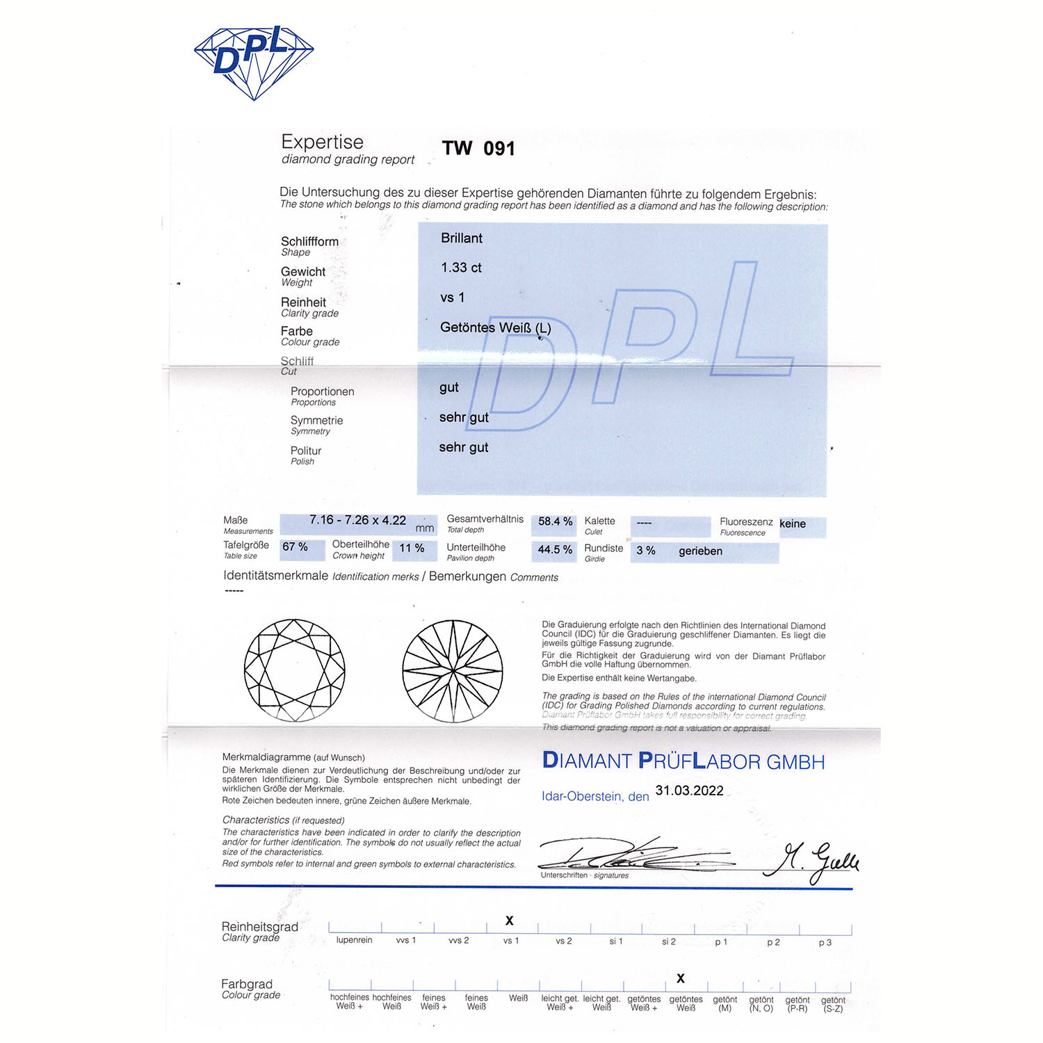 Solitaire Ring with brilliant-cut diamond 1.33 ct, TIW (L) /VS1, 950 platinum, 5.2 g, ring size 53.5, 21st century, mint condition. Handcrafted. DPL certificate TW 091 from 03/2022 enclosed.