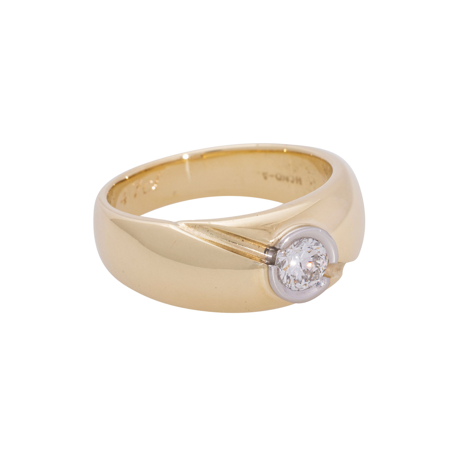 Solitaire ring with brilliant-cut diamond ca. 0.47 ct (engraved), ca. WHITE (H)/VS-SI, 14K yellow and white gold, 10.5 g, ring size 59, late 20th century, UNWORN, marked Jeweller Lorch, solid workmanship.