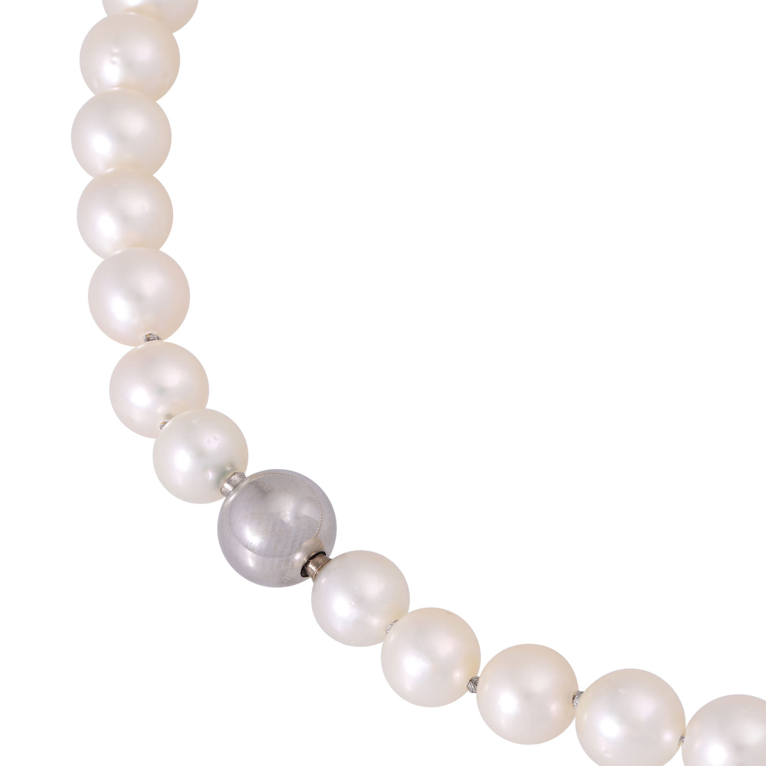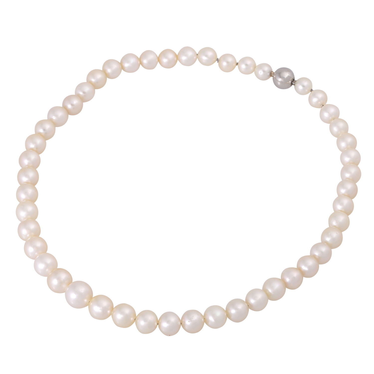 South Sea pearl necklace, 47 white cultured pearls, beautiful lustre, size D: 8-11.4 mm, stainless steel interchangeable clasp, 58.4 g, L: 45 cm, 21st century, mint condition.