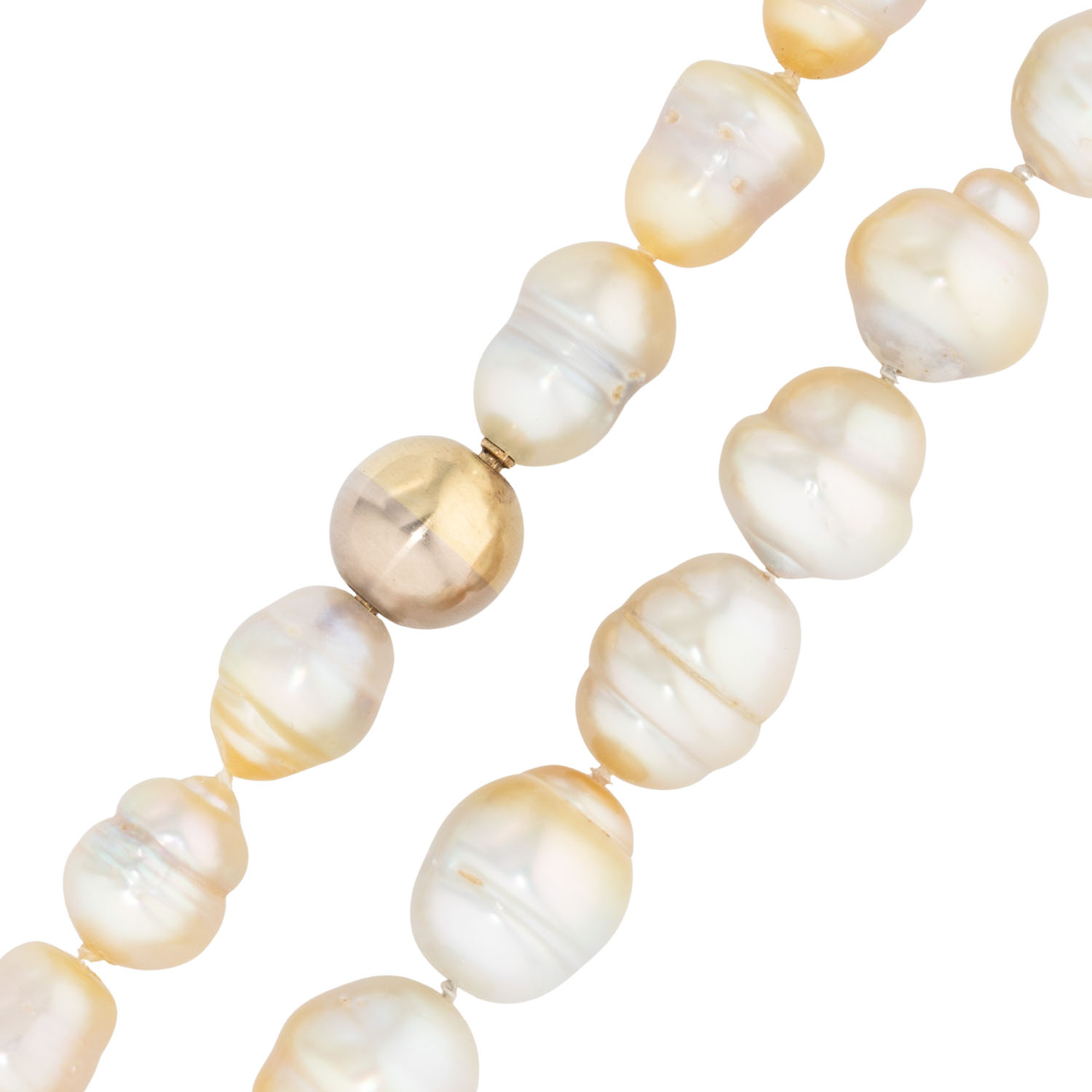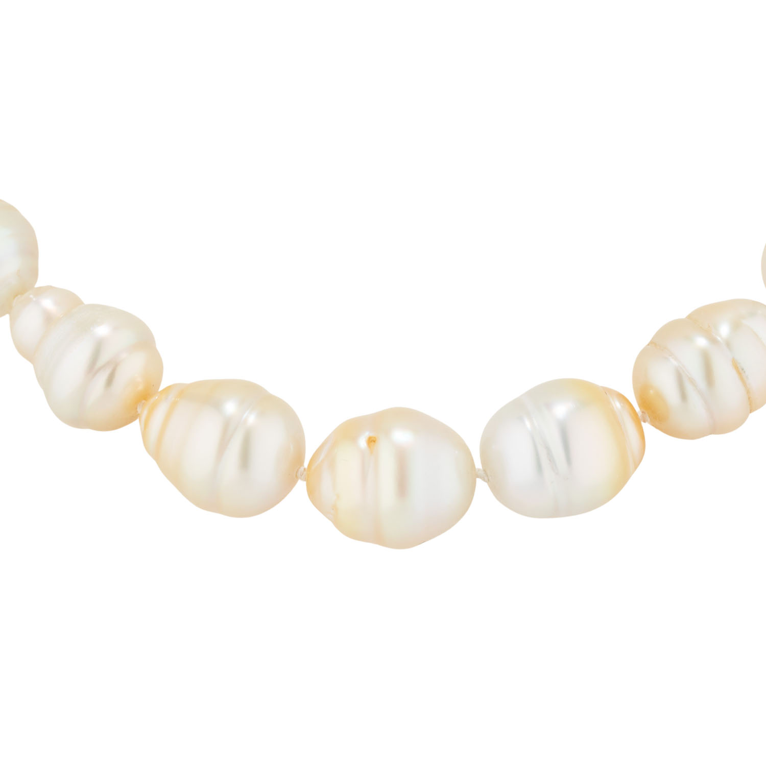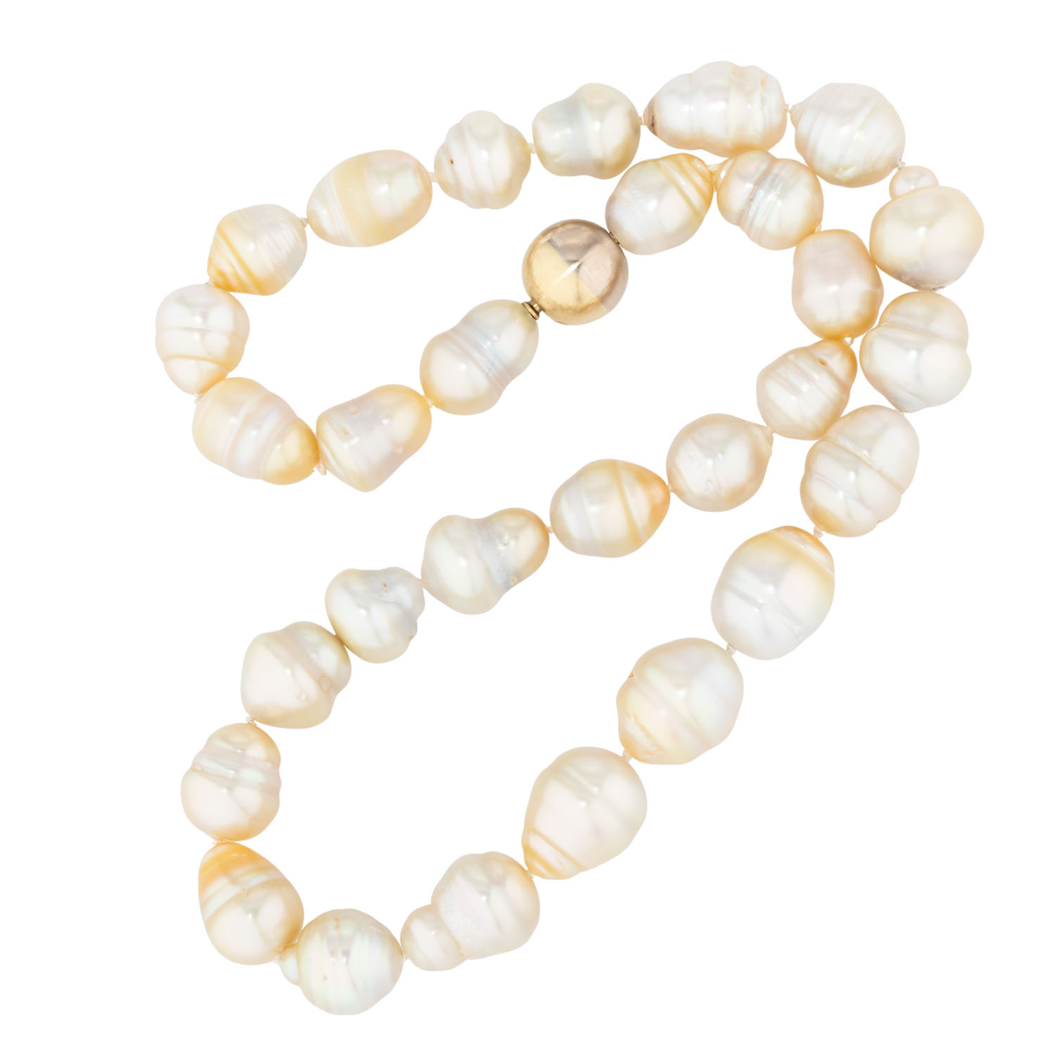 Necklace of South Sea cultured pearls graduating from 9x11 to 11x14 mm, L: 39 cm, baroque drop shape with natural signs of growth, bayonet clasp 14K yellow and white gold, D: 10 mm, late 20th century, signs of wear.